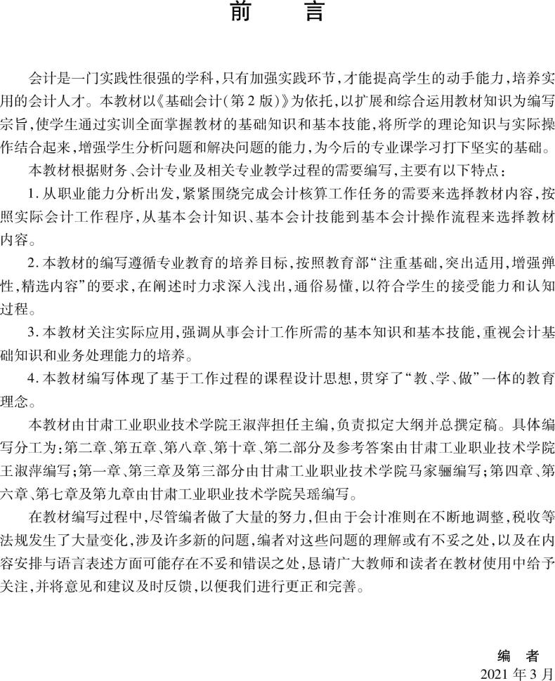 本教材依据中华人民共和国财政部颁布的《企业会计准则——基本准则》《企业会计准则—-应用指南》及国家颁布的新的财经法规和规章制度编写而成。全书包括:第一部分章节训练,主要包括会计概述、会计要素和会计等式,会计科目与账户,会计记账方法、借贷记账法下主要经济业务的账务处理、会计凭证,会计账簿,账务处理程序,财产清查、财务报表共10章,每章均有单项选择题、多项选择题,判断题和技能训练题。第二部分综合实训,根据某单位一个月发生的经济业务进行训练,目的是让学生掌握会计核算的基本的账务处理程序。第三部分模拟训练,包括计算分析题和期末模拟题,通过对计算分析题的操作训练,可以使学生系统地掌握会计核算中相关计算问题;通过期末模拟题的操作训练,可以培养学生的综合操作能力。本教材可作为高职高专院校和其他院校财经商贸类专业学生学习会计的基础教材,亦可供从事财务、会计及其他经济管理工作的人员自学、培训使用。