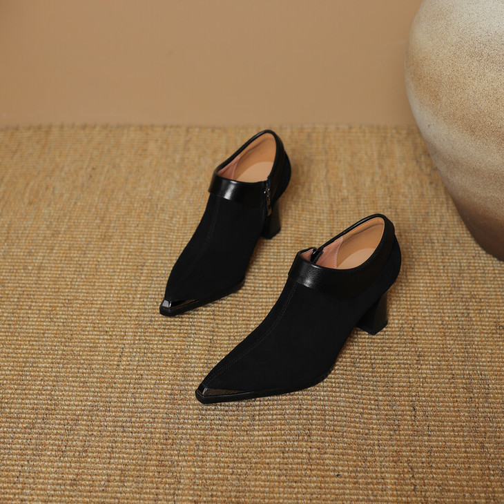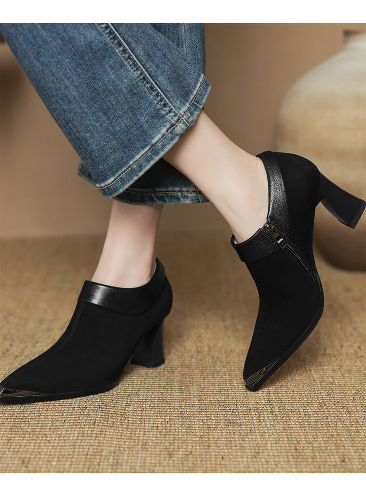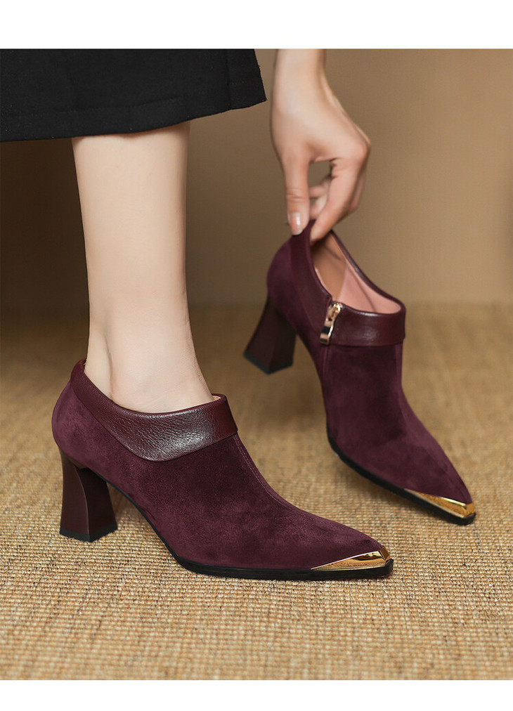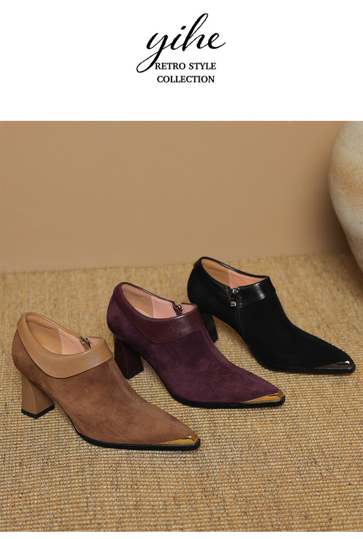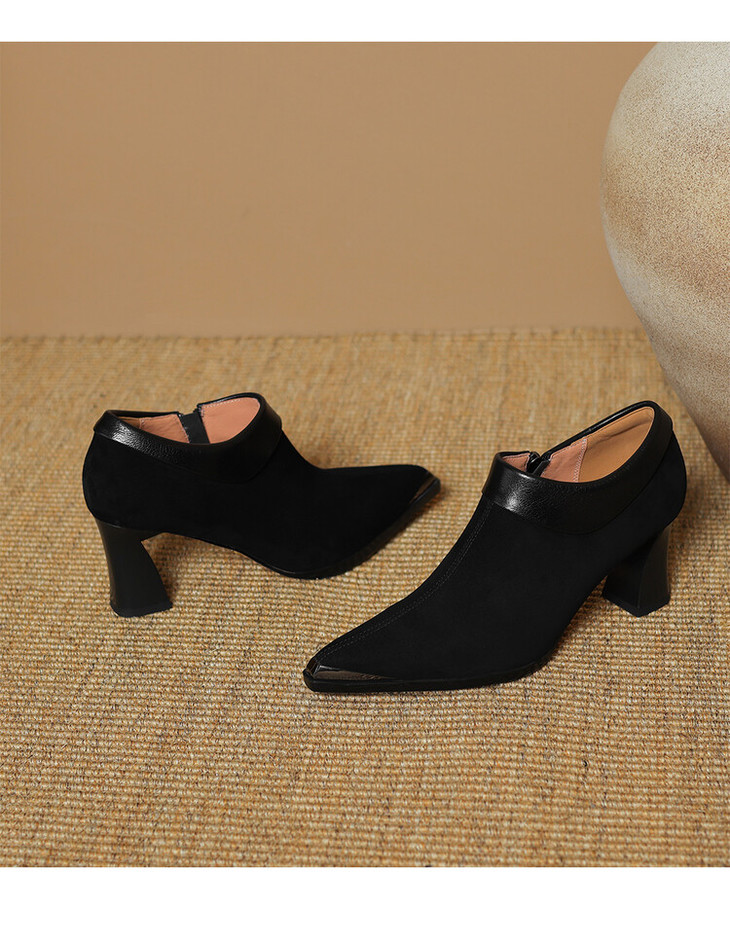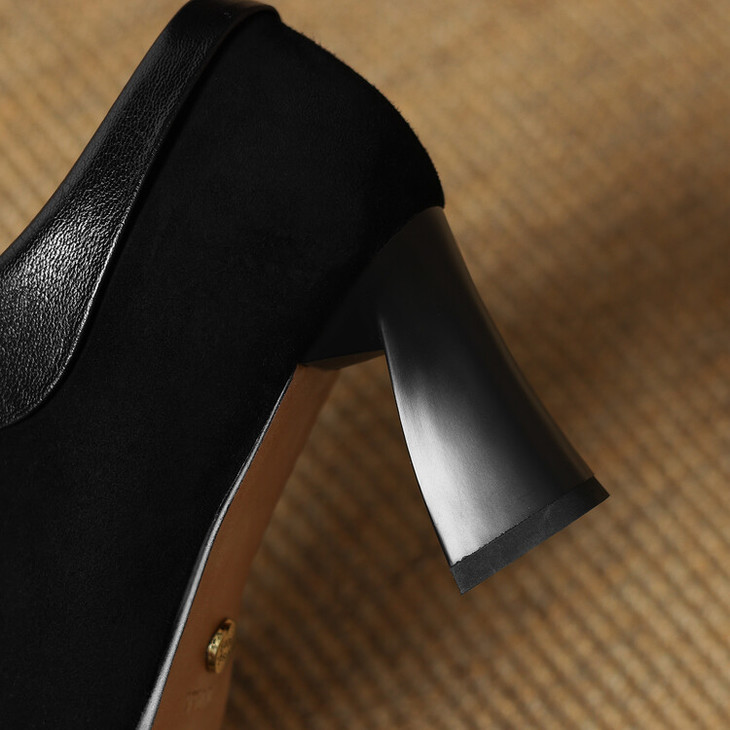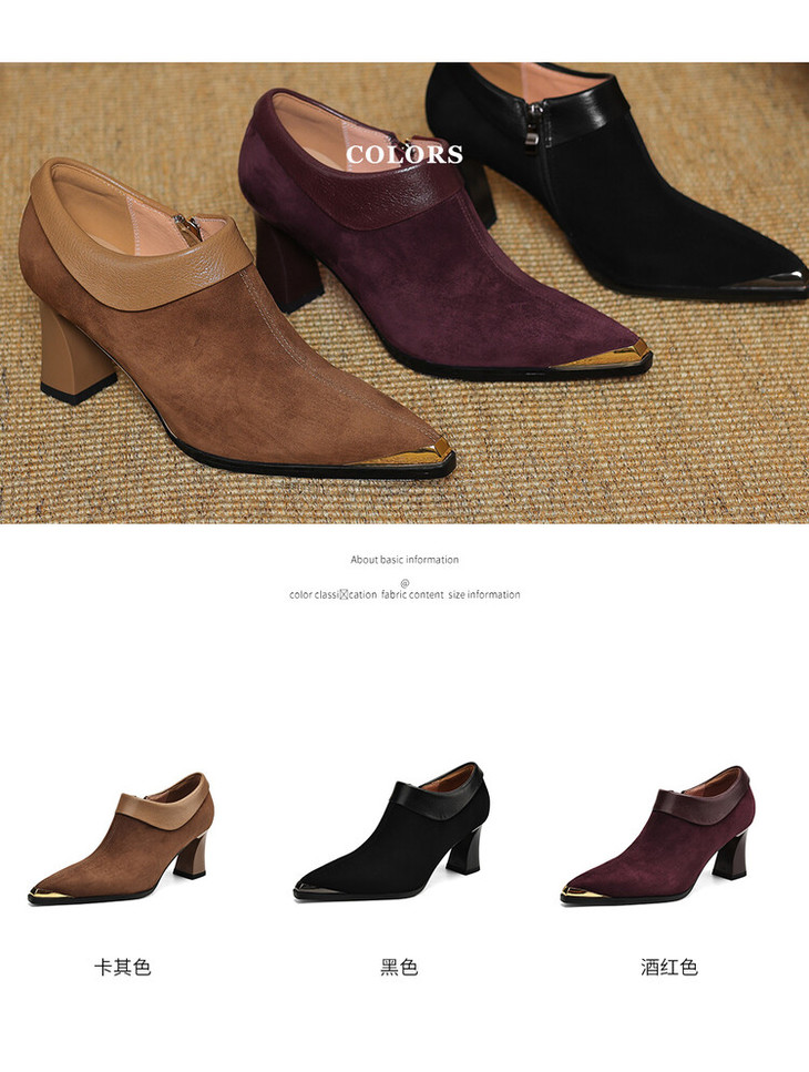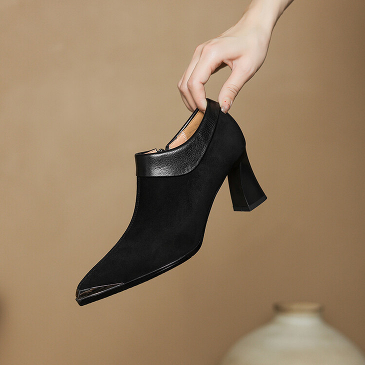 【预售5天】小方头女高跟鞋粗跟头层磨砂羊皮铁头侧拉链浅口女单鞋LD&6961