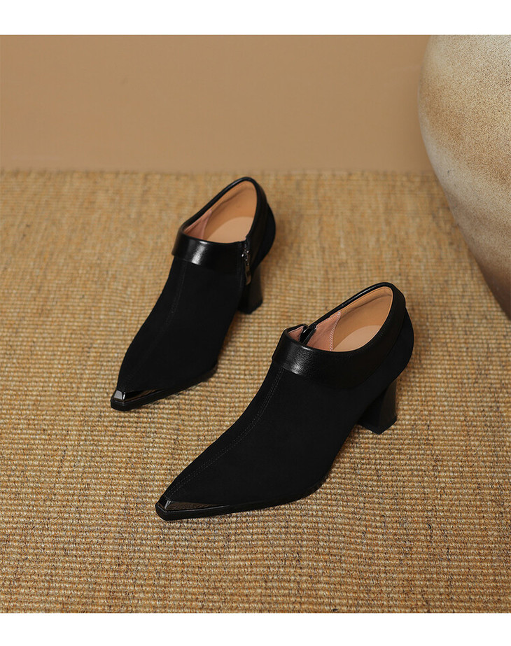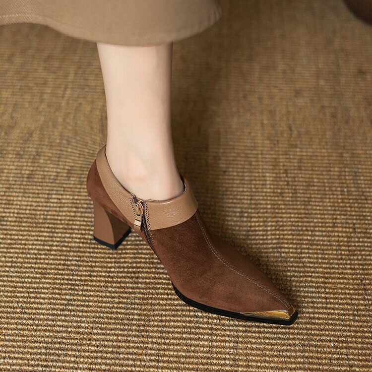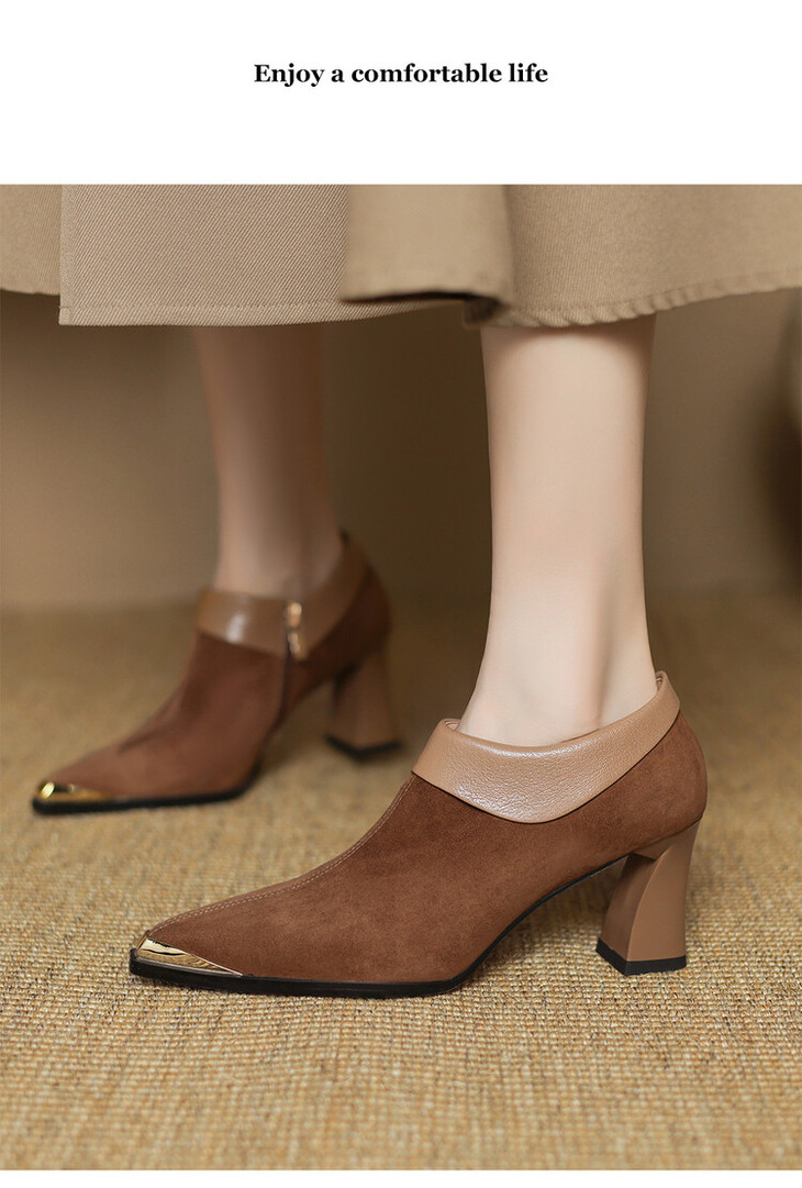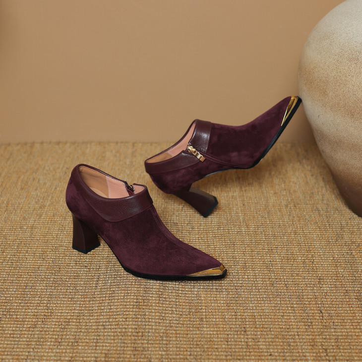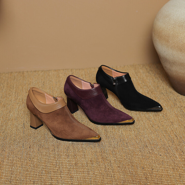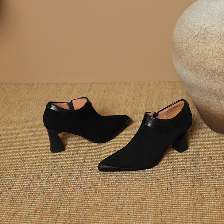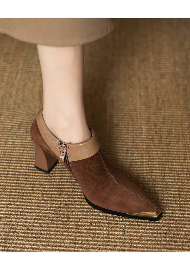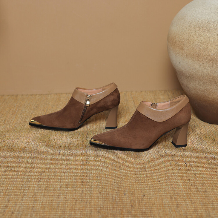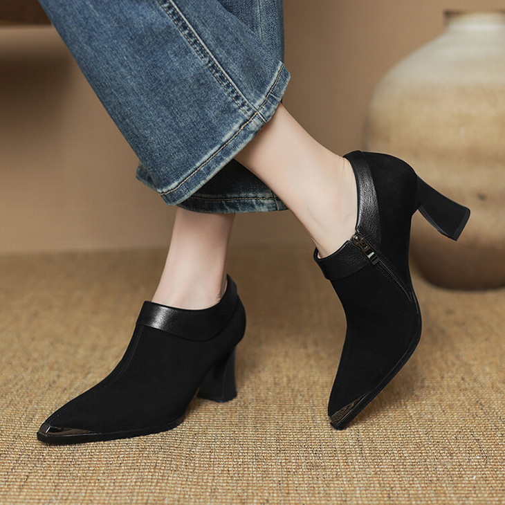 【预售5天】小方头女高跟鞋粗跟头层磨砂羊皮铁头侧拉链浅口女单鞋LD&6961