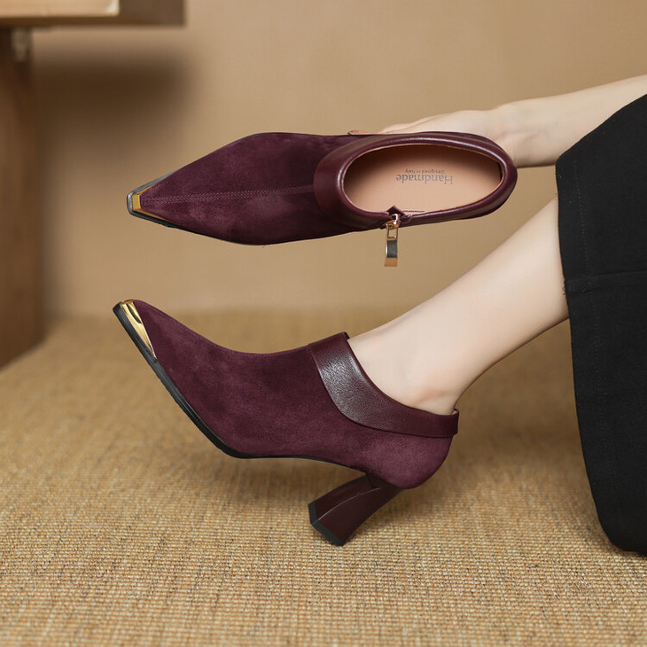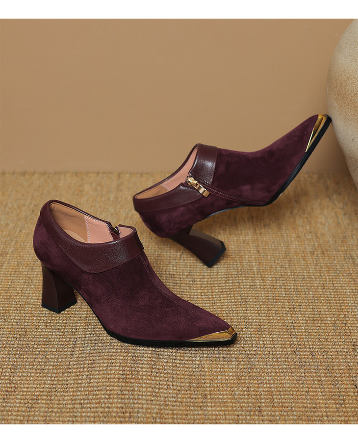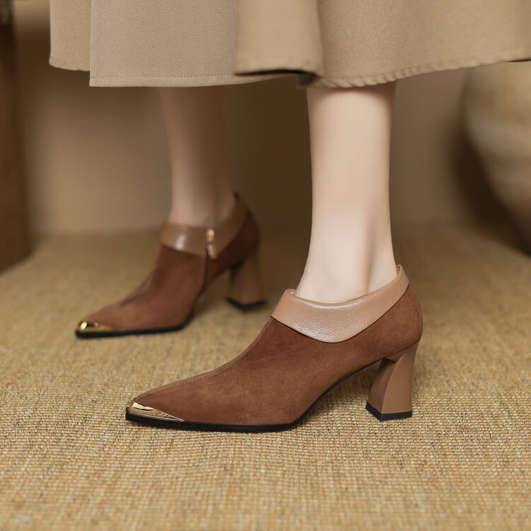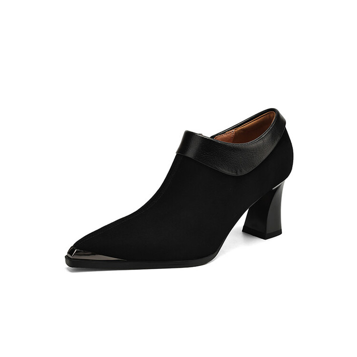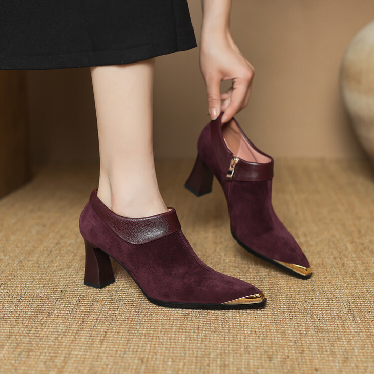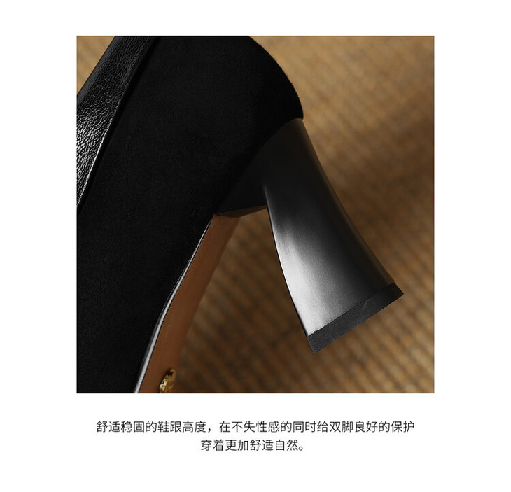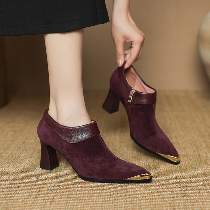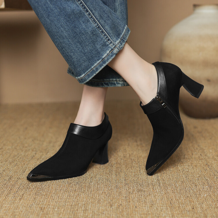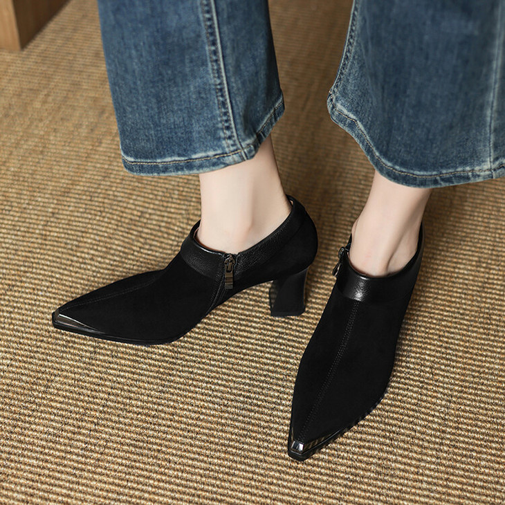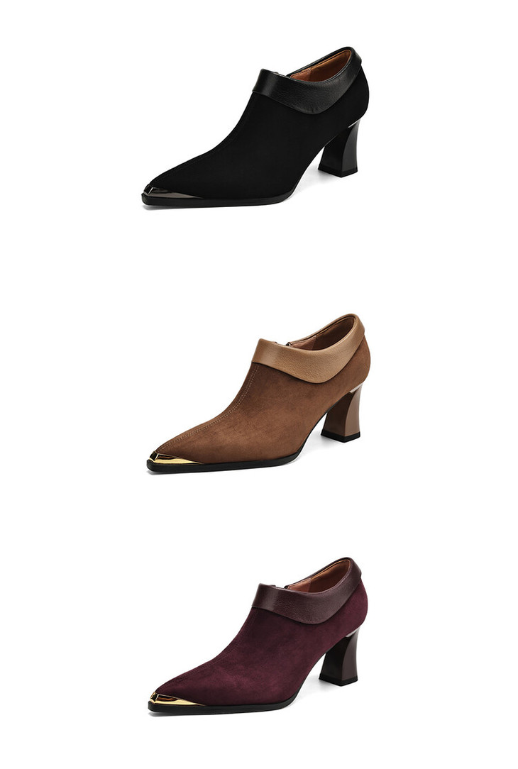 【预售5天】小方头女高跟鞋粗跟头层磨砂羊皮铁头侧拉链浅口女单鞋LD&6961