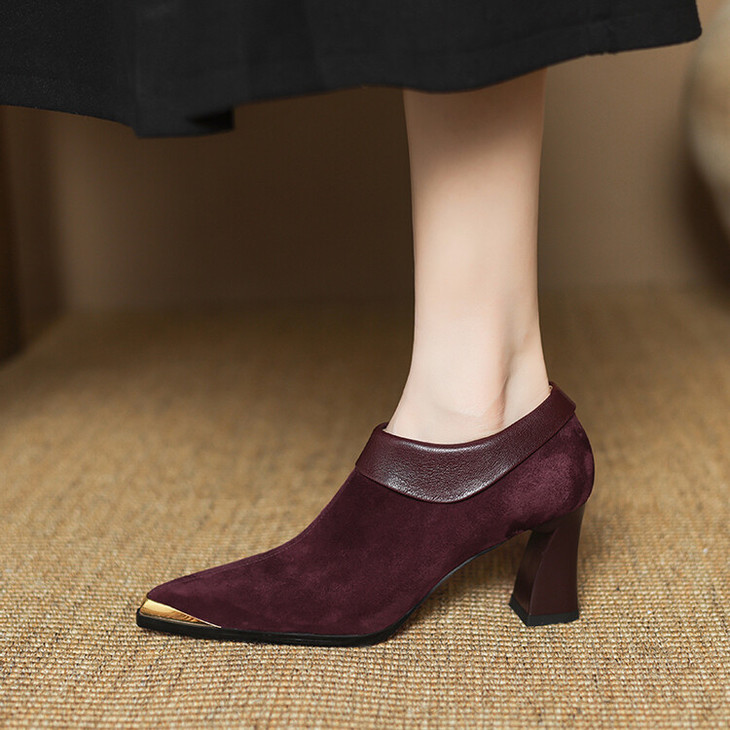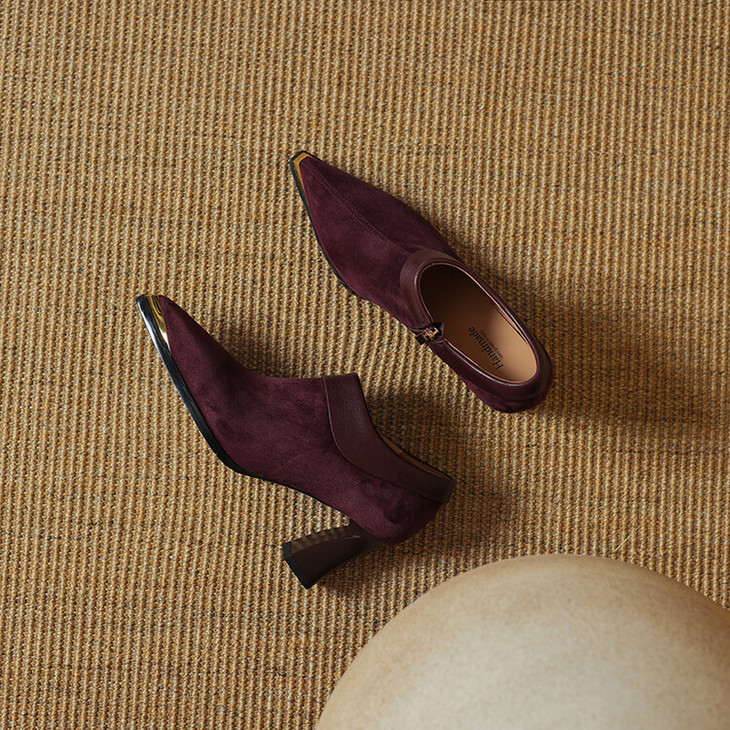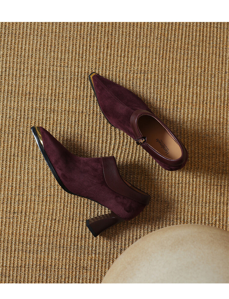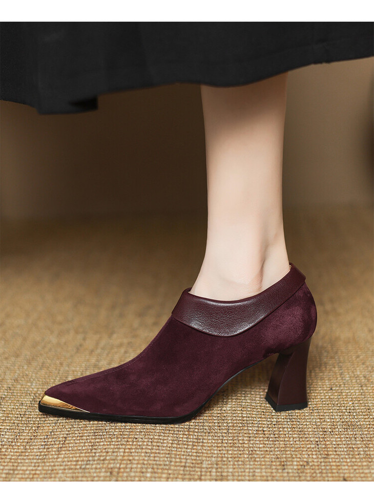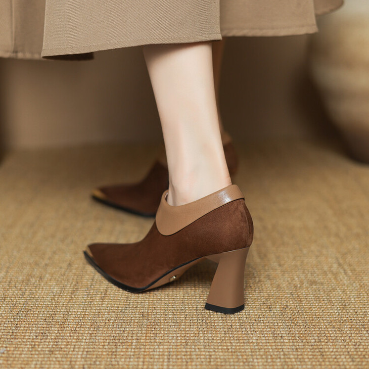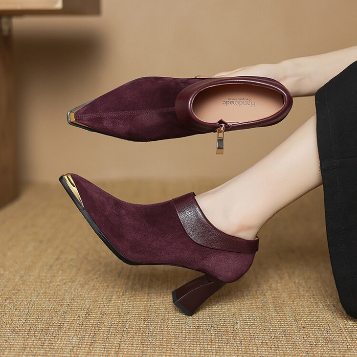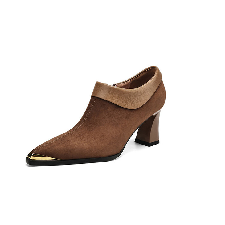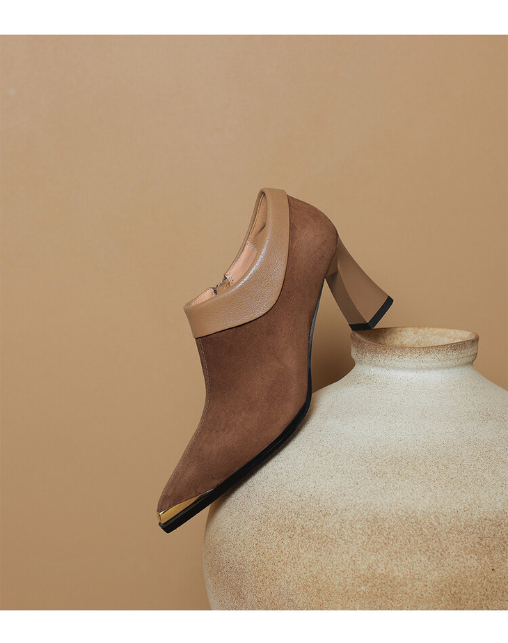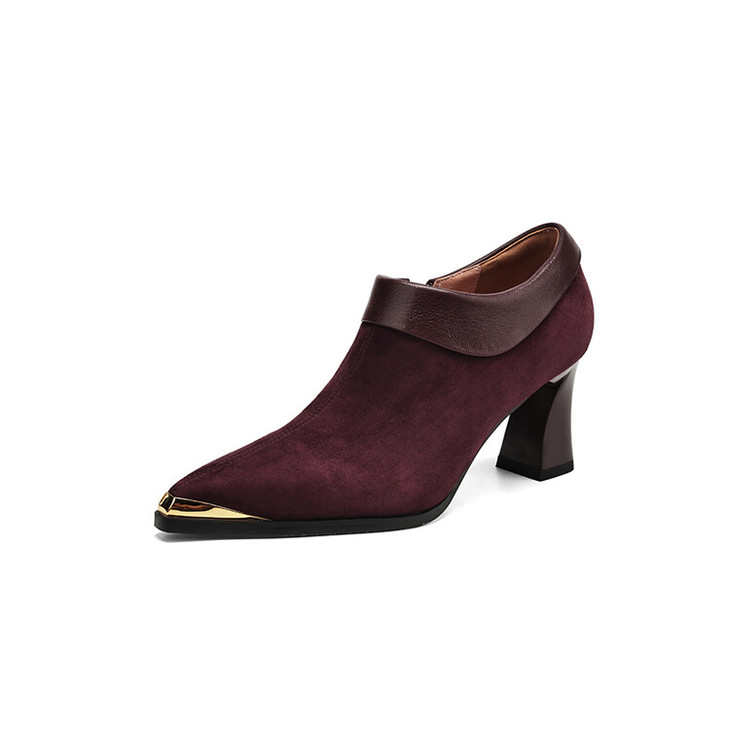 【预售5天】小方头女高跟鞋粗跟头层磨砂羊皮铁头侧拉链浅口女单鞋LD&6961