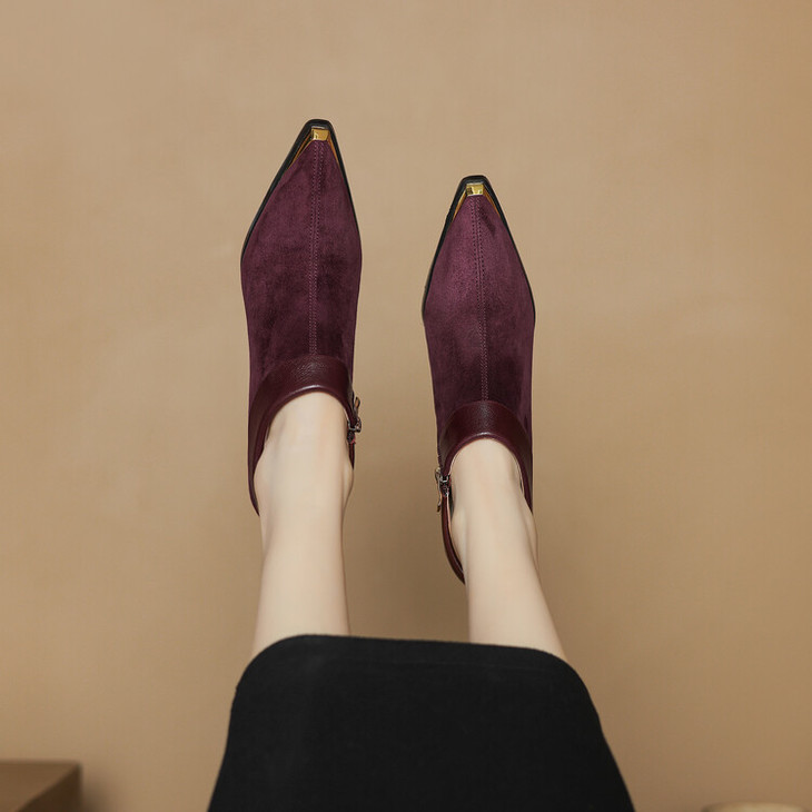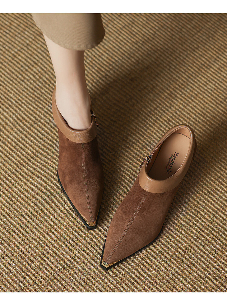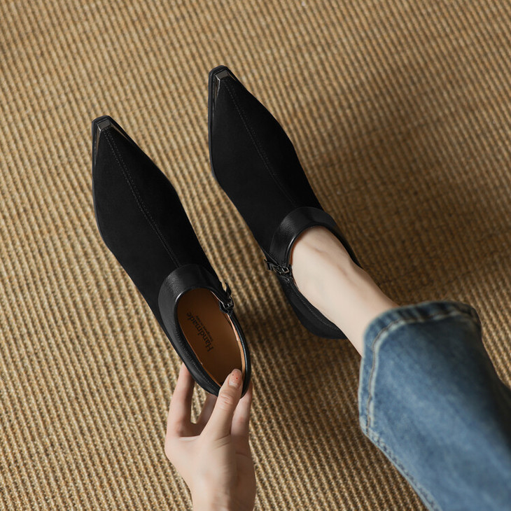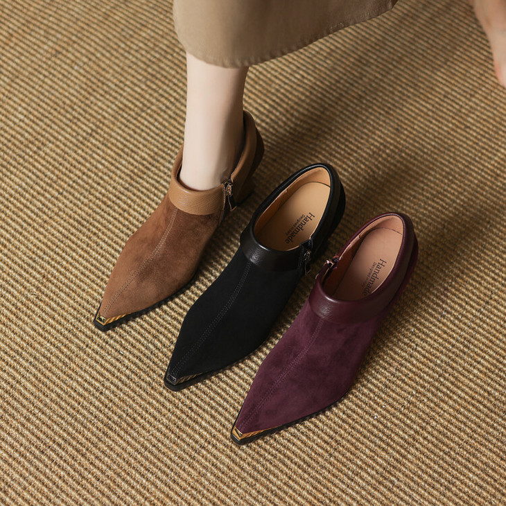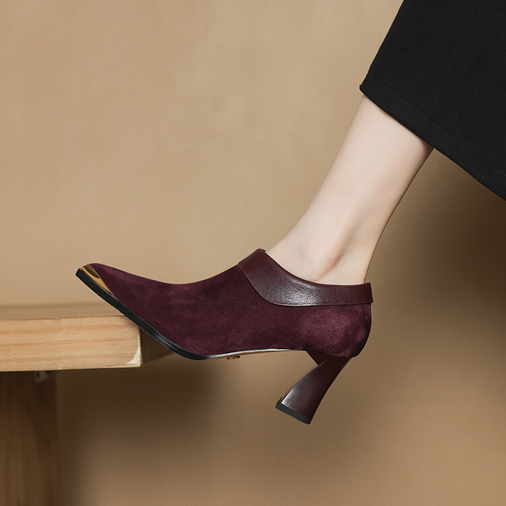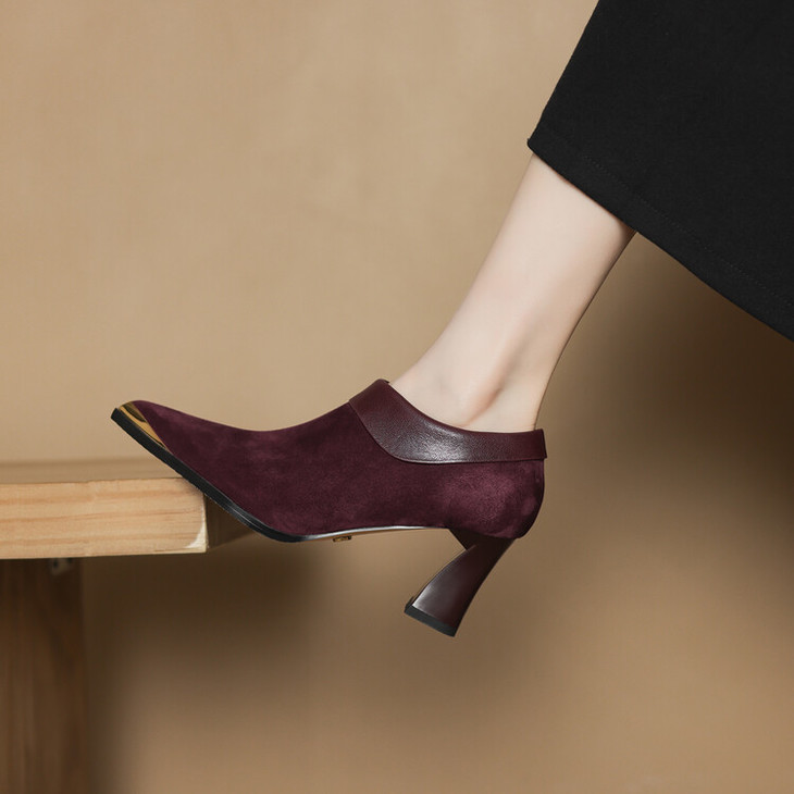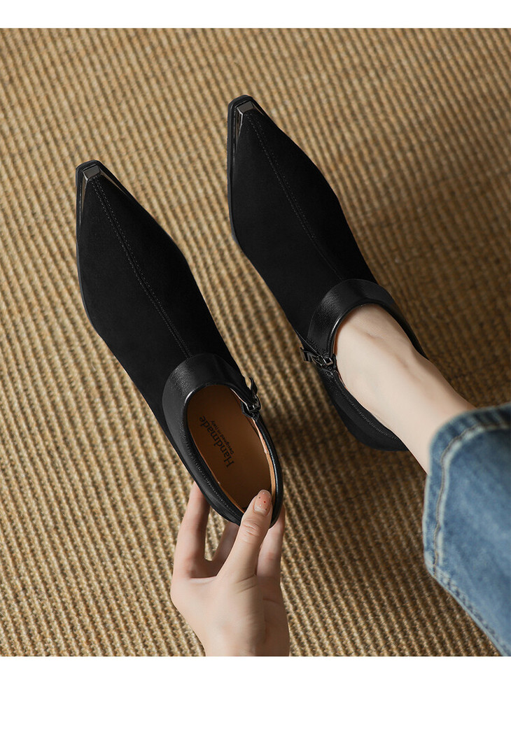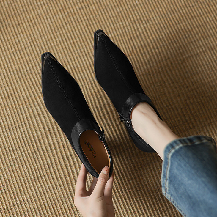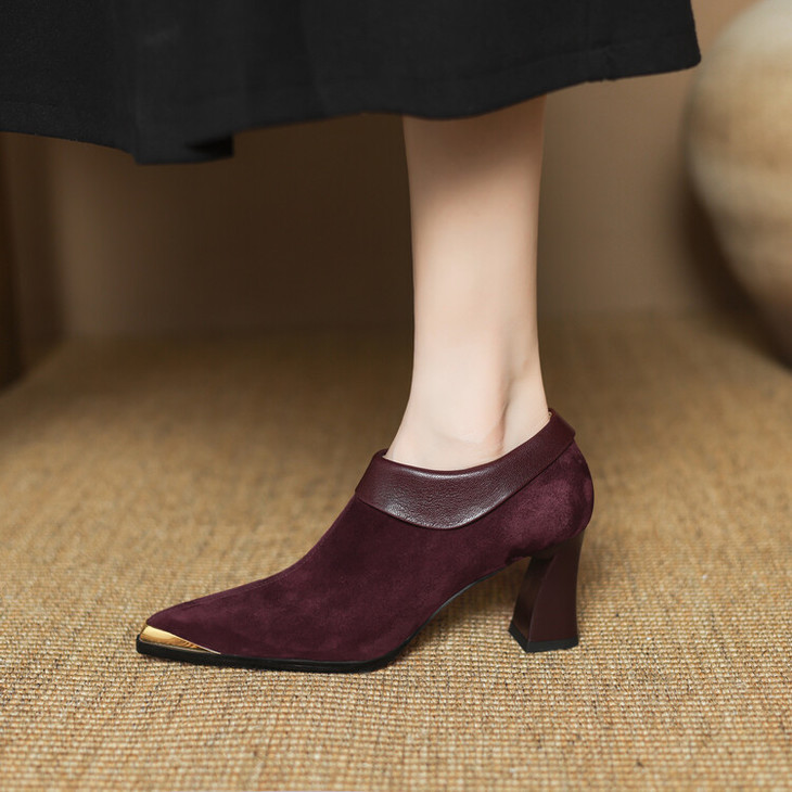 【预售5天】小方头女高跟鞋粗跟头层磨砂羊皮铁头侧拉链浅口女单鞋LD&6961