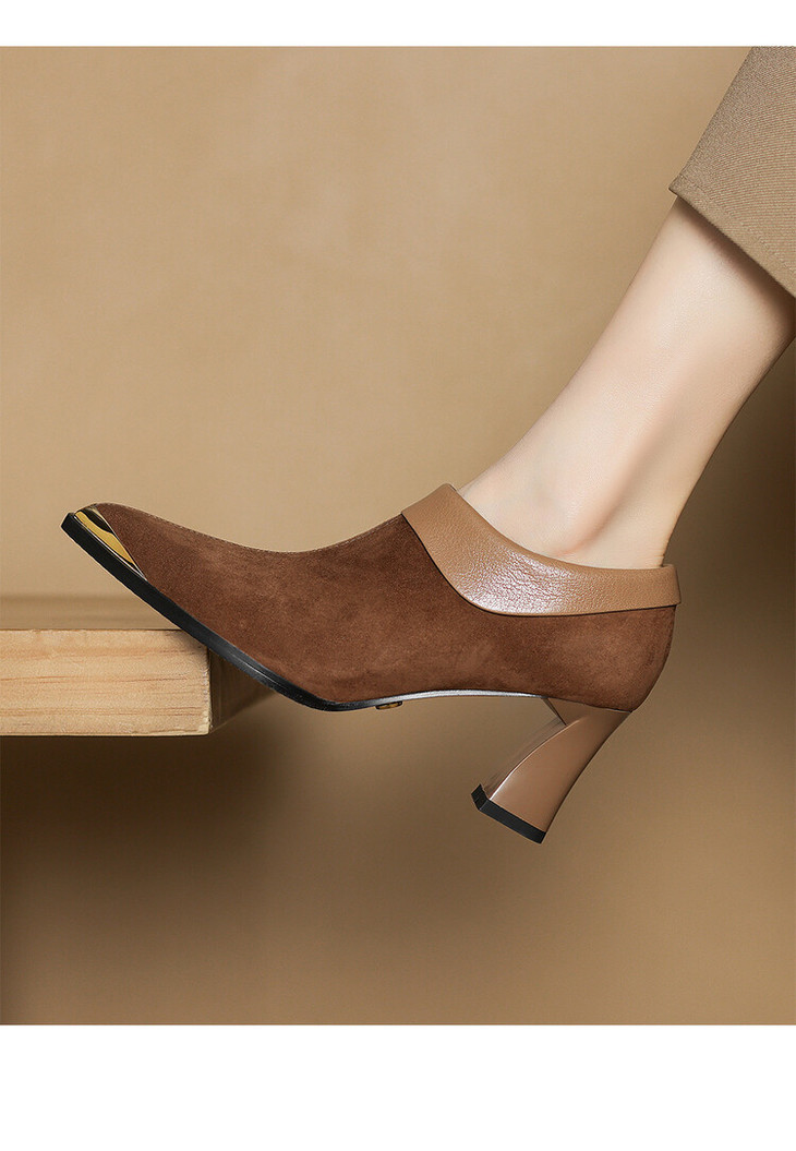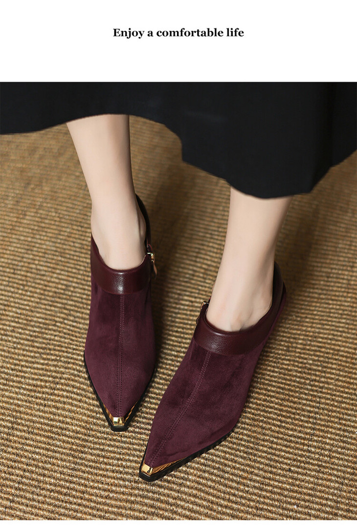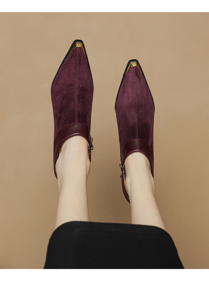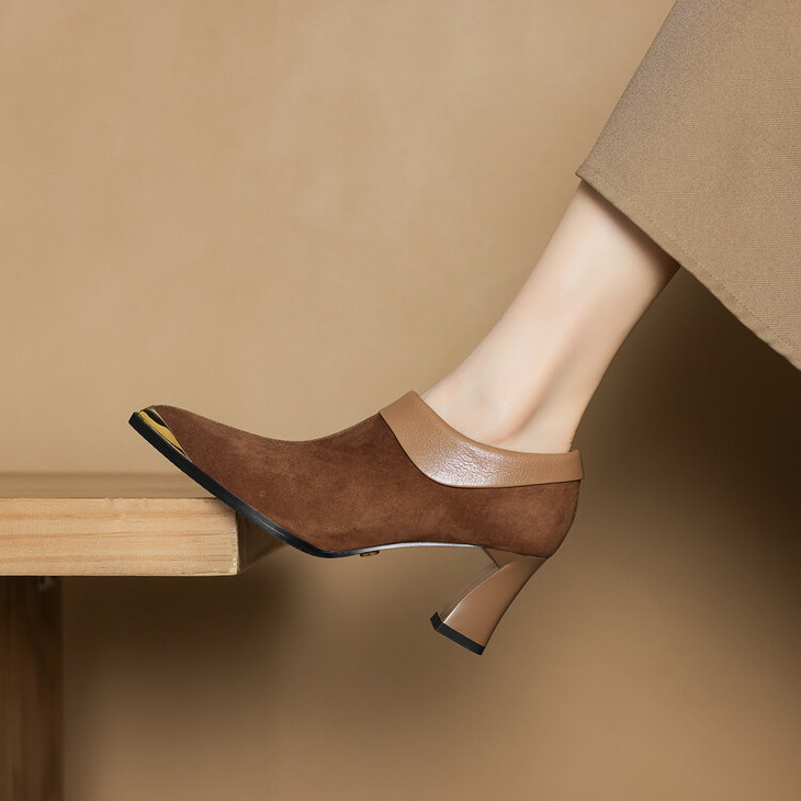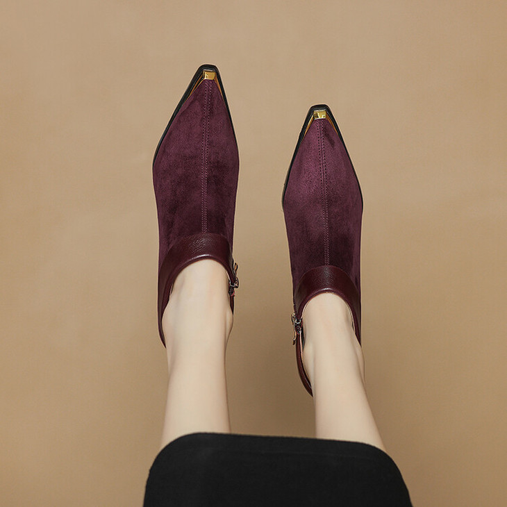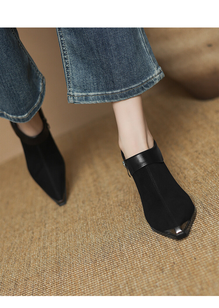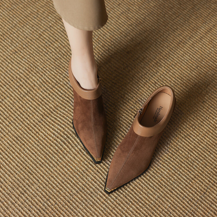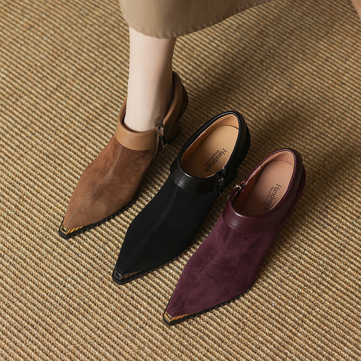 【预售5天】小方头女高跟鞋粗跟头层磨砂羊皮铁头侧拉链浅口女单鞋LD&6961