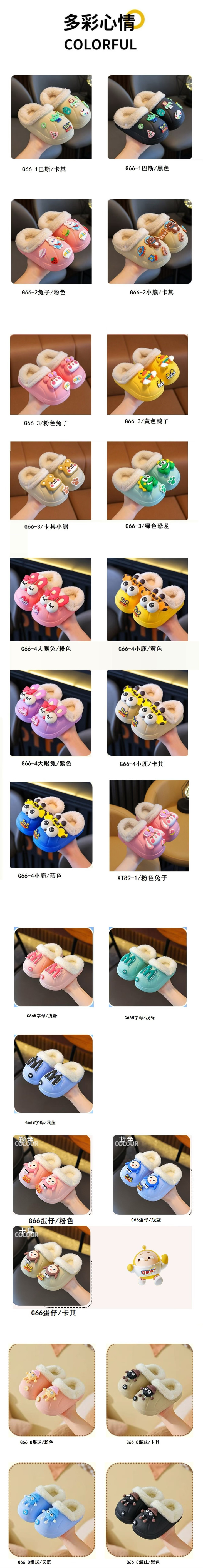 巴斯小兔卡通儿童棉拖鞋合集 【规格】1双 【可选颜色】G66-1巴斯/黑色;G66-1巴斯/卡其; G66-2兔子/粉色;G66-2小熊/卡其; G66-3/粉色兔子;G66-3/黄色鸭子;G66-3/卡其小熊;G66-3/绿色恐龙; G66-4大眼兔/粉色;G66-4大眼兔/紫色;G66-4小鹿/黄色;G66-4小鹿/卡其;G66-4小鹿/蓝色; XT89-1/粉色兔子 新增:G66蛋仔/粉色、G66蛋仔/卡其、G66蛋仔/浅蓝 G66-8煤球/粉色、G66-8煤球/黑色、G66-8煤球/卡其、G66-8煤球/天蓝 G66M字母/浅粉、G66M字母/浅蓝、G66M字母/浅绿 【可选尺码】22-37码( 偏小一码 按照宝宝实际的脚长+1cm选码,脚胖脚宽+1.5cm购买哦~) 【跟高】3厘米左右 【材质】pvc 【发货地】 广东湛江 【合作快递】 邮政、韵达 【发货时效】 3-5天 【偏远地区】 新疆、西藏、青海不发,其他地区包邮 【退换货标准】 1.保证产品和包装完好,不影响二次销售,支持7天无理由退换货。(有穿着痕迹不给退款,请晾解) 2.签收后第一时间验货。洗涤、使用后不处理售后问题。若有问题,麻烦【24小时】内拍照,问题单和快递单【合影拍照】发给客服,单号必须【清晰可见】,逾期不处理 3、每双鞋子都有注塑口,介意慎拍! 4、无理由退换货、拦截、拒收需扣发出运费3元/单 温馨提示: 尺寸为人工测量,可能存在误差,灯光滤镜原因会有少许色差,以收到实物为准介意慎拍!