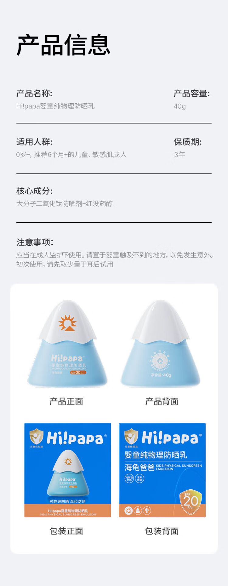 海龟爸爸 婴童纯物理防晒乳40g SPF20 PA+