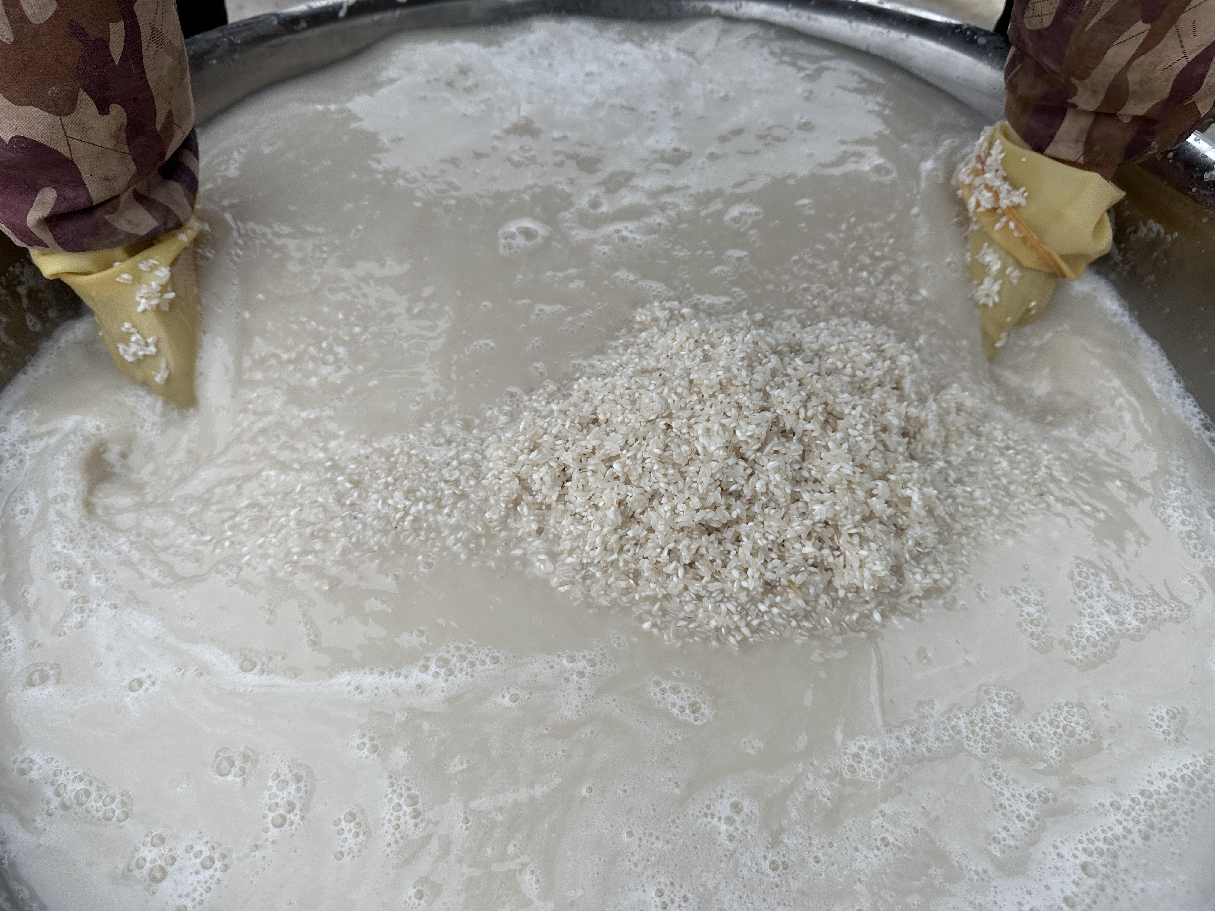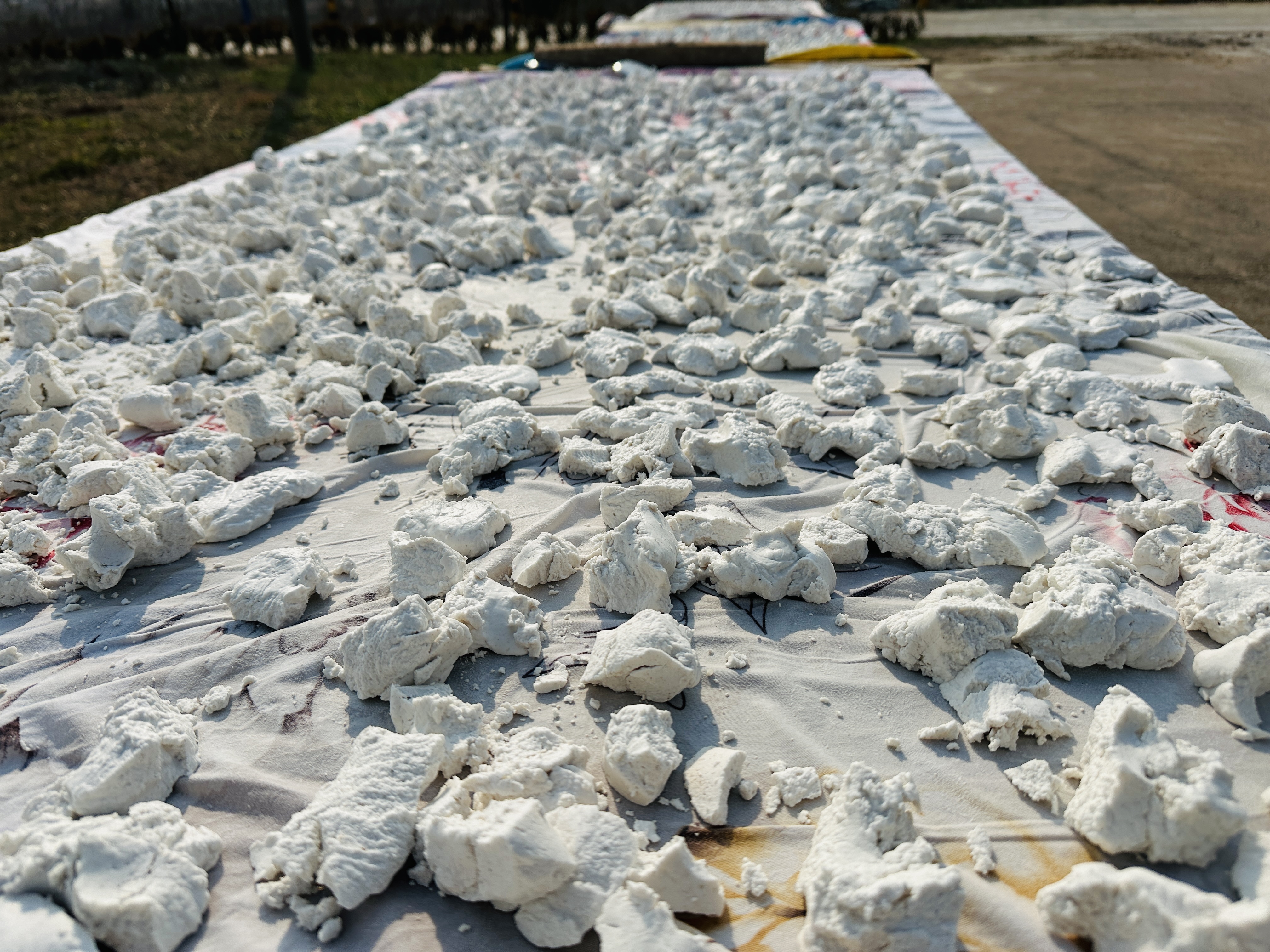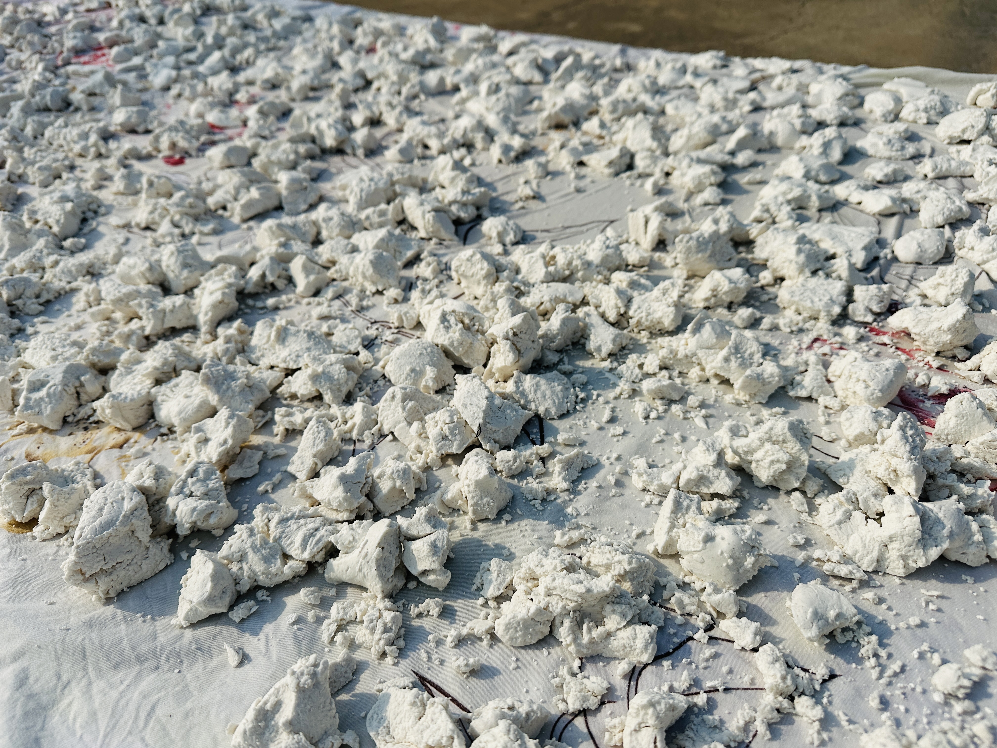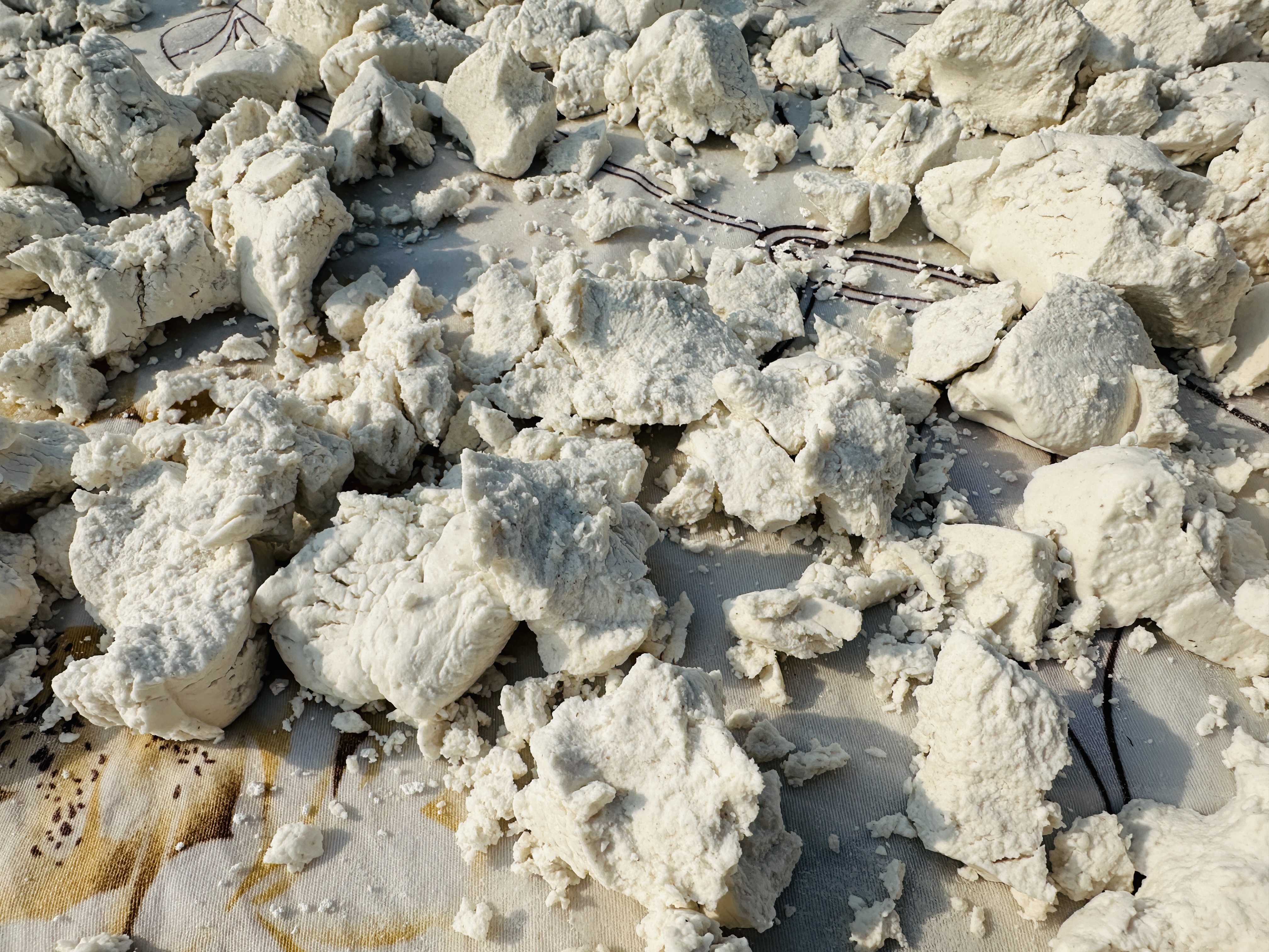3、米浆用专用的袋子装好,净置一夜,让多余的水分沥干,或者可以用吧草木灰放在袋子外面吸水,加快干燥的速度。下面是干燥后的状态。