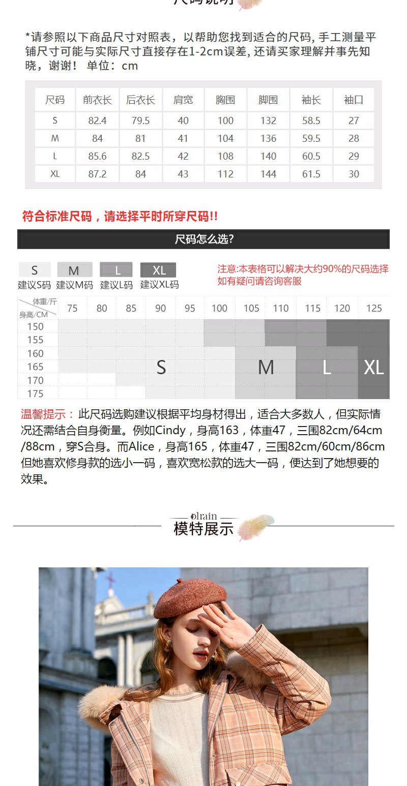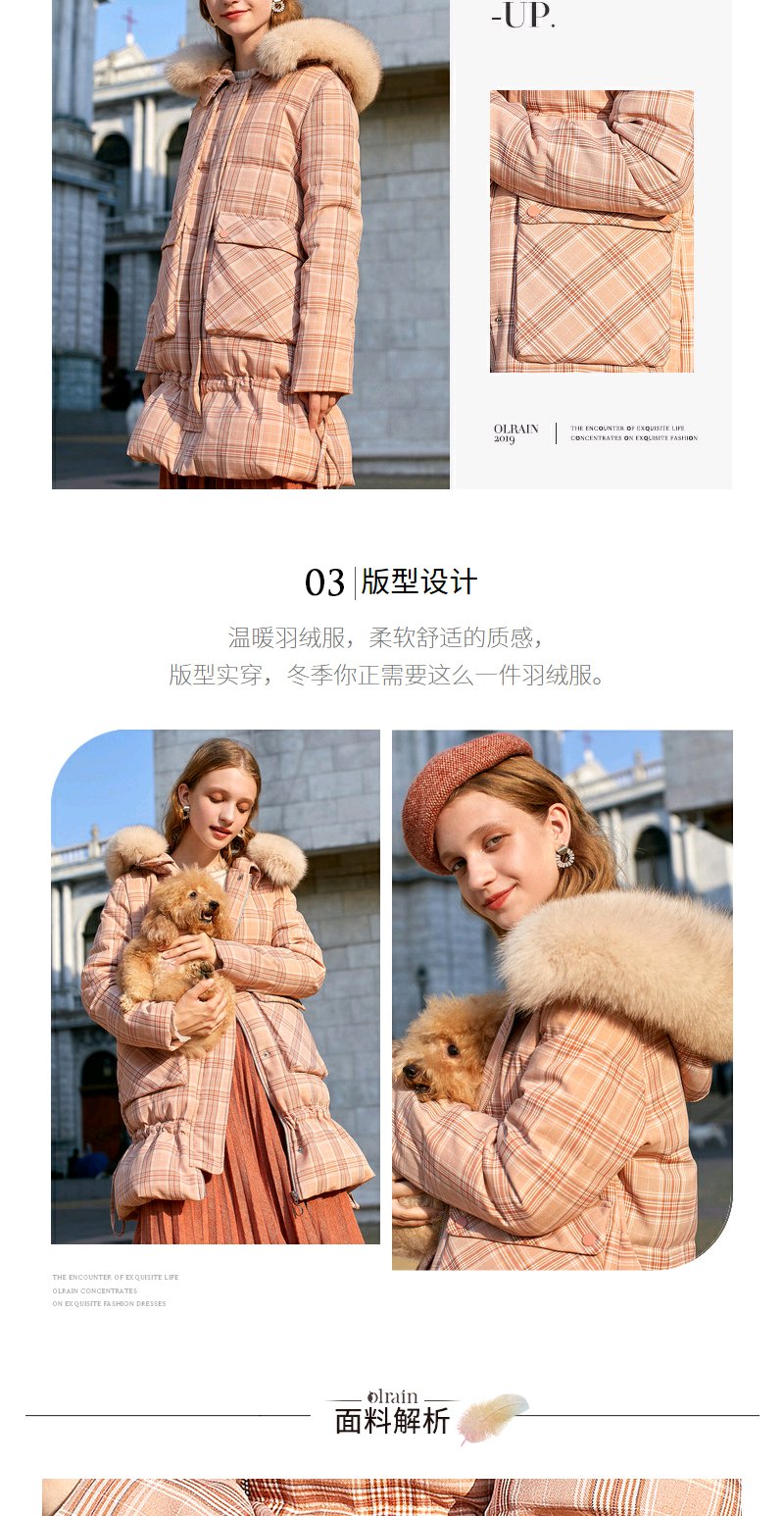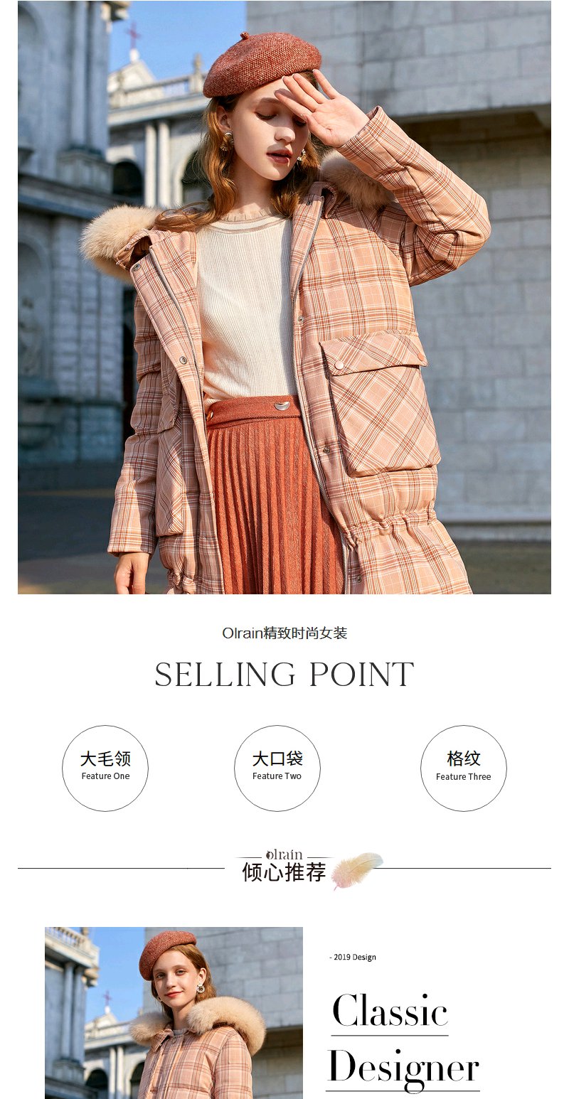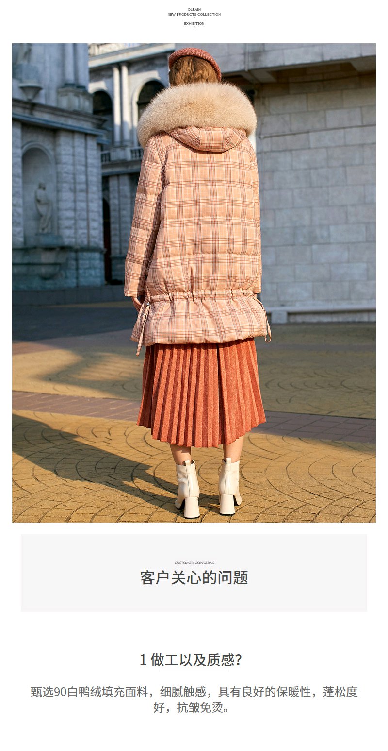 欧芮儿秋冬新款大毛领格子羽绒服女中长款外套