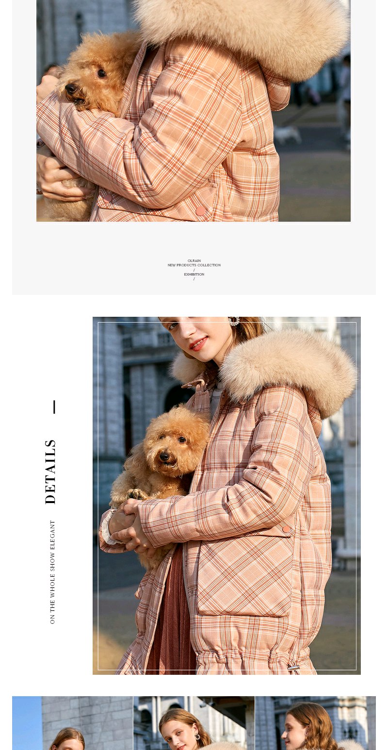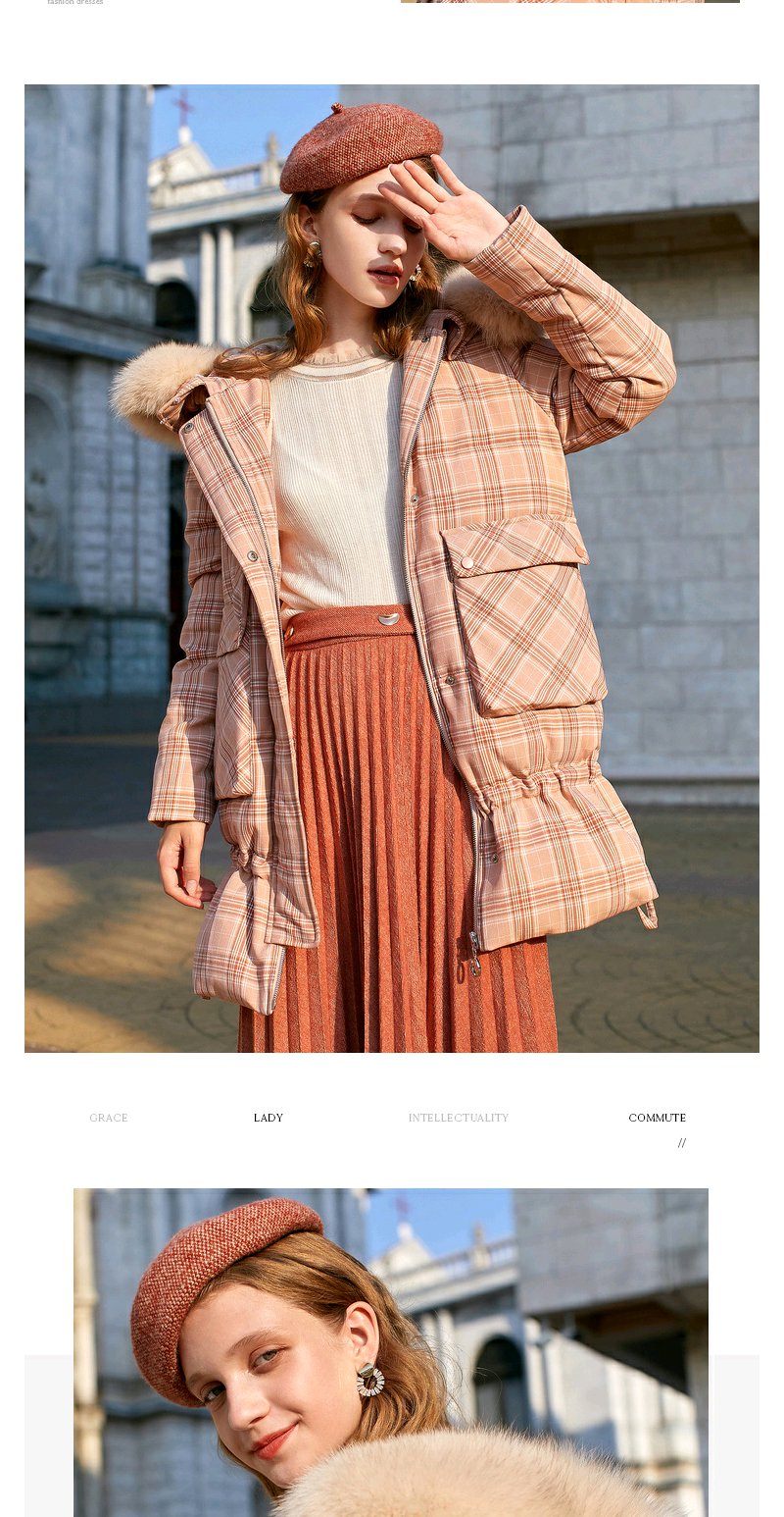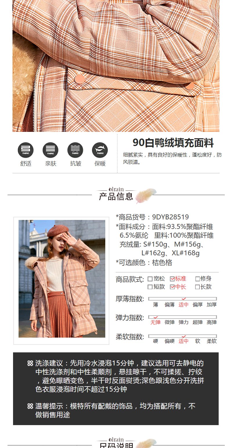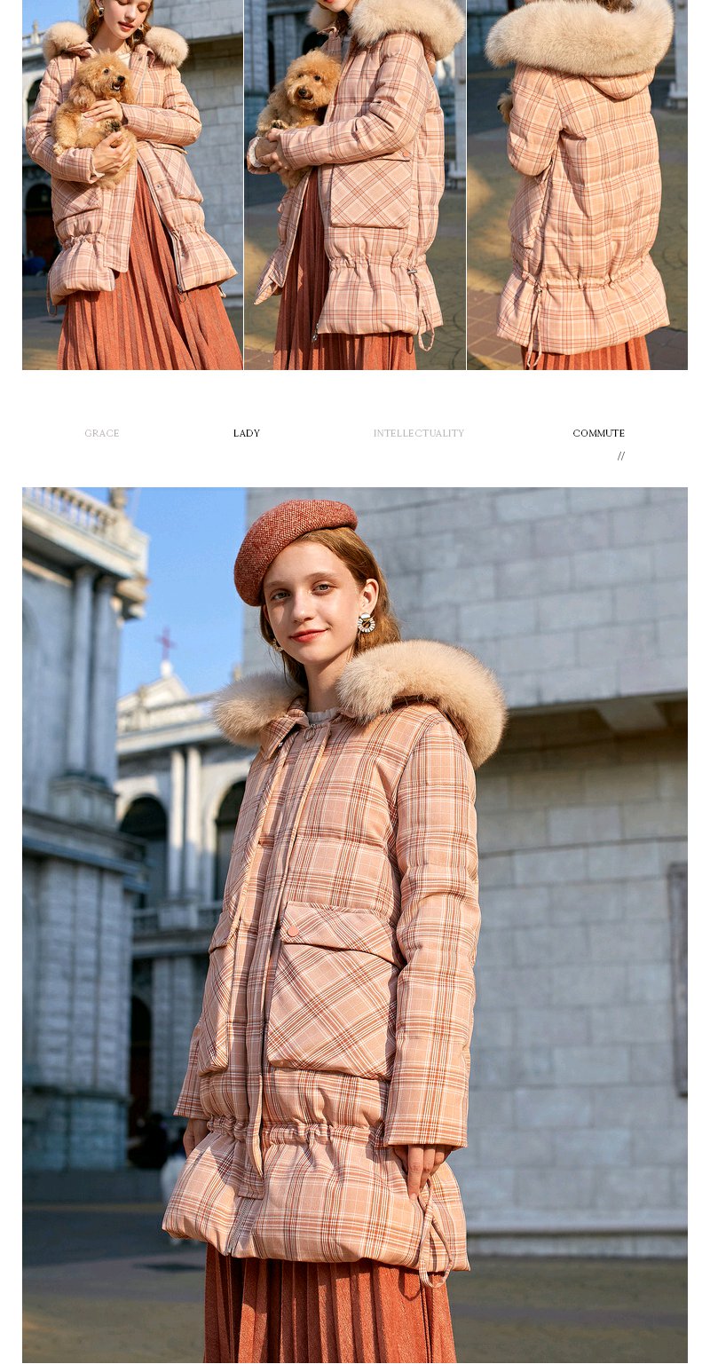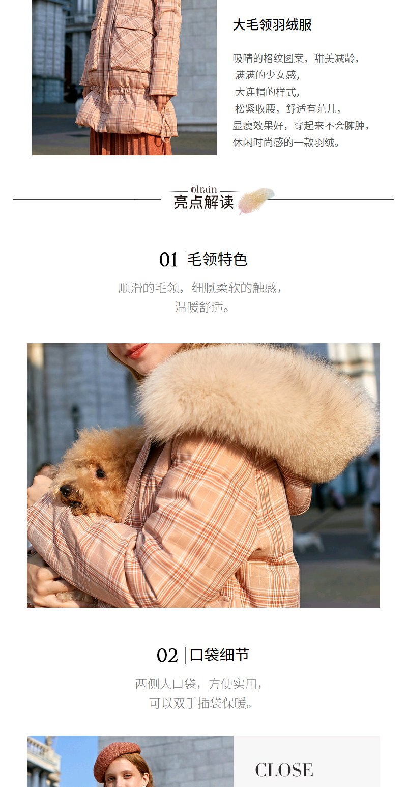 欧芮儿秋冬新款大毛领格子羽绒服女中长款外套