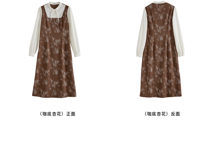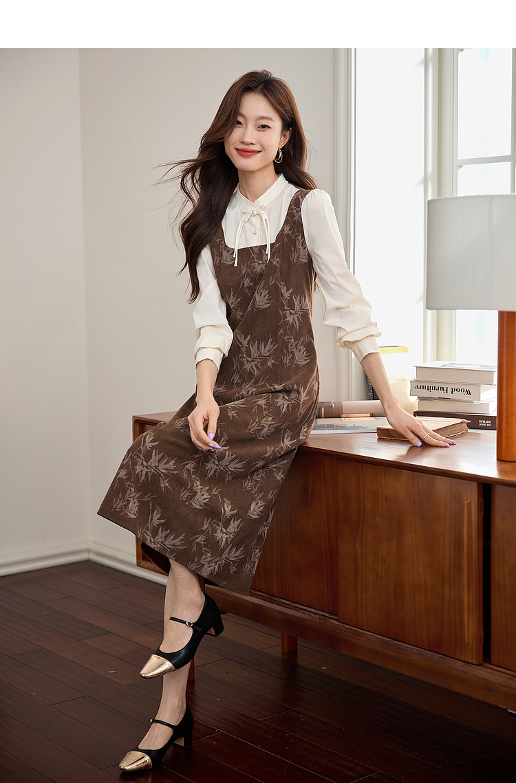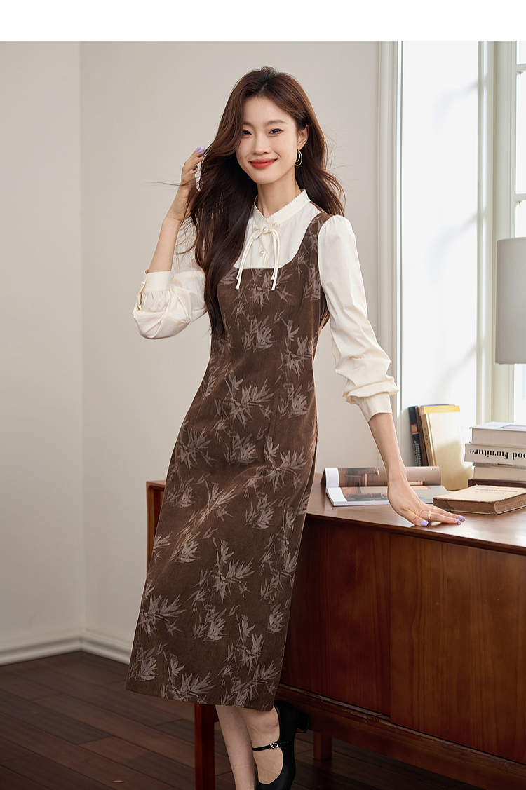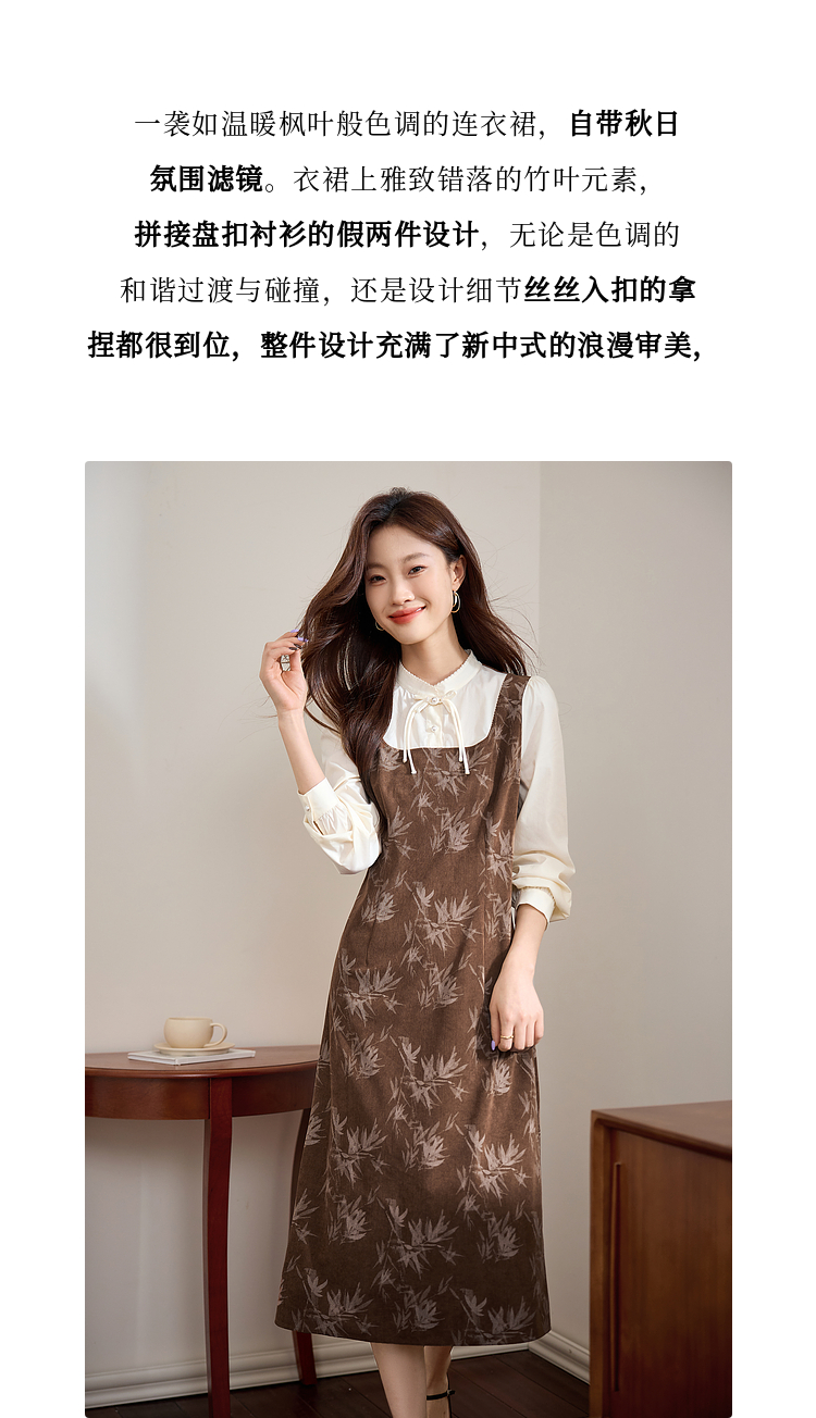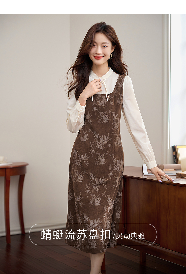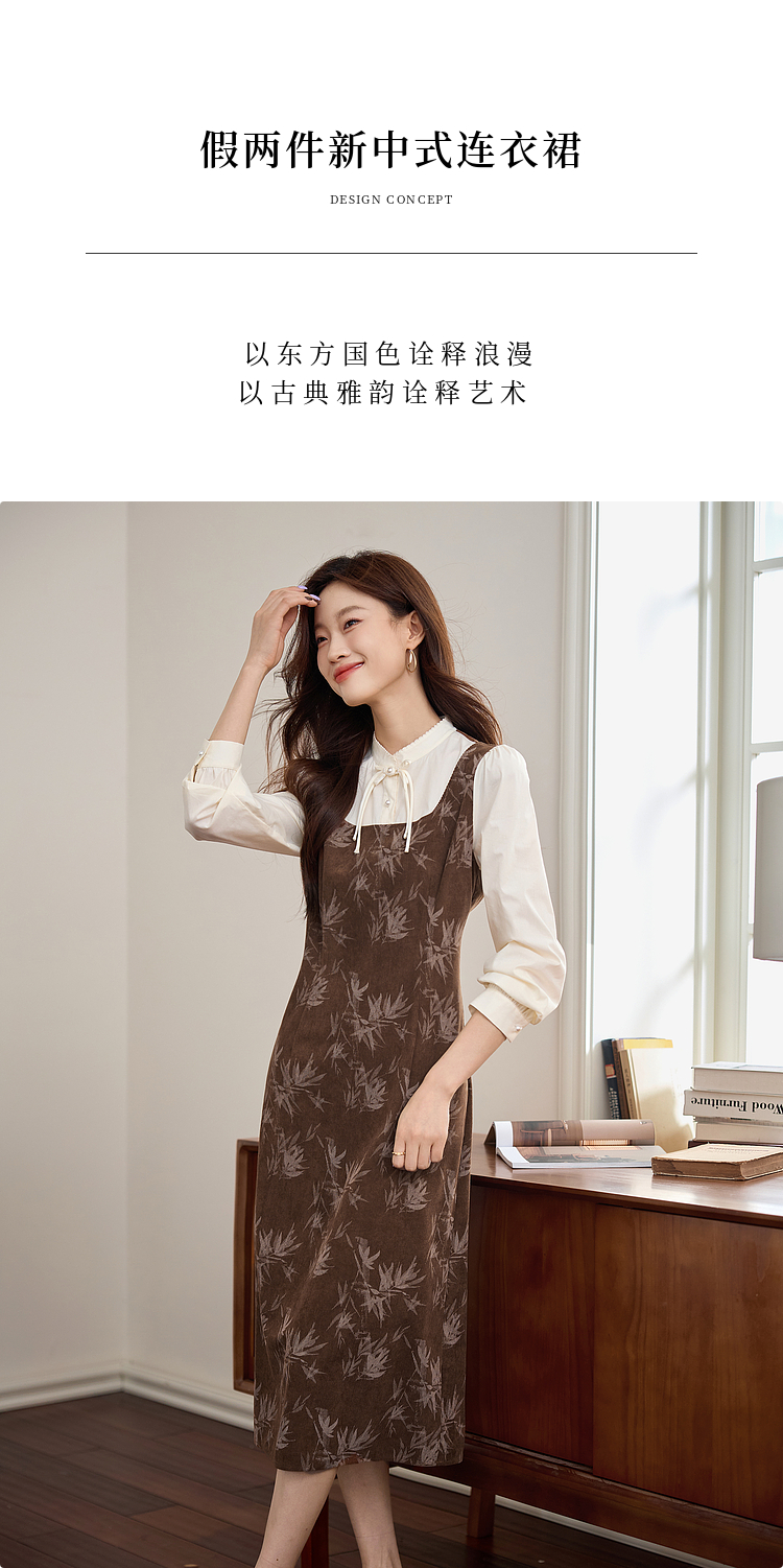 【五折购】熙世界新中式长袖拼接复古印花灯芯绒假两件连衣裙2025秋季新款