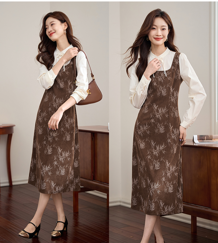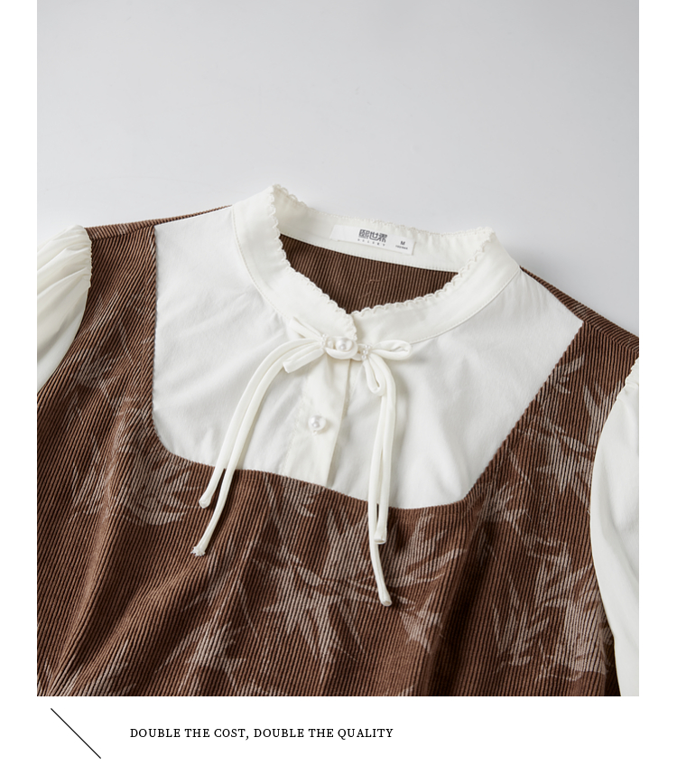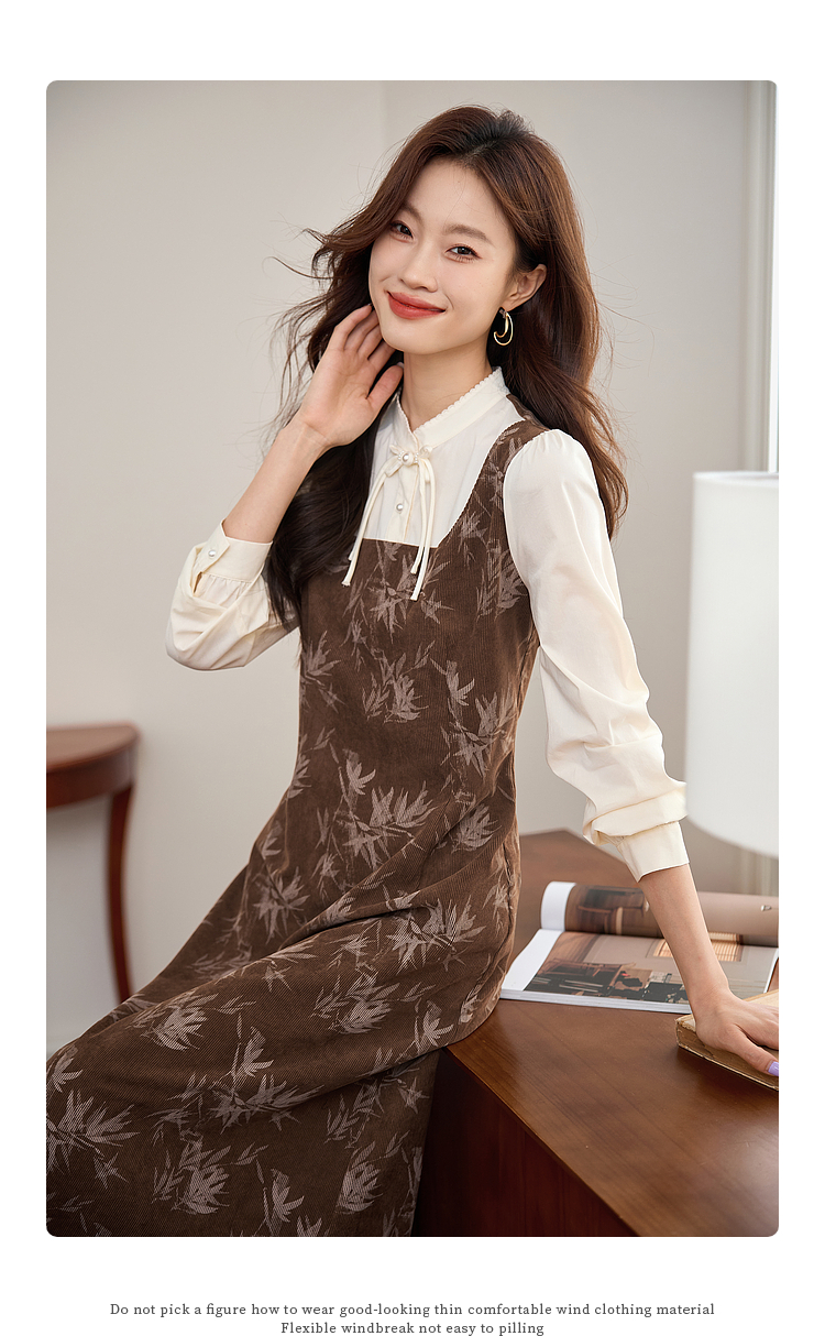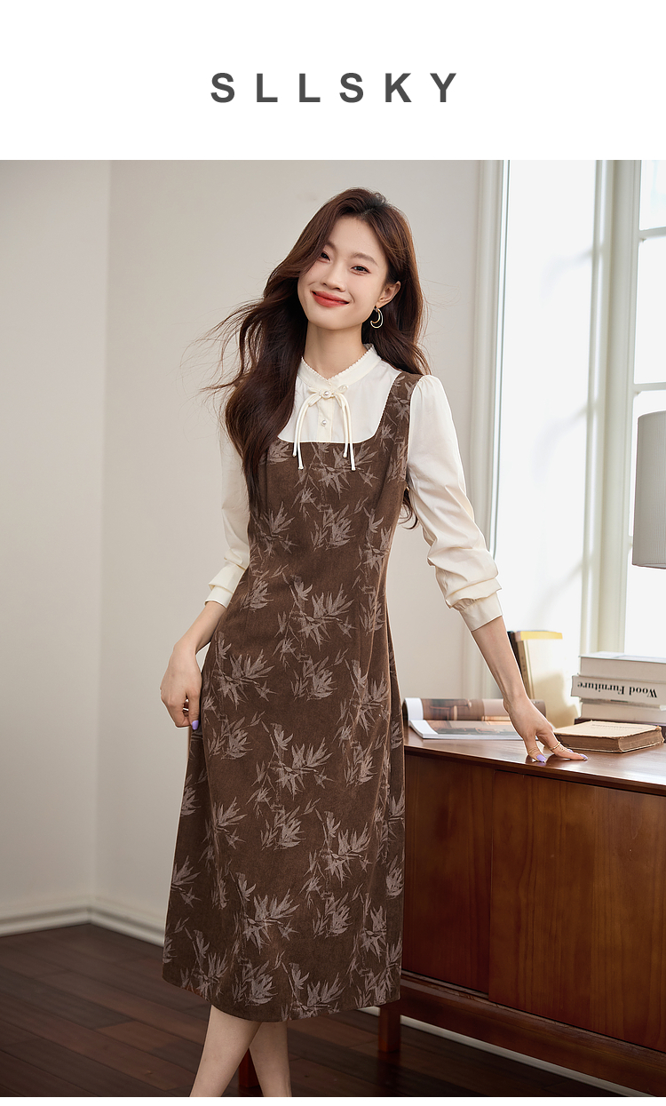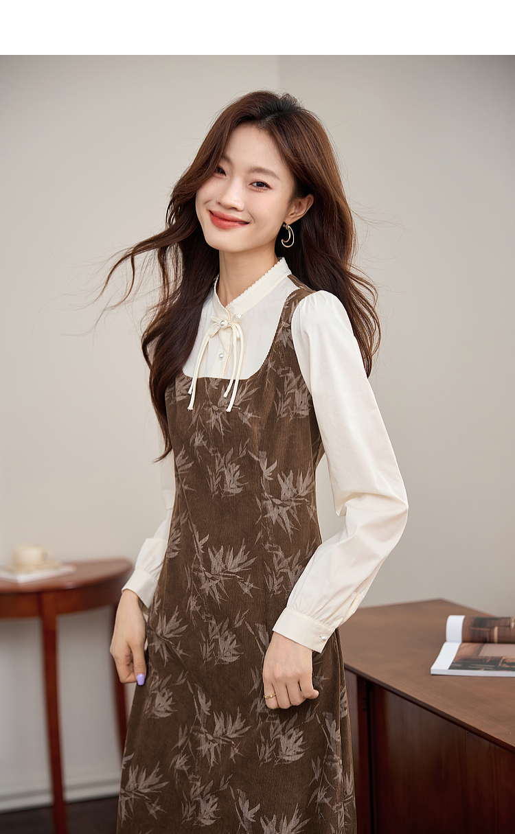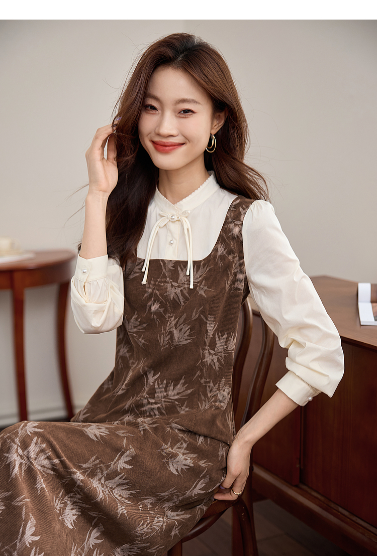 【五折购】熙世界新中式长袖拼接复古印花灯芯绒假两件连衣裙2025秋季新款