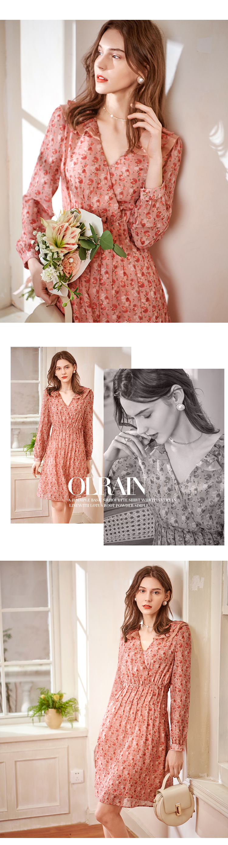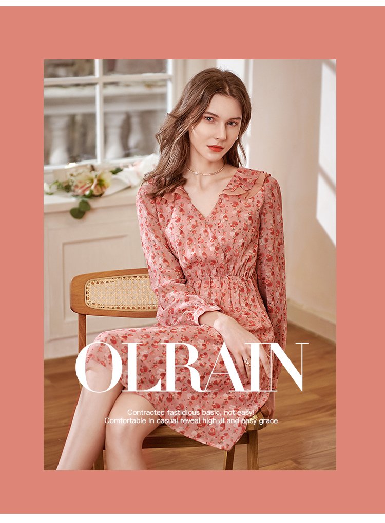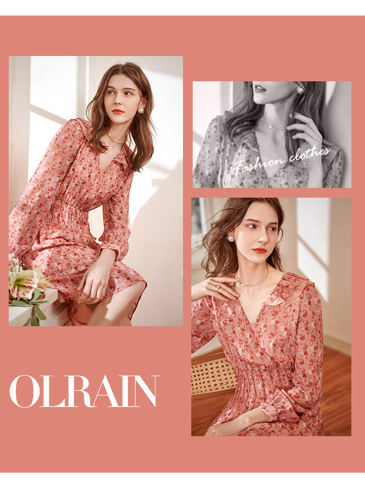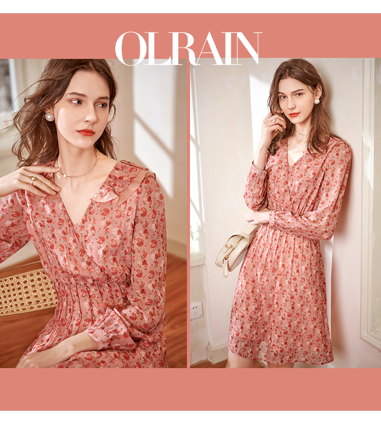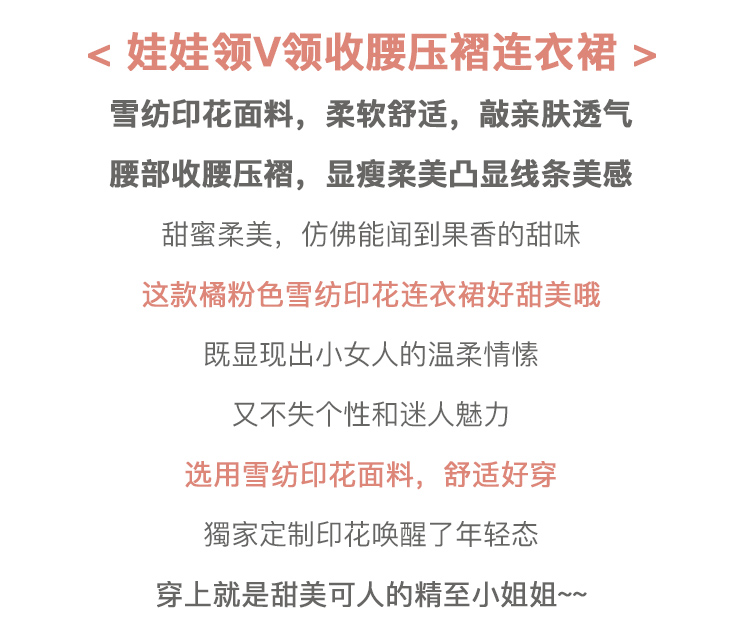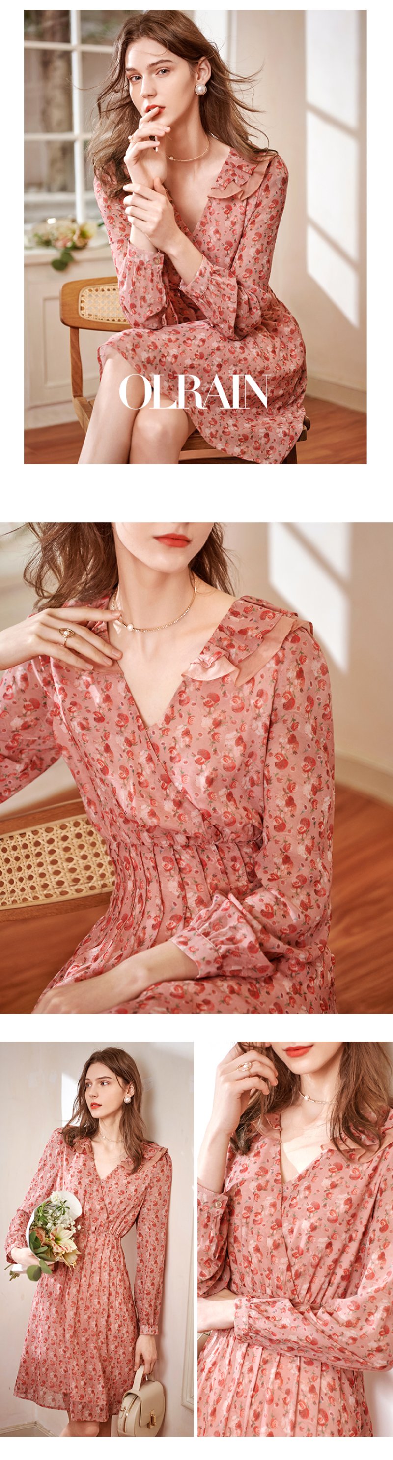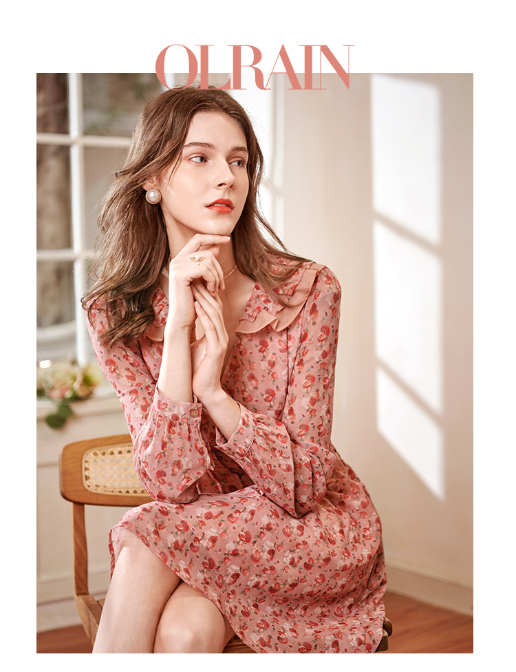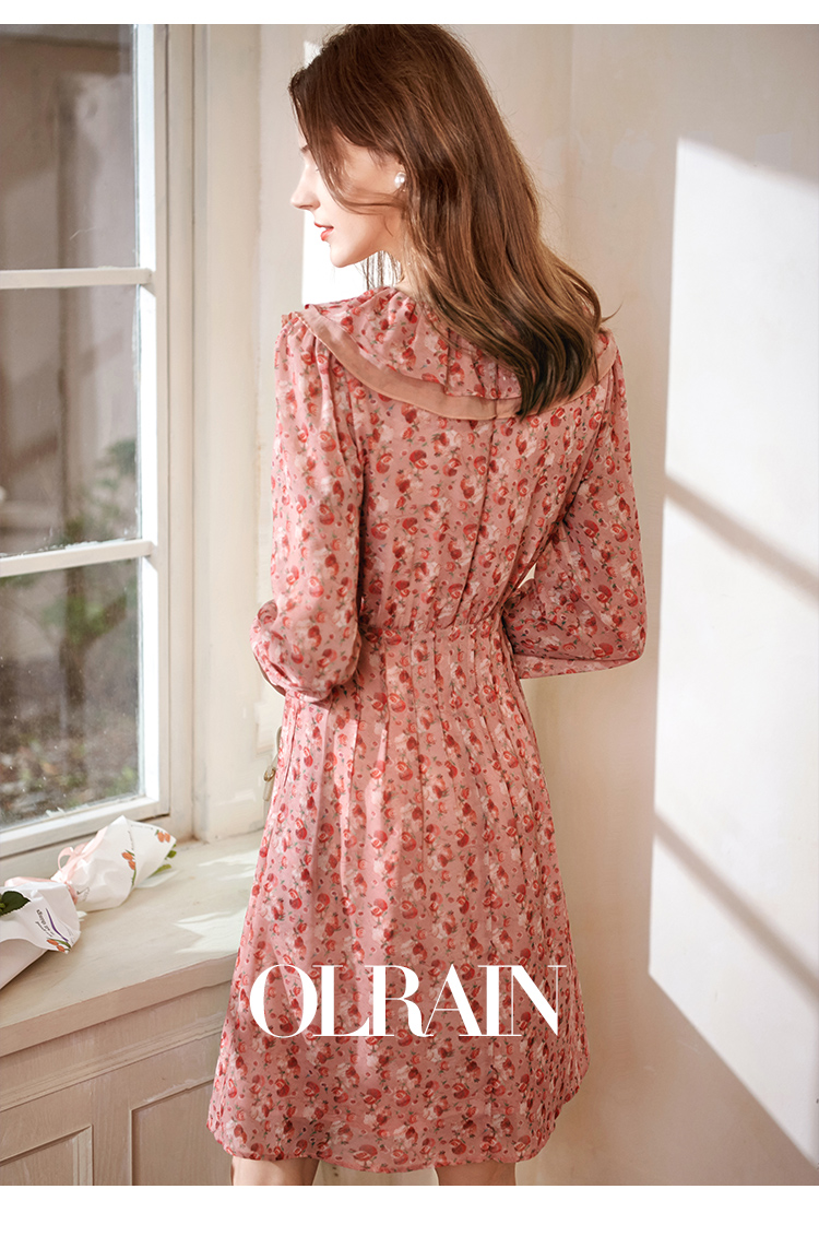 欧芮儿印花雪纺连衣裙春季新款娃娃领收腰显瘦甜美减龄俏皮压褶裙