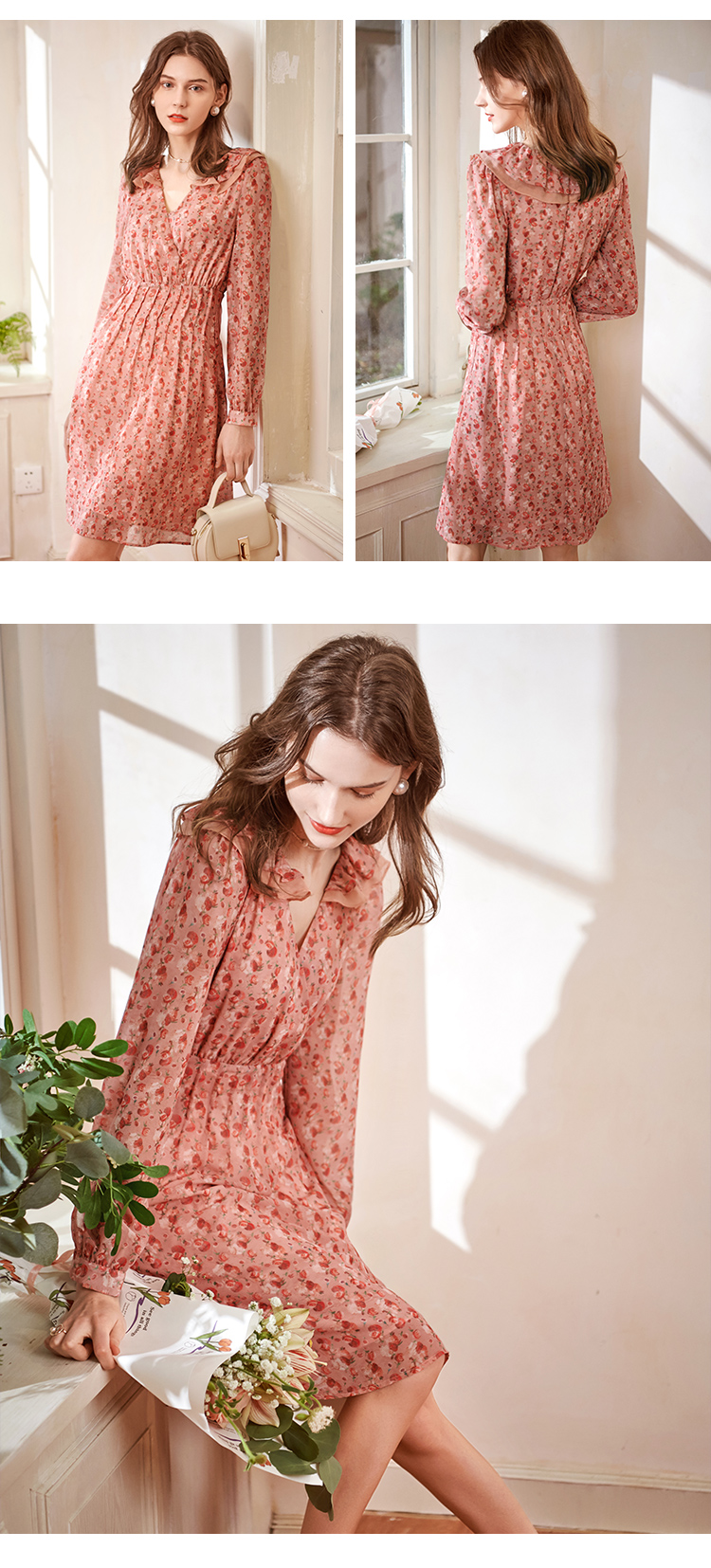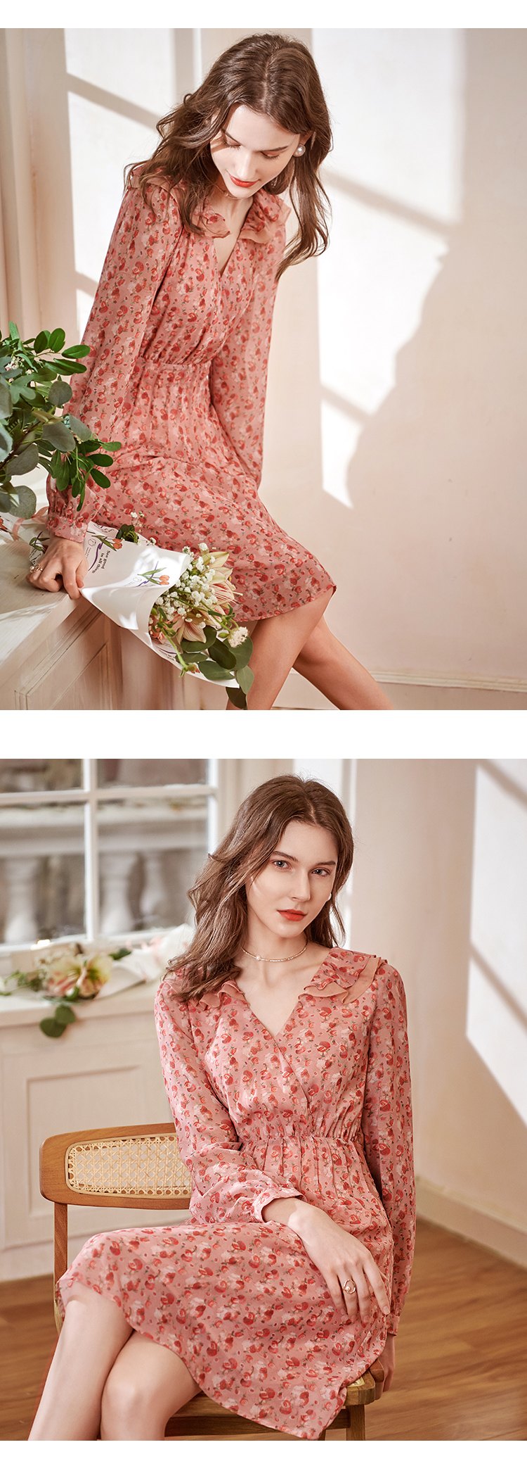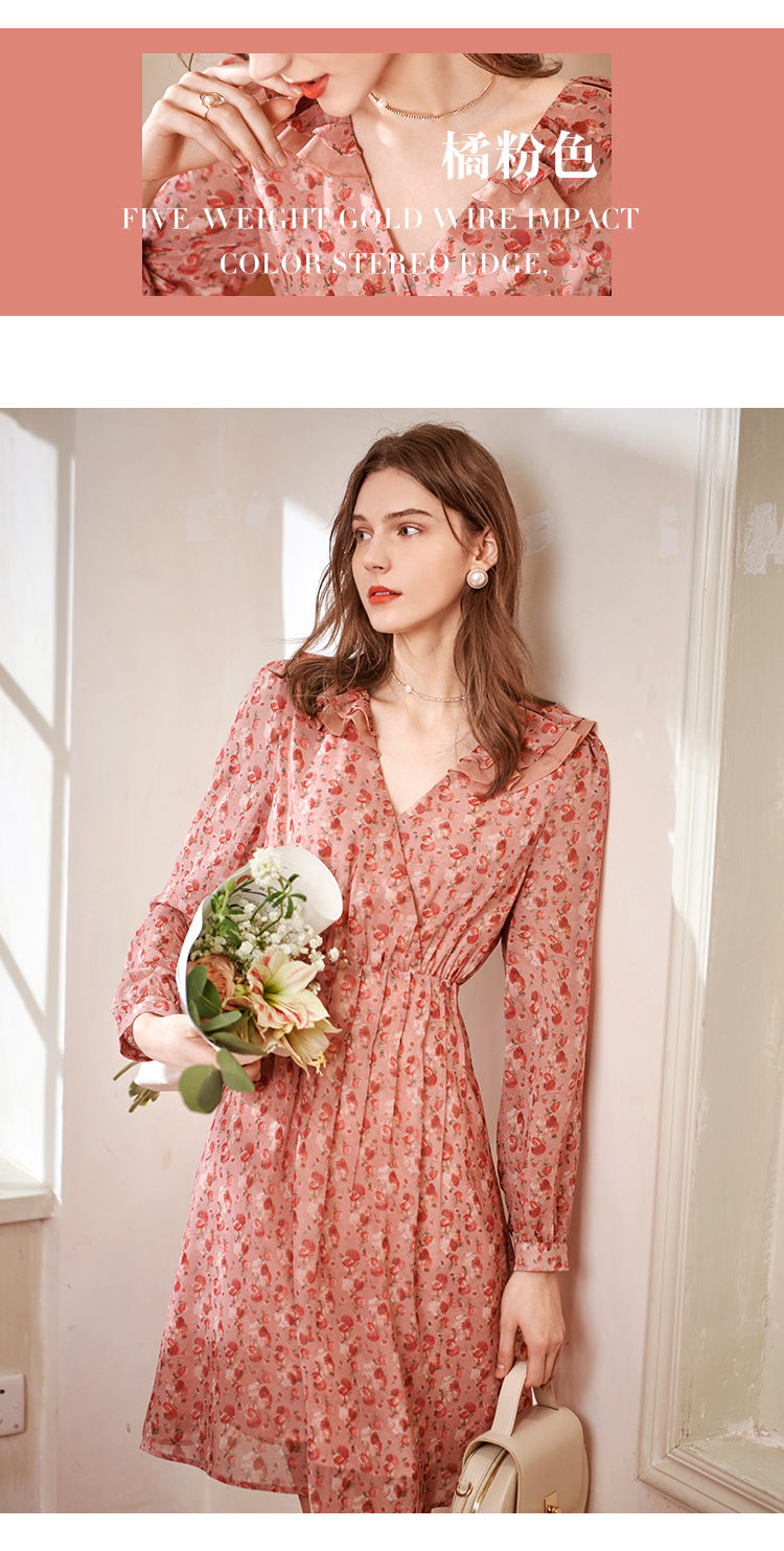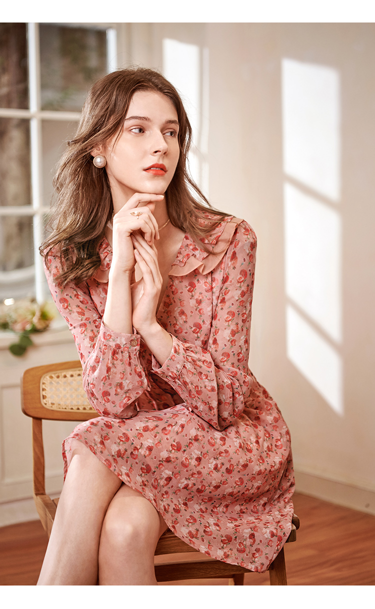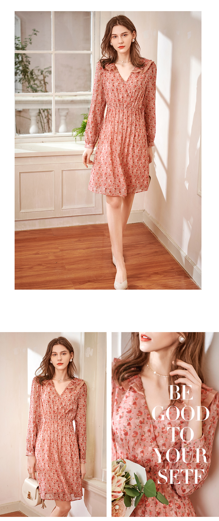 欧芮儿印花雪纺连衣裙春季新款娃娃领收腰显瘦甜美减龄俏皮压褶裙
