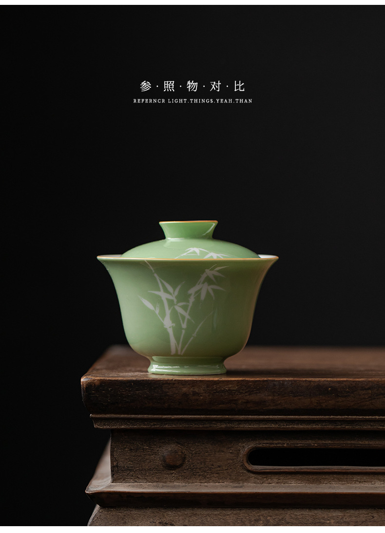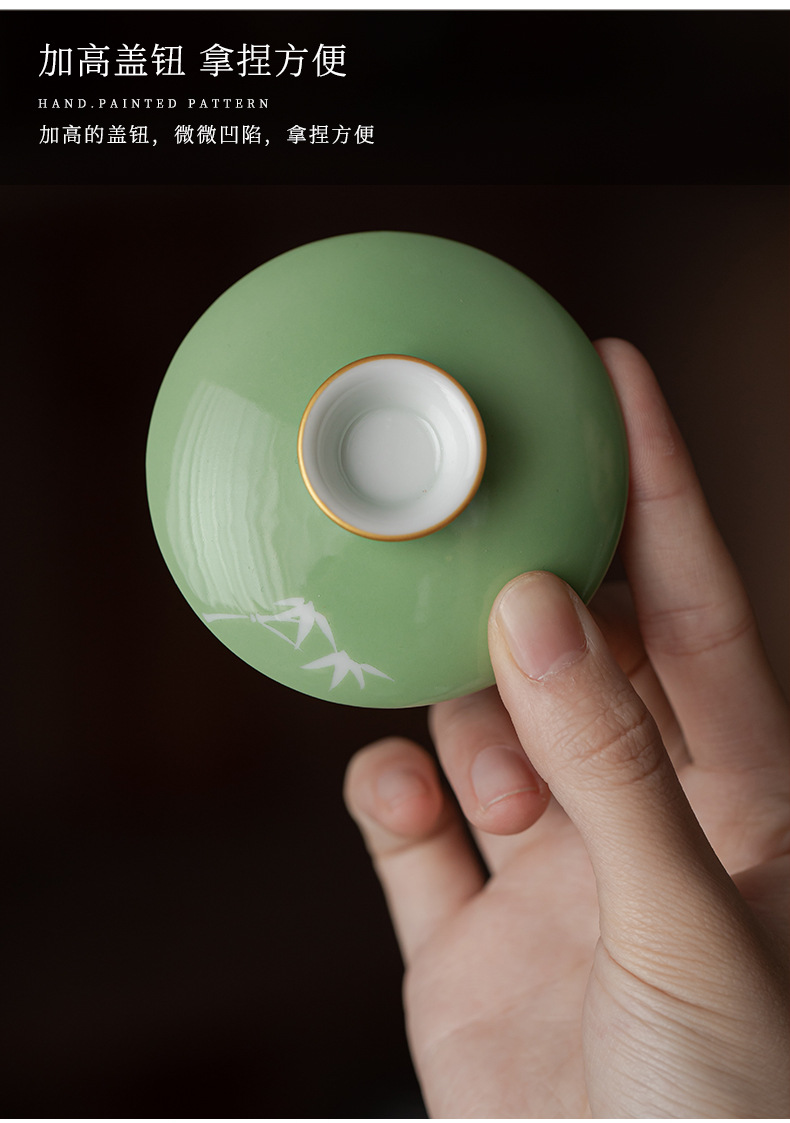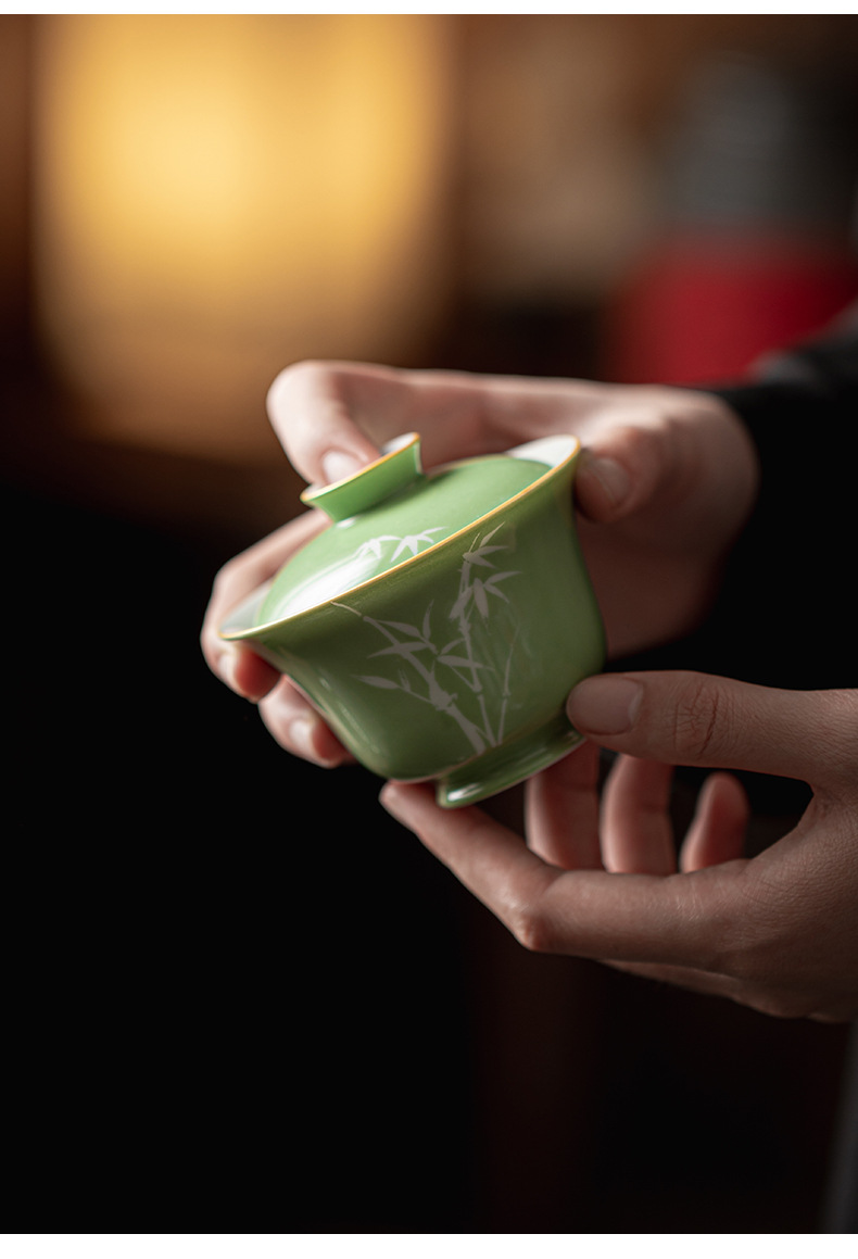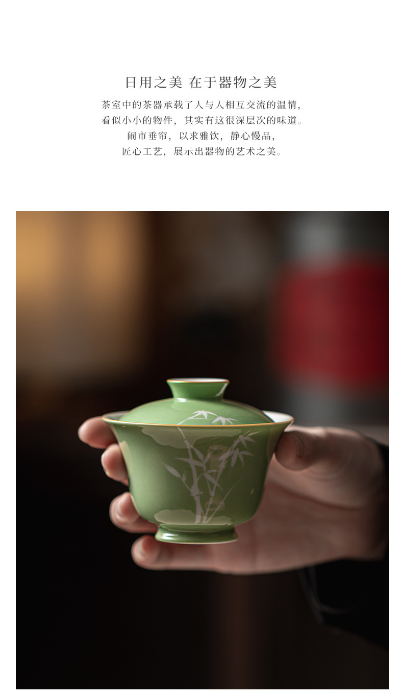 束刻/千山翠/留白竹影/清然盖碗留白手绘竹影盖碗手工陶瓷泡茶碗茶杯不烫手功夫茶具家用茶碗