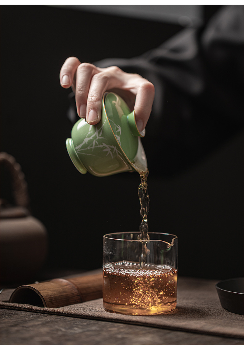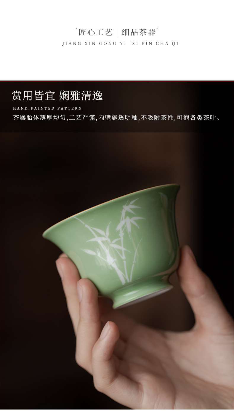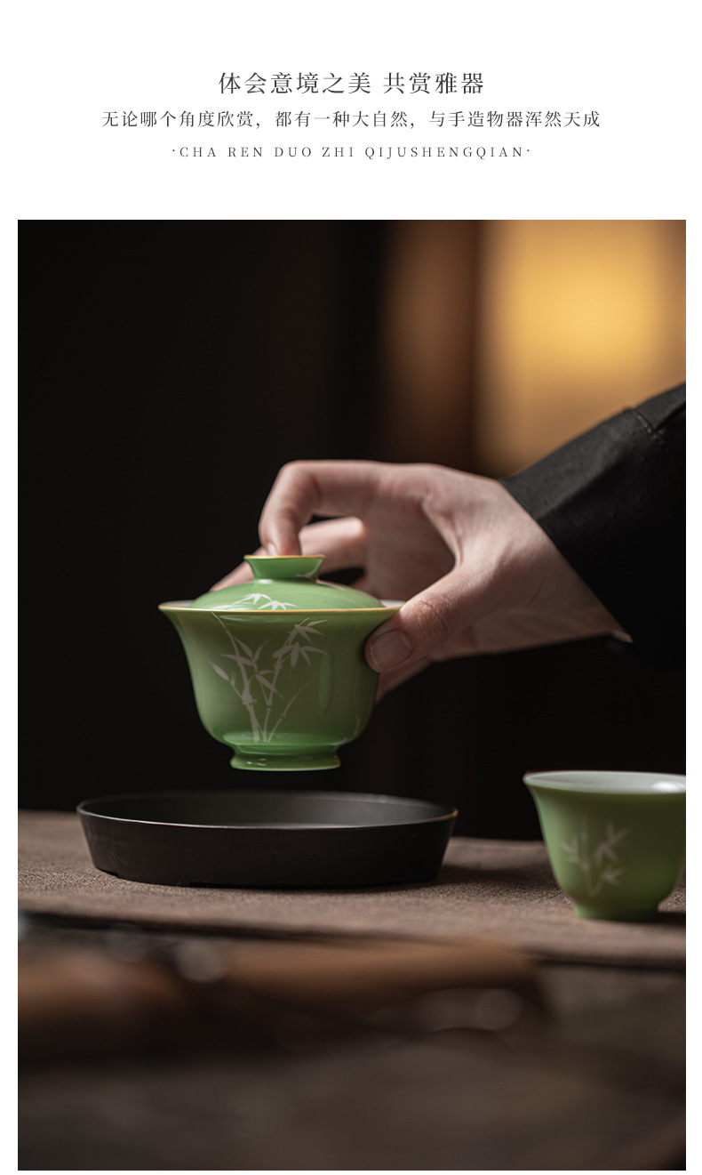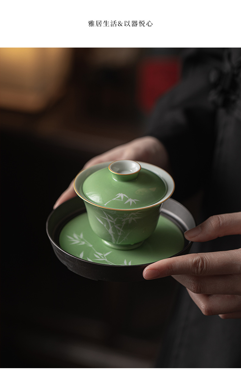 束刻/千山翠/留白竹影/清然盖碗留白手绘竹影盖碗手工陶瓷泡茶碗茶杯不烫手功夫茶具家用茶碗