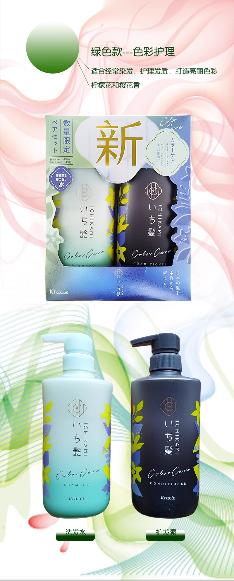 【跨境】Kracie/嘉娜宝新版限定纯植物护色洗发水护发素480g+480ml/套