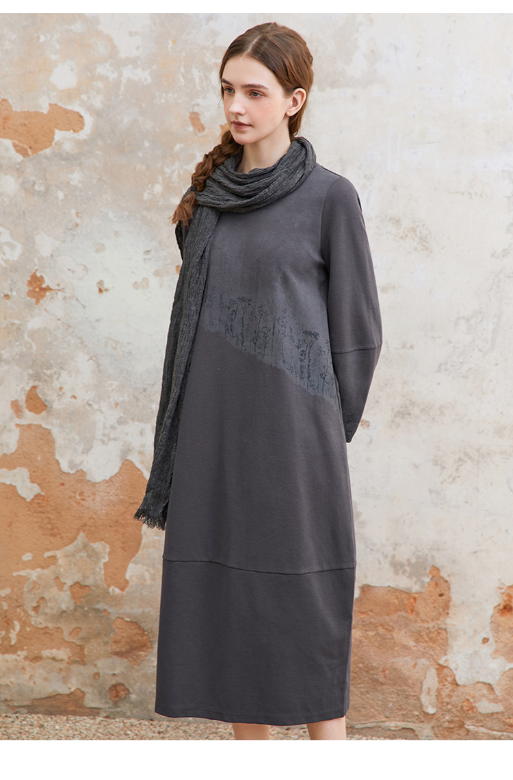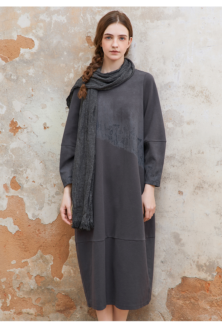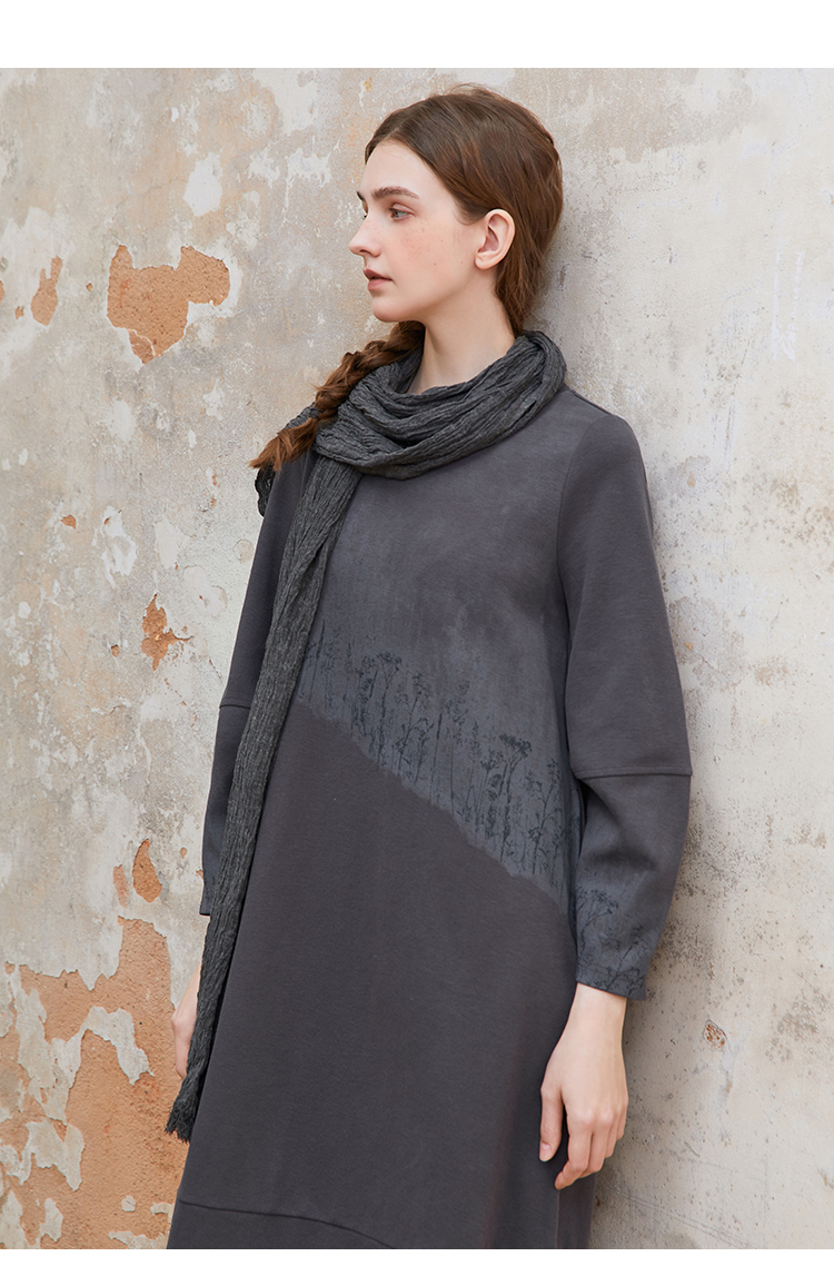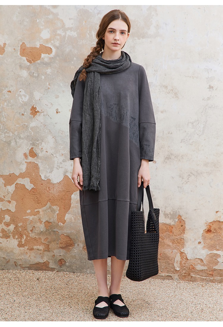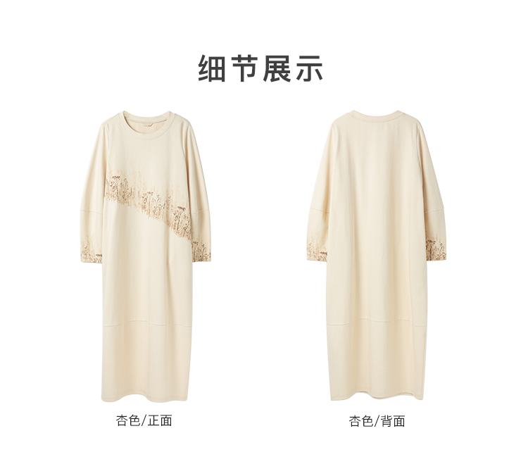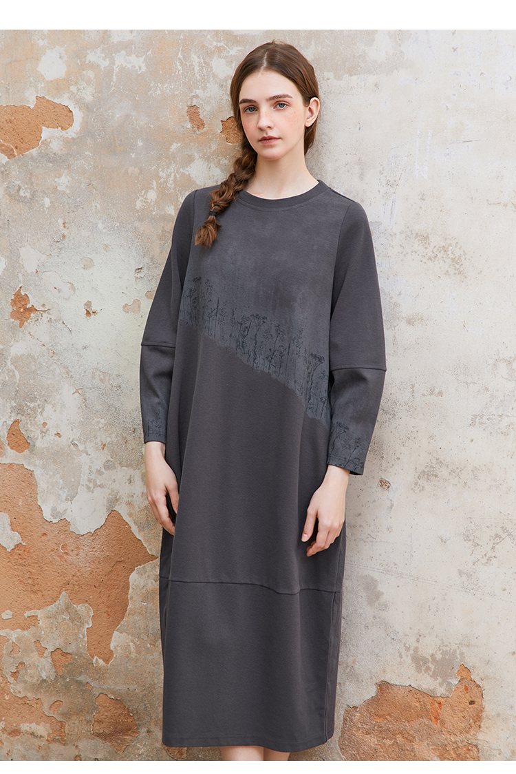 Famecoco植物拓印印花卫衣裙女圆领长袖宽松连衣长裙FAC1FA012