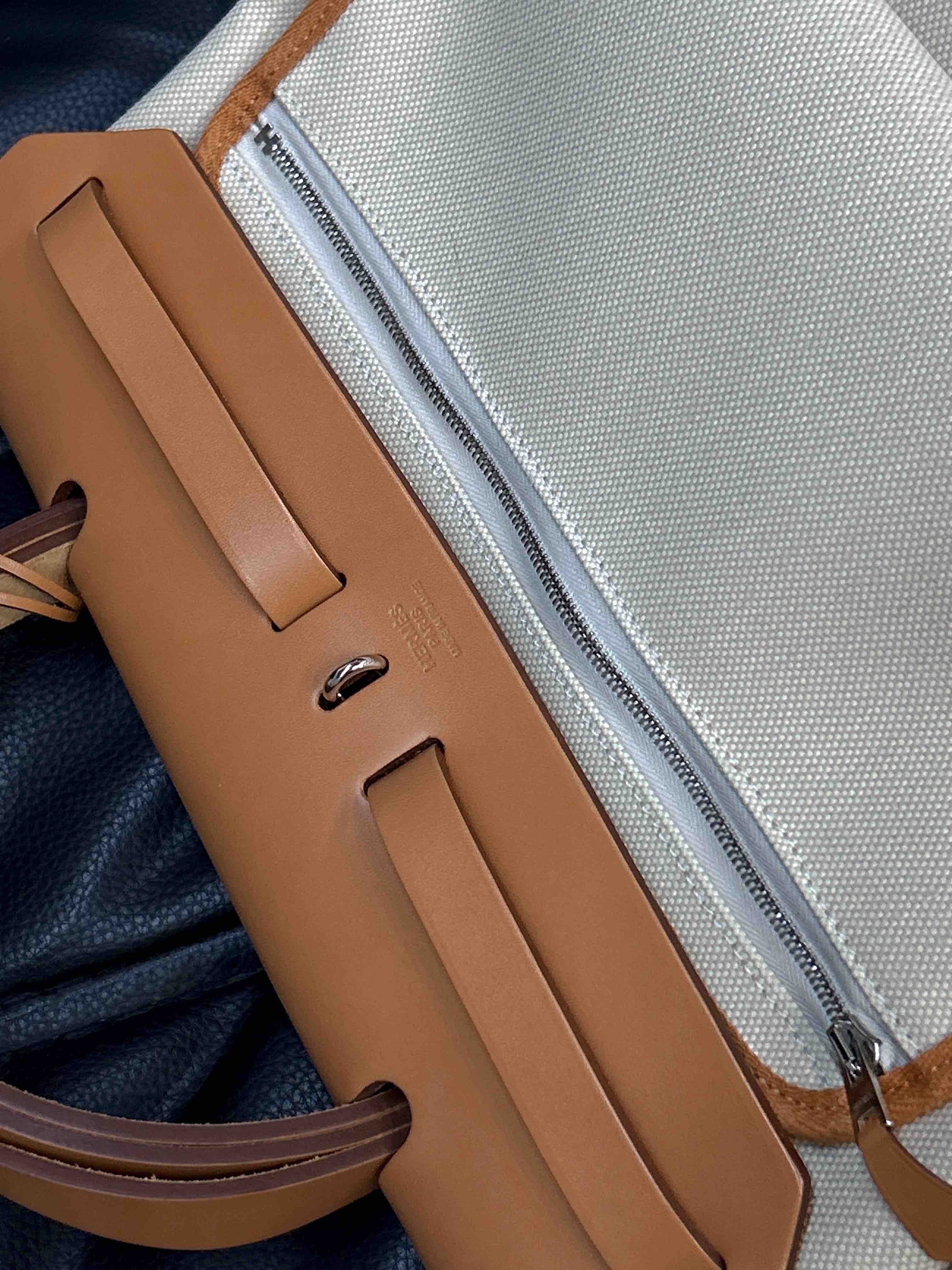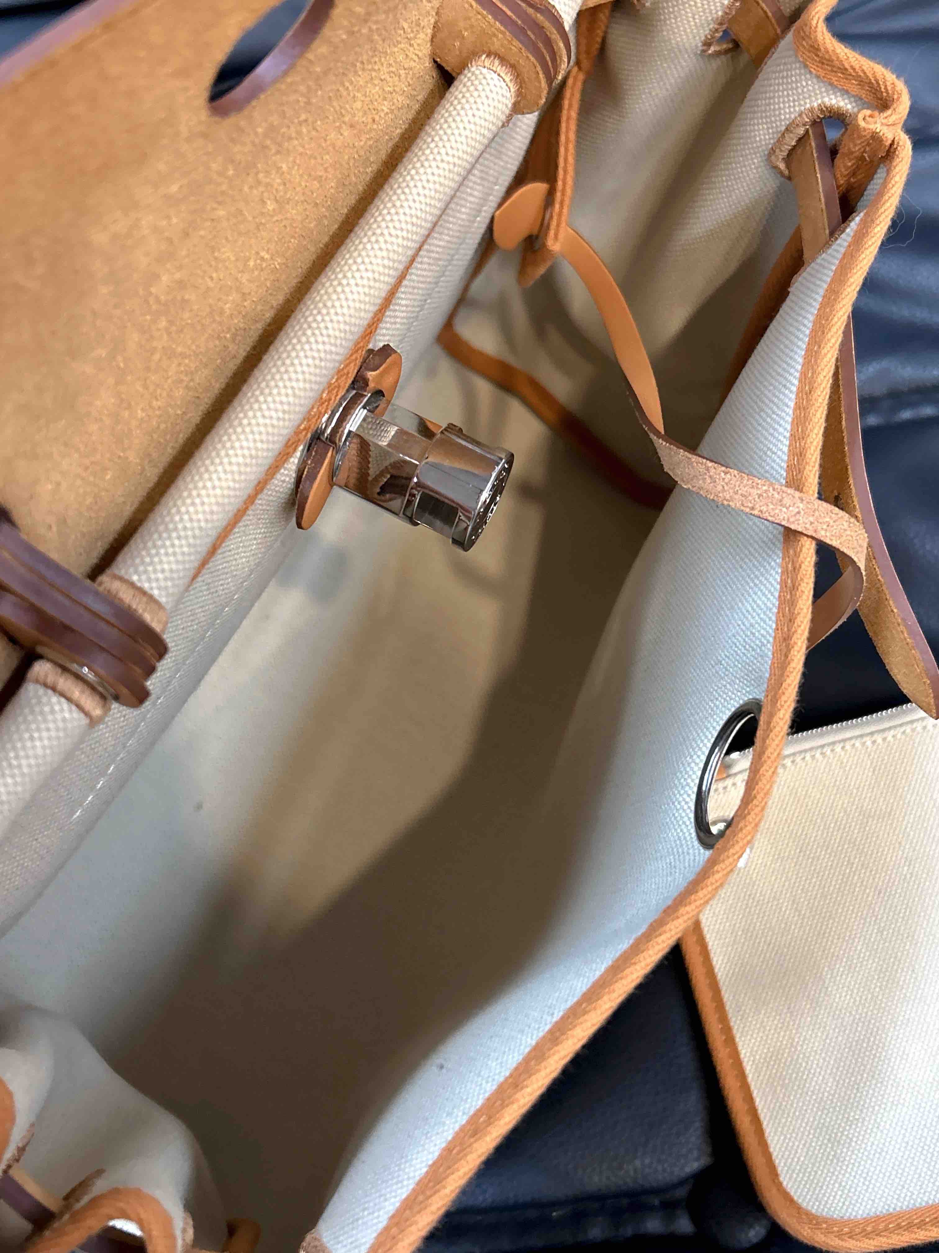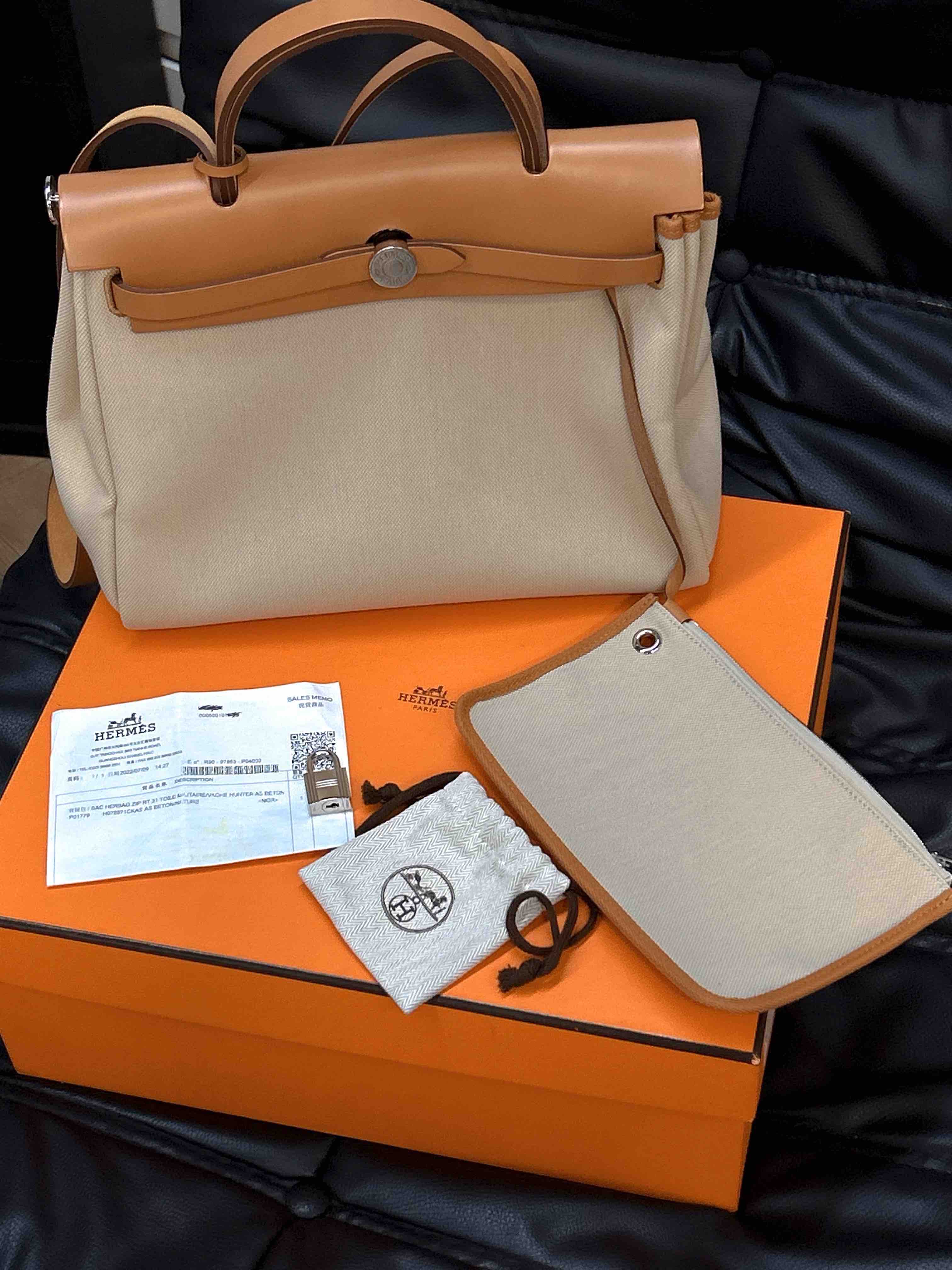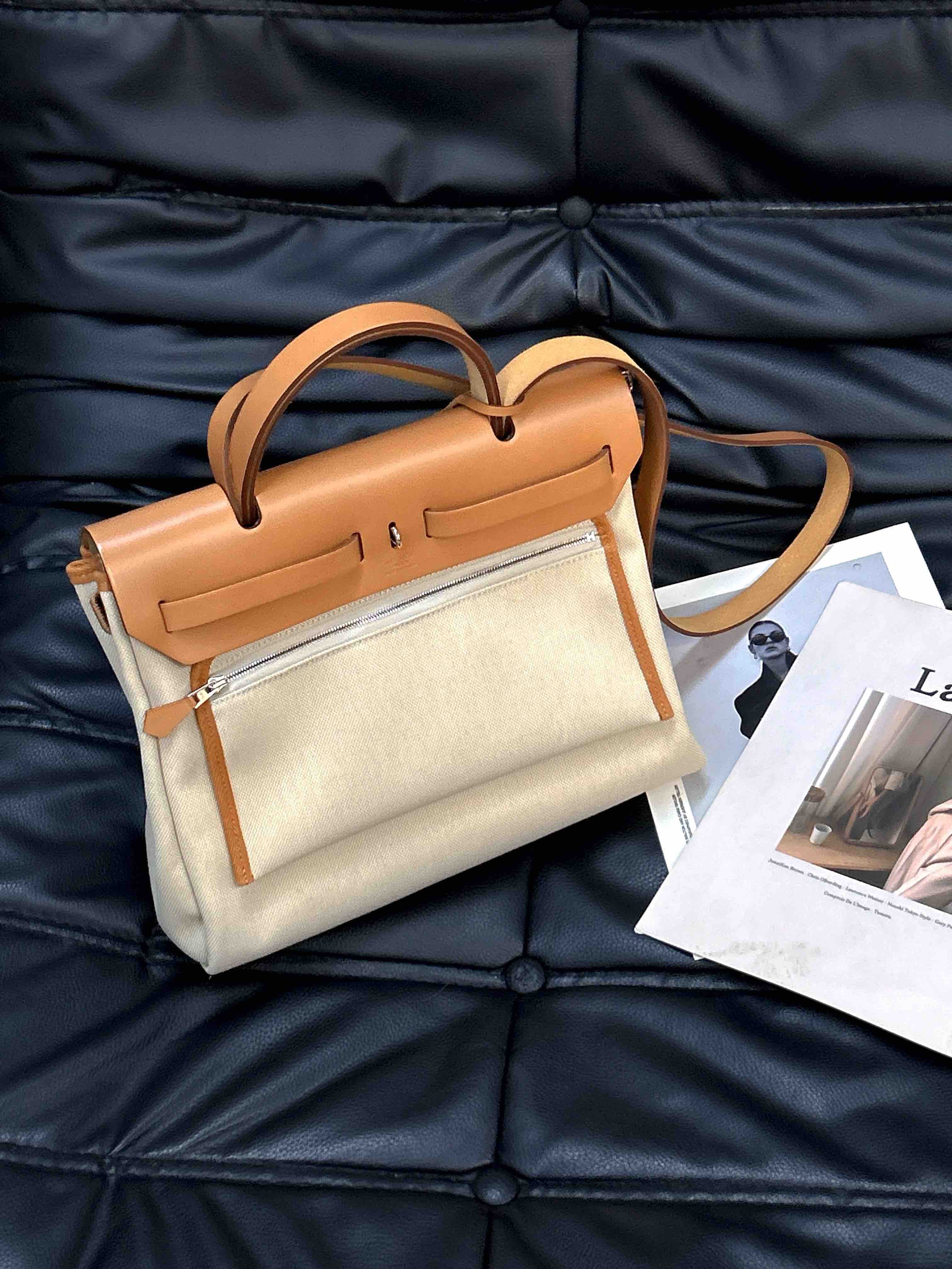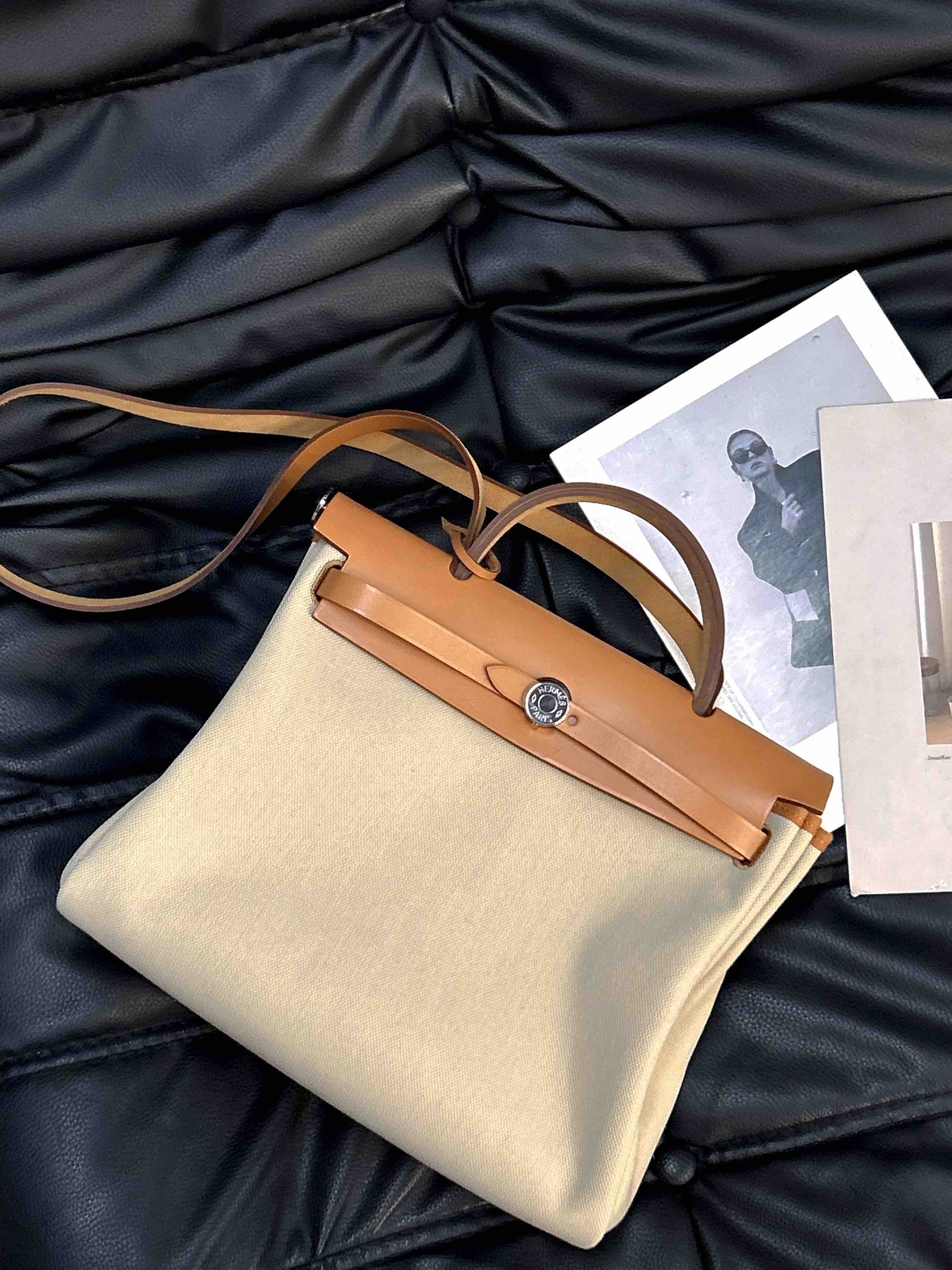 【商品详情】正品二手 爱马仕 棕色 帆布拼皮 herbag31斜挎包🐴 99新 29×25 u刻 配件:大全套、盒子、小票、防尘袋、子袋、钥匙、钥匙挂件。外翻盖有轻微使用感 内里干净 学院风拉满