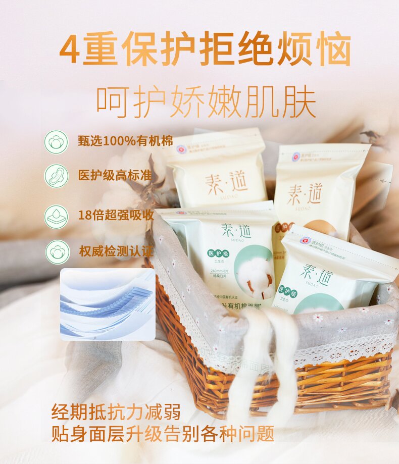 面层采用100%有机棉,并通过中国有机认证,确保贴合私密肌肤的部分为天然有机棉,柔软亲肤,适合敏感肌肤使用。