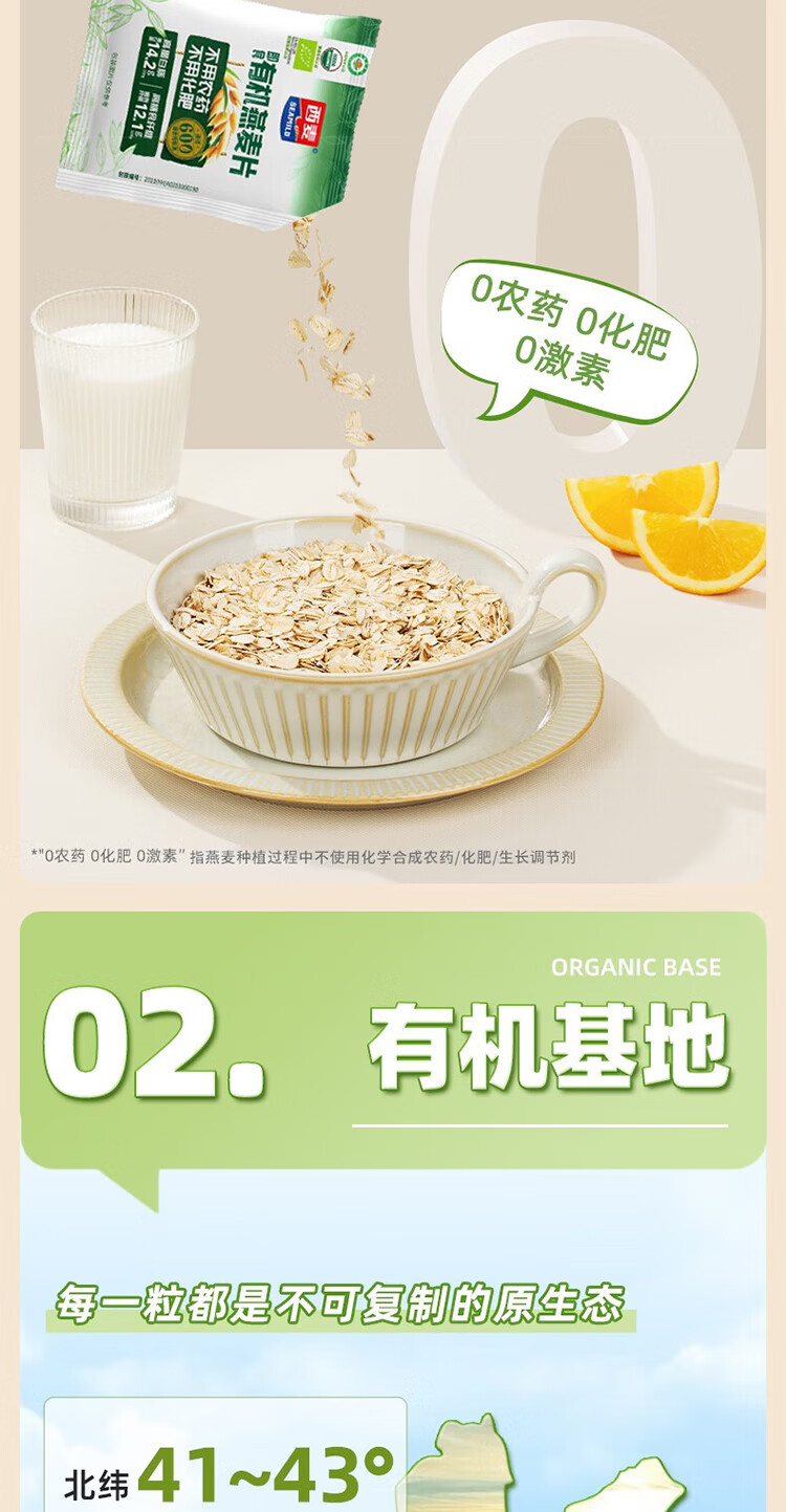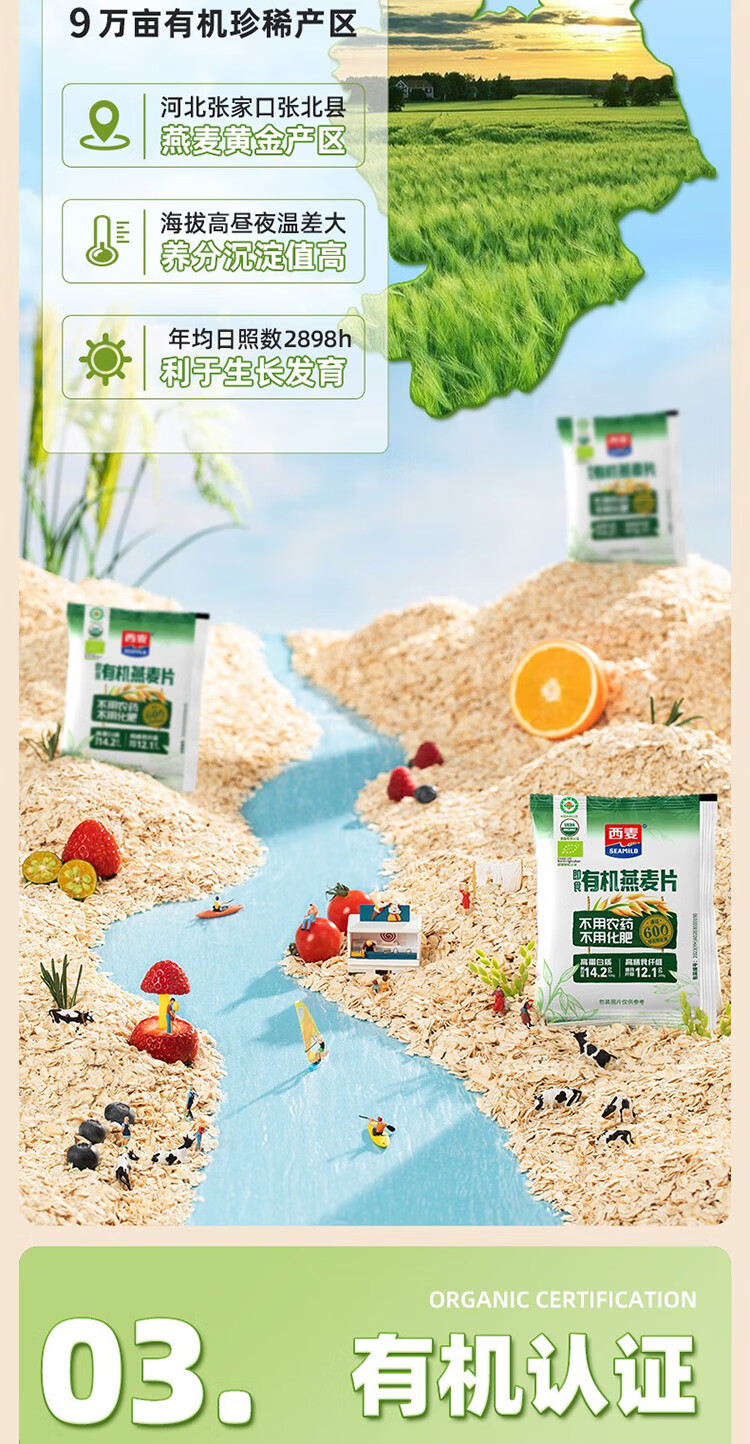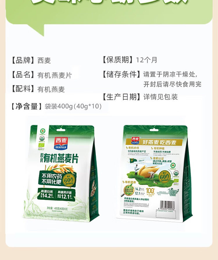 西麦即食有机燕麦片,6袋装,全谷物,配料干干净净,3重有机认证,多种营养元素,高膳食纤维,高蛋白,健身代餐,营养丰富,软糯顺滑,麦香浓郁D