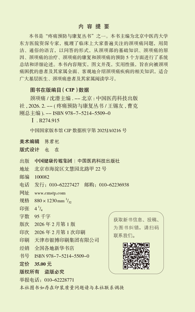 颈项痛 疼痛预防与康复丛书 沈潜 主编 适合广大基层医生、颈项痛患者及其家属阅读学习 9787521455090 中国医药科技出版社