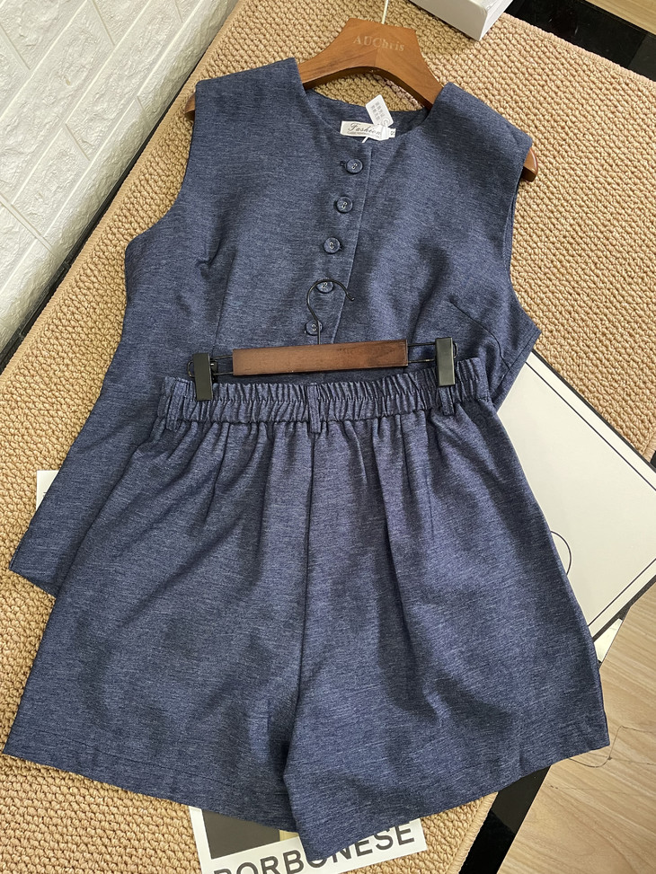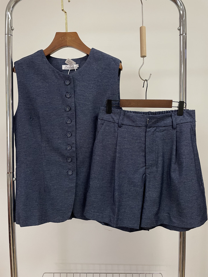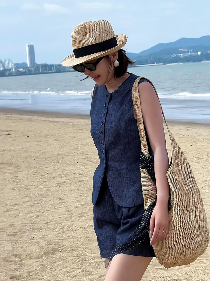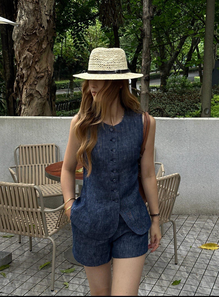 🎉今年夏天爱穿的🤩【老钱风马甲开衫短裤天丝套装】❗️天丝麻的肌理感自带高级滤镜❗️30℃🔥高温穿也完全不会闷汗黏腻❗️ 🔺藏蓝色高级耐看👏🏻