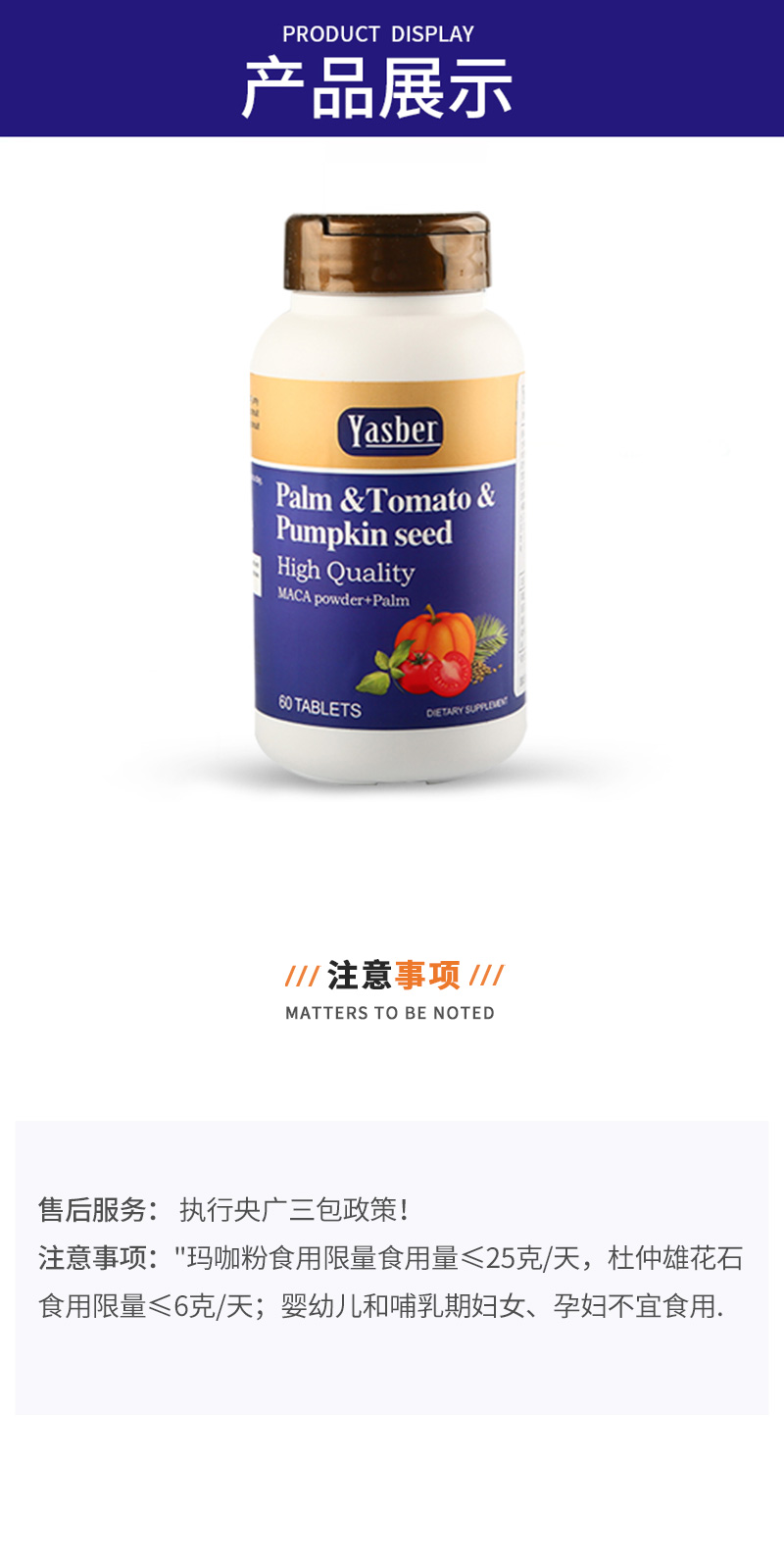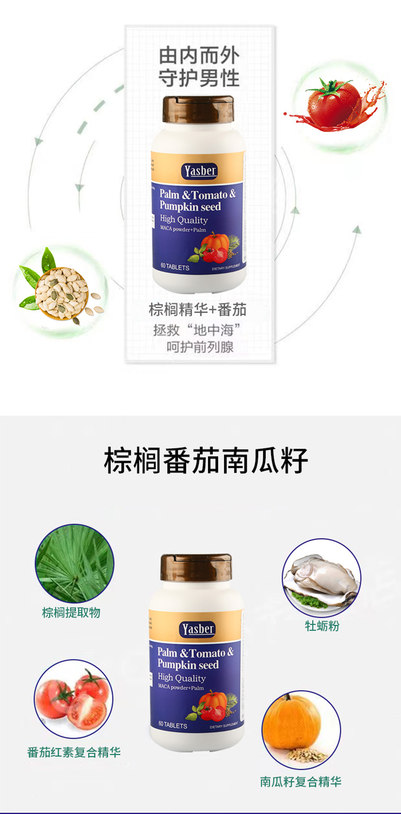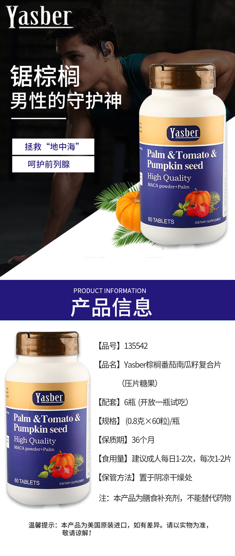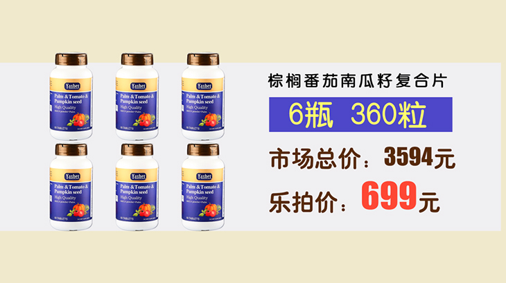 组件:棕榈番茄南瓜籽复合片(0.8克×60粒)/瓶,共6瓶