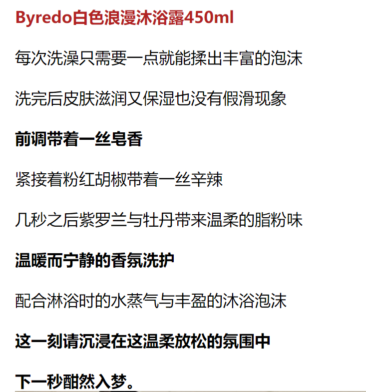 尾调的木质麝香给这份清新脱俗带来一丝温暖