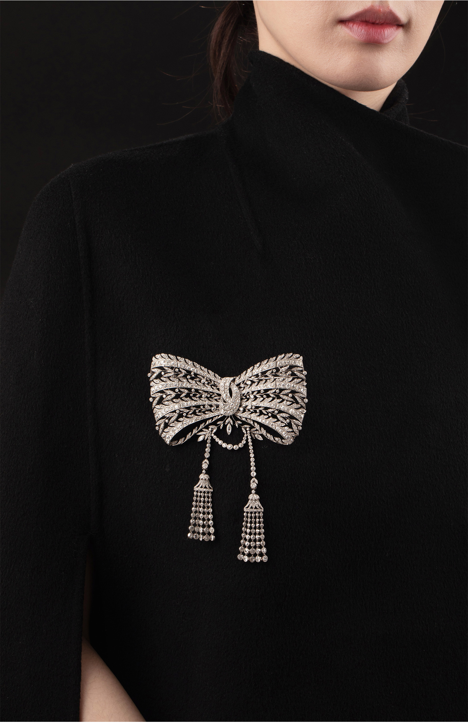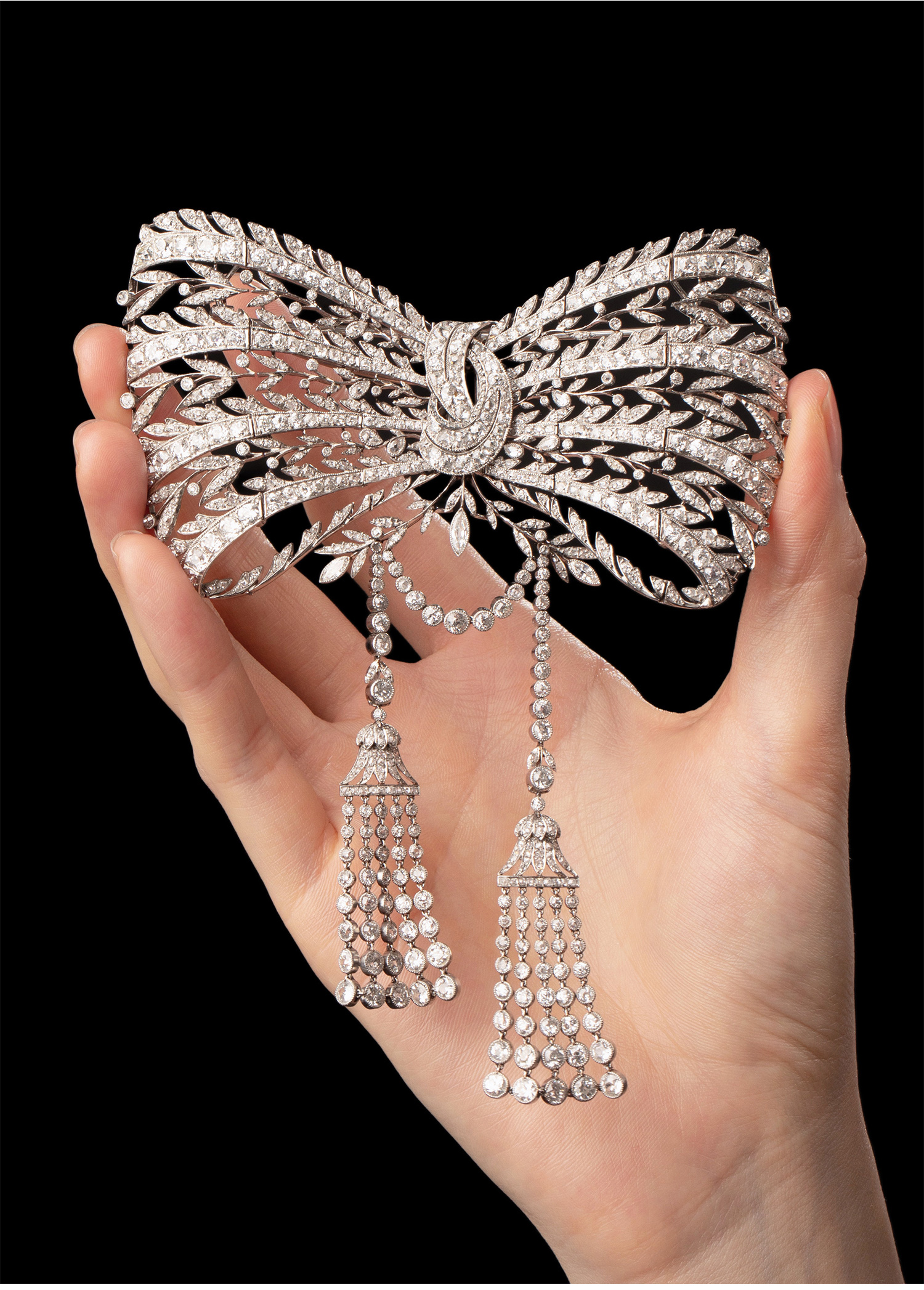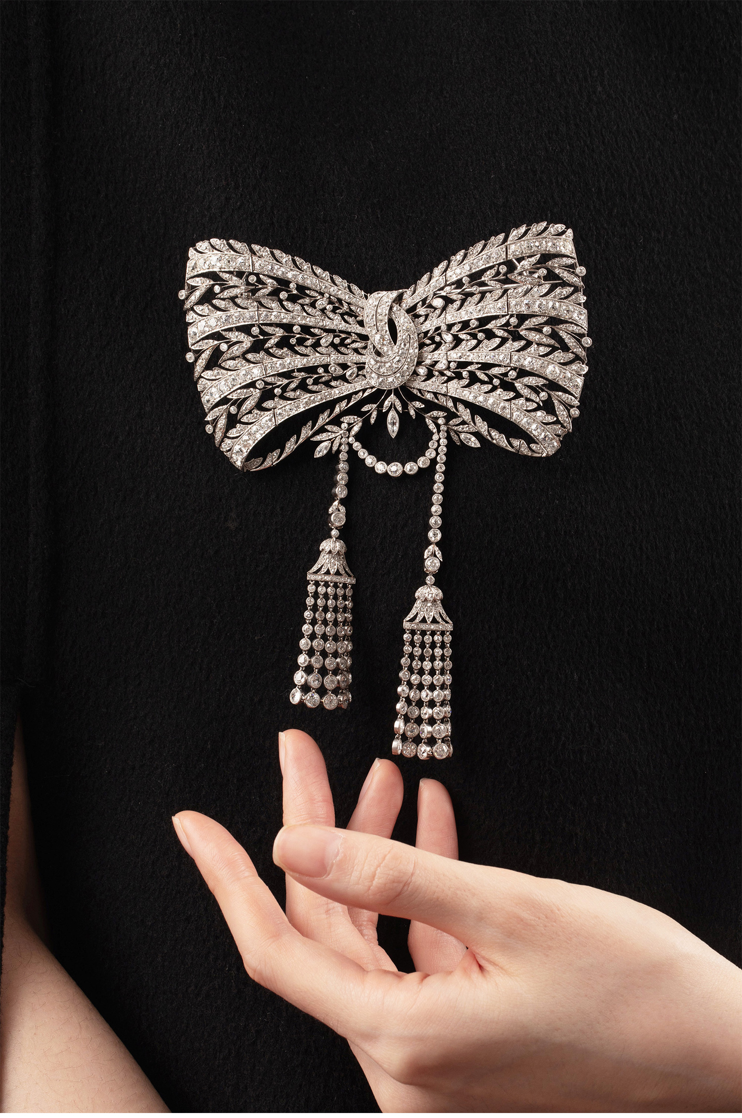 1910年代法国珠宝品牌出品美好时代风格铂金镶嵌钻石蝴蝶结流苏胸针 带原盒