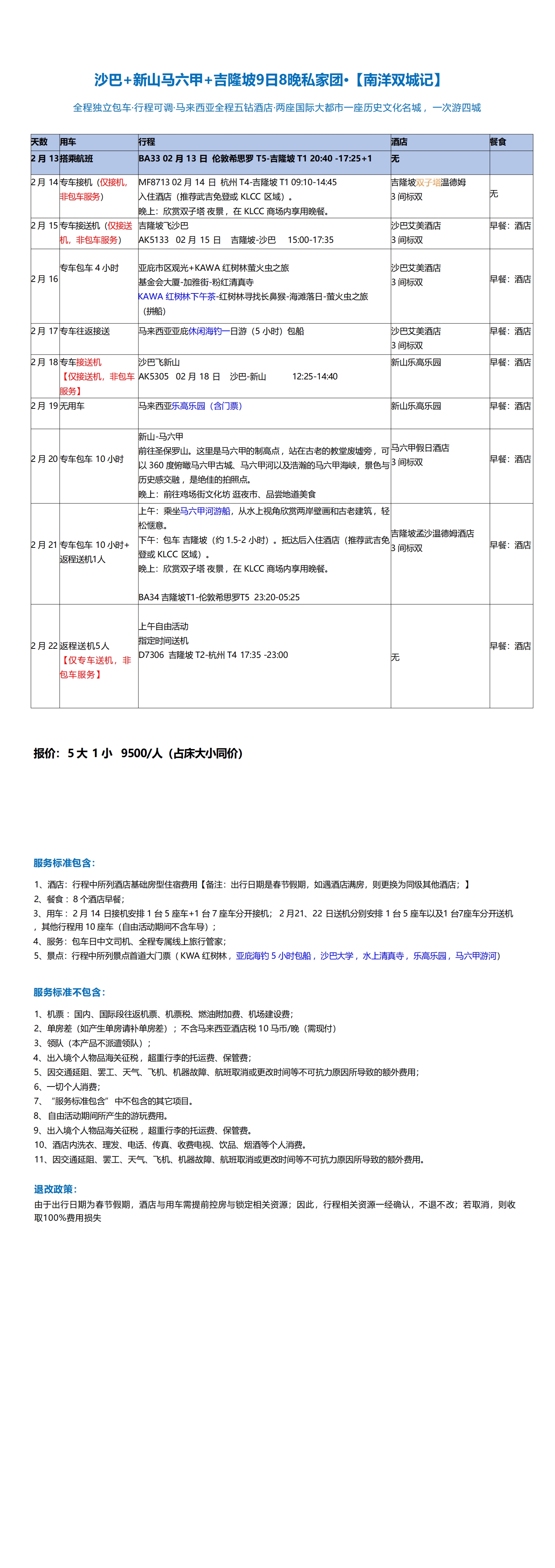 【境外】【定制】沙巴+新山马六甲+吉隆坡9日8晚私家团