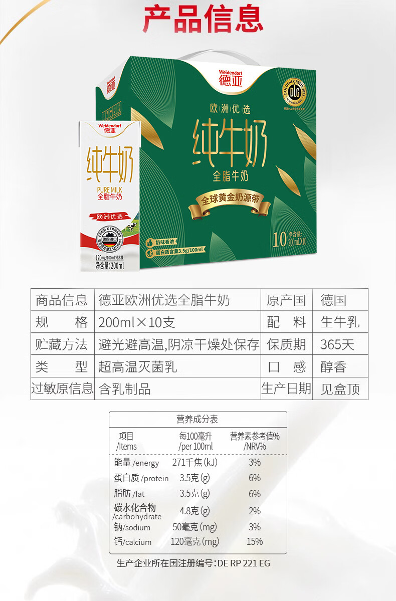 德亚欧洲优选(黄金奶源带)全脂纯牛奶200ml*10礼盒
