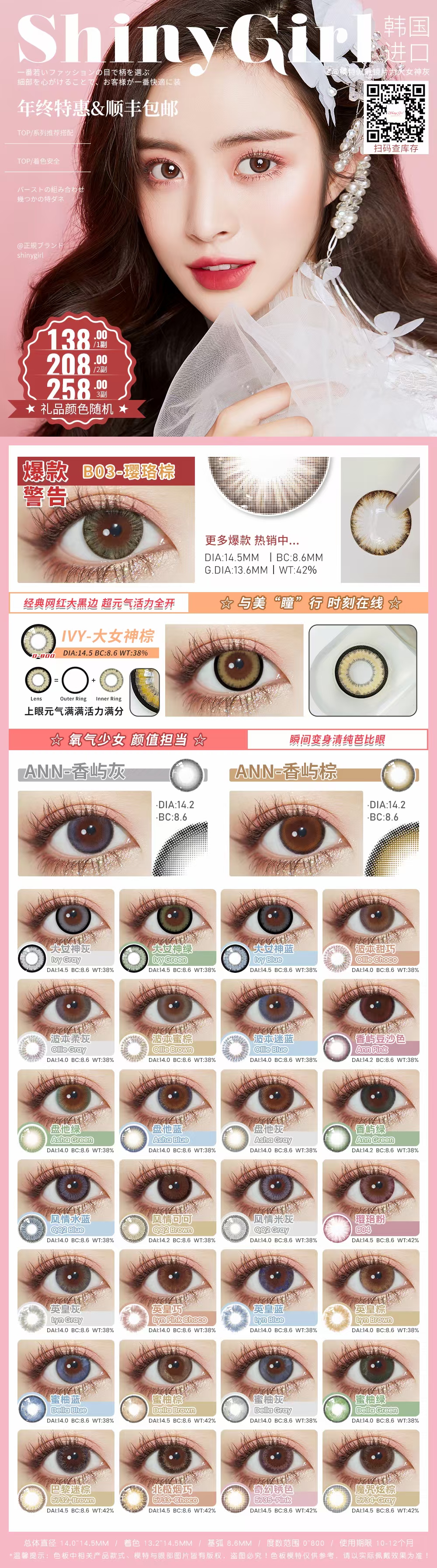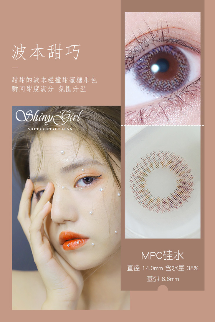 shinygirl 全系列 大女神/盘他/蜜柚/巴黎迷棕/北极烟巧/奇幻锈色/魔咒炫棕/BB迷棕莹紫/小奶狗/香屿/英皇/波本/小半灰绿巧,最高度数有1000