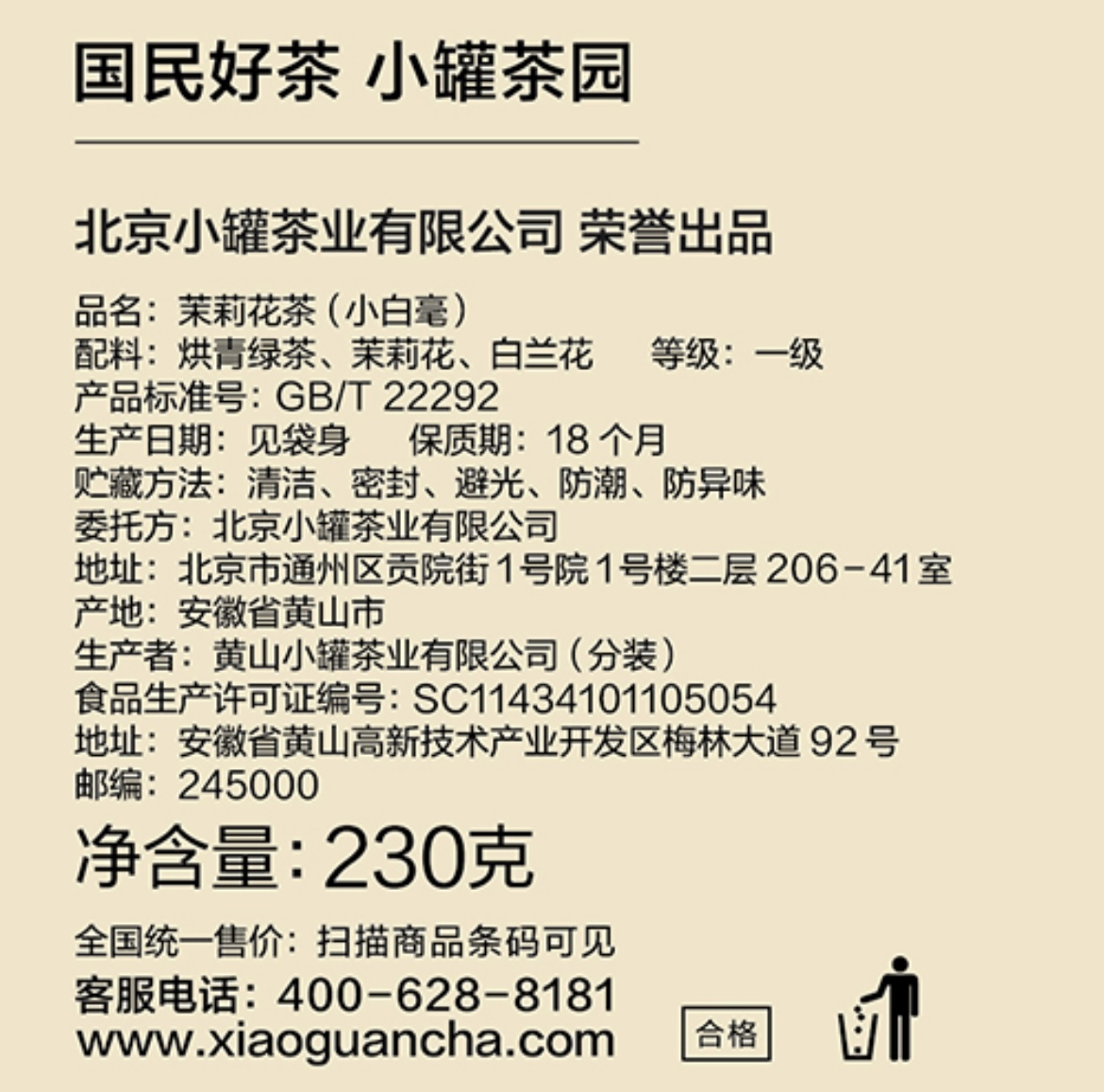 小罐茶园 口粮系列量贩装茉莉花茶230g自用送礼超级实惠装夏日必备茶