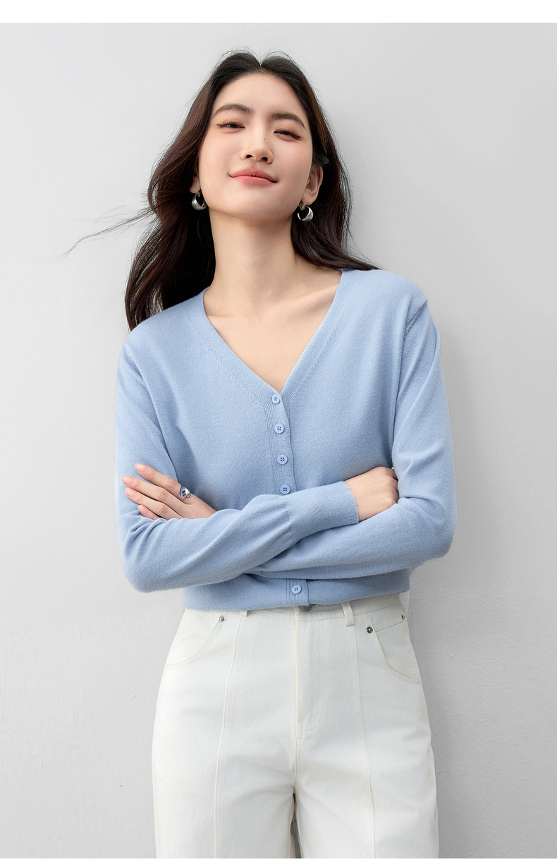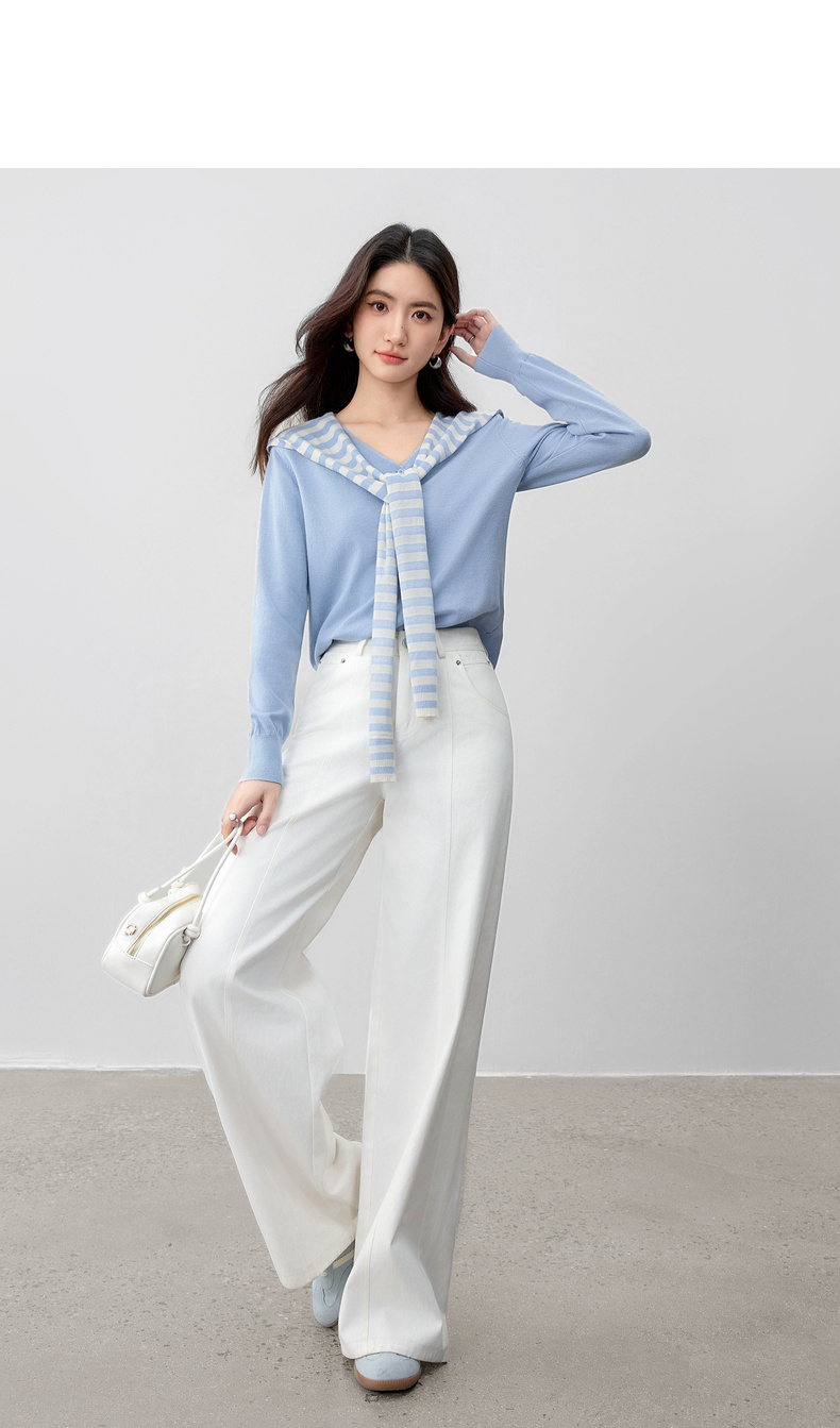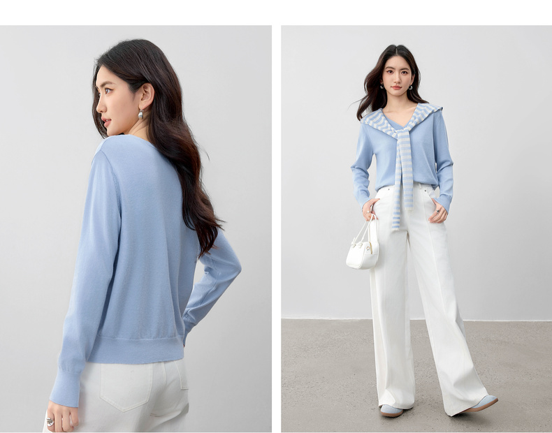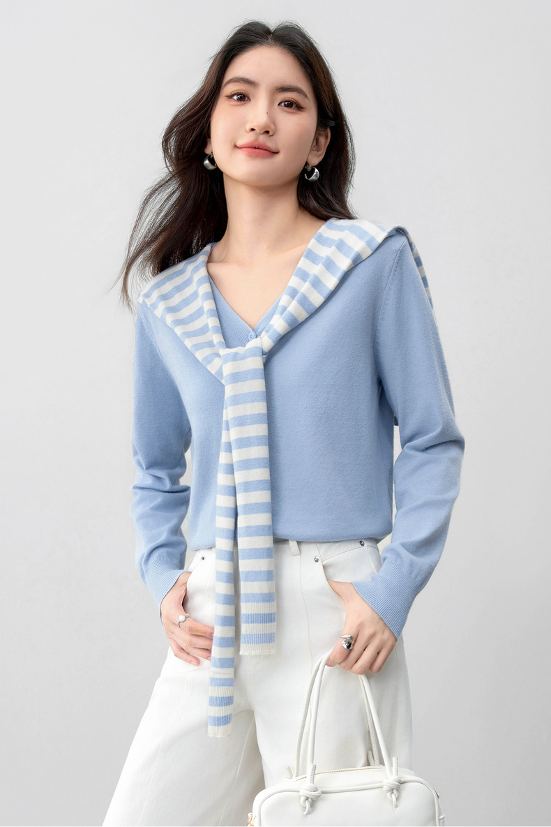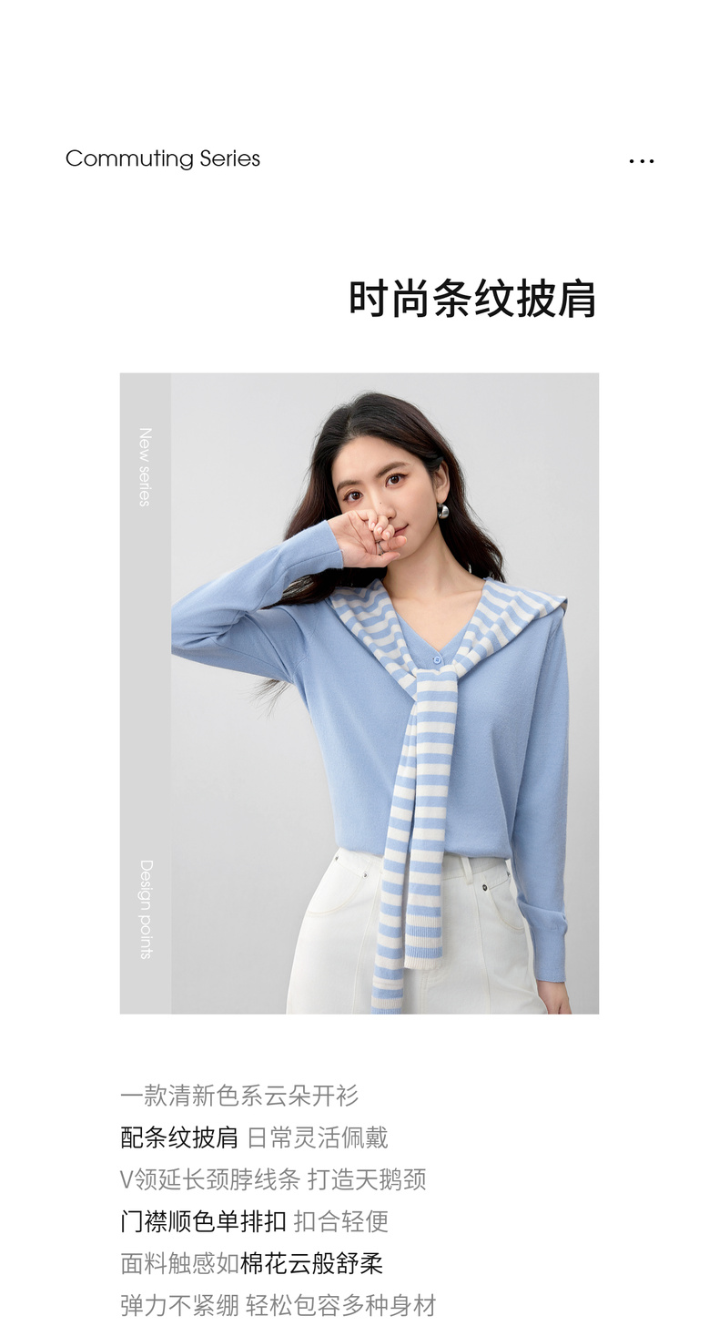 【内购】【条纹披肩】海军风通勤V领单排扣弹力软糯长袖开衫针织衫-W53HB3390
