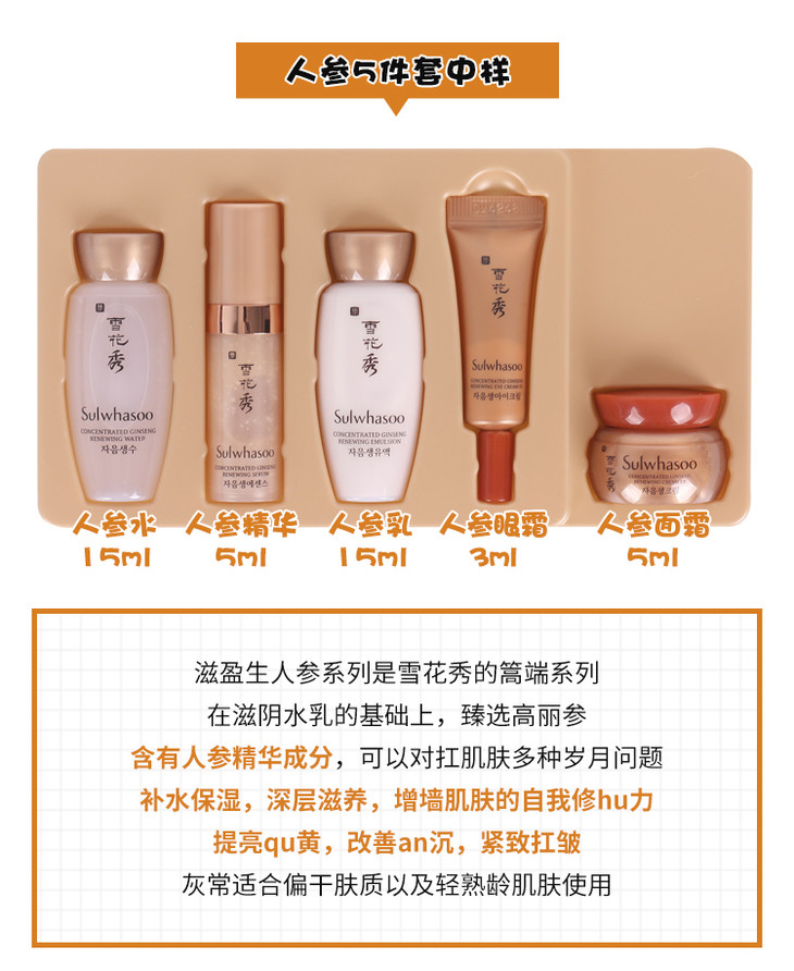 购买小贴士: 快递:圆通 发货地:香港直邮 天气丹中样3件套,天气丹中样6件套,雪花秀中样5件套,均为套盒装,产品包装盒均已收到为准,雪花秀撕拉面膜30ml+雪花秀睡眠面膜30ml+雪花秀顺行洁面50ml,为三支组合装,非套盒 |