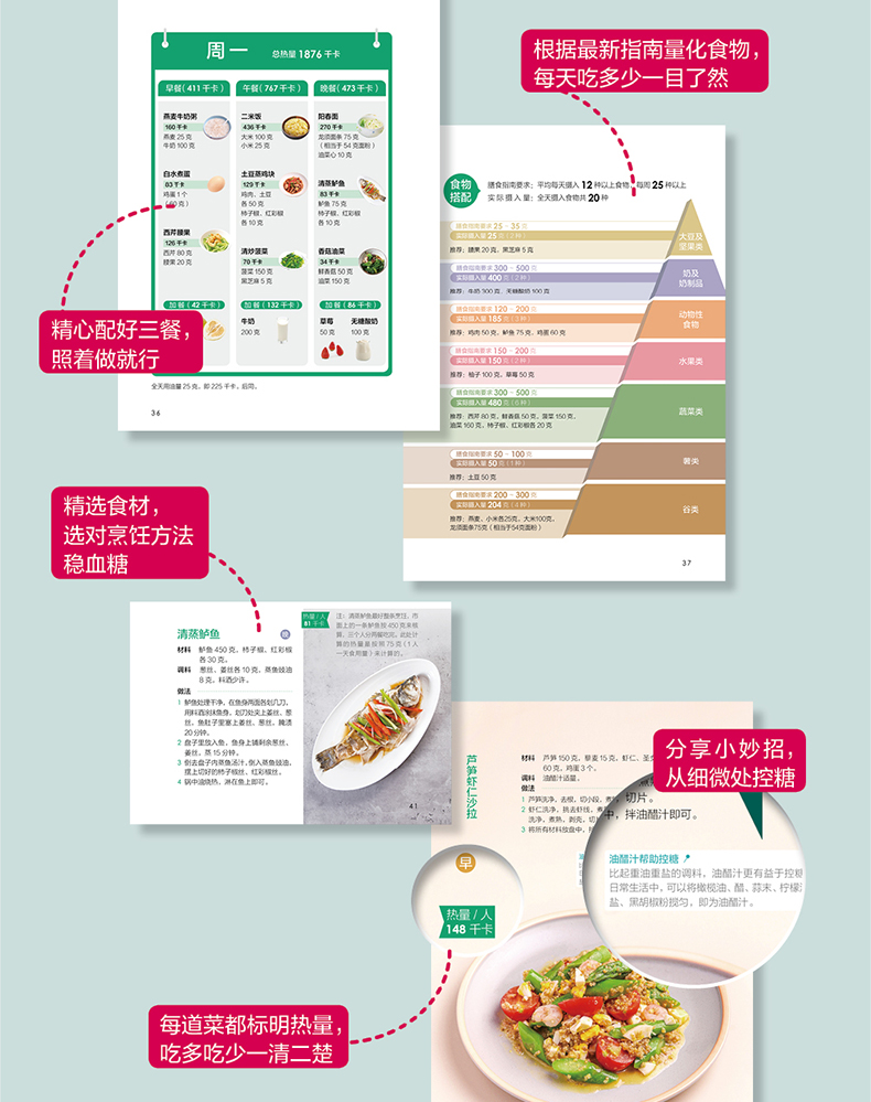 2、不仅是一餐,更有一日三餐、一周七天的具体膳食搭配模板,跟着做,放心吃。