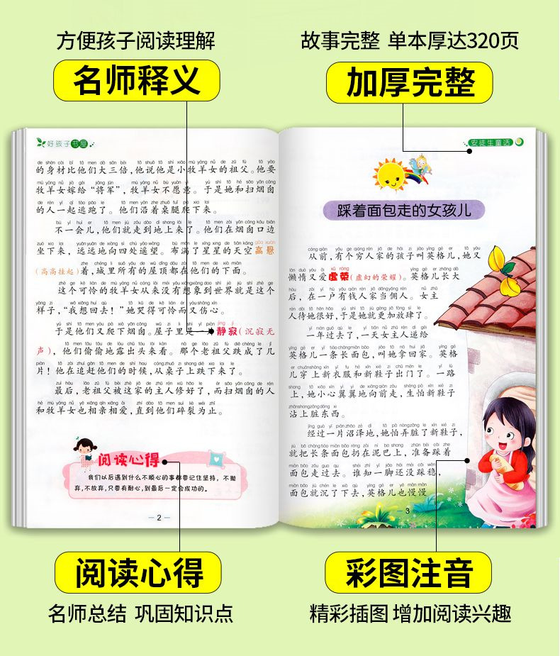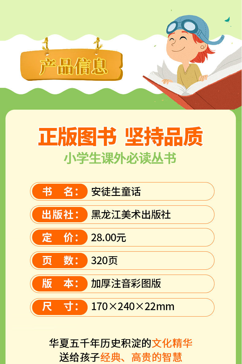 《安徒生童话(彩图注音版)》内容丰富,通俗易懂,逐字注音,为孩子扫清字词等阅读障碍,帮助理解并积累阅读点滴。还详细地再现了相关的故事,并配有精美的插图,使故事具画面感,生动活泼,具趣味性。孩子们带着一颗好奇的心和轻松的阅读状态进入一个充满知识和智慧的阅读世界,相信孩子们读完《安徒生童话(彩图注音版)》不仅能收获书中的知识,还能收获一个充实而美好的精神世界。《安徒生童话(彩图注音版)》精选了安徒生在不同时期创作的经典童话故事,有的短小精悍,耐人寻味;有的篇幅较长,情节奇妙而曲折。在这些童话中,你可以看到只有拇指大小的小姑娘,走起路来轻盈得像水泡一样的美人鱼……这些童话,能让你感受到爱与美,以及人世间的善良。