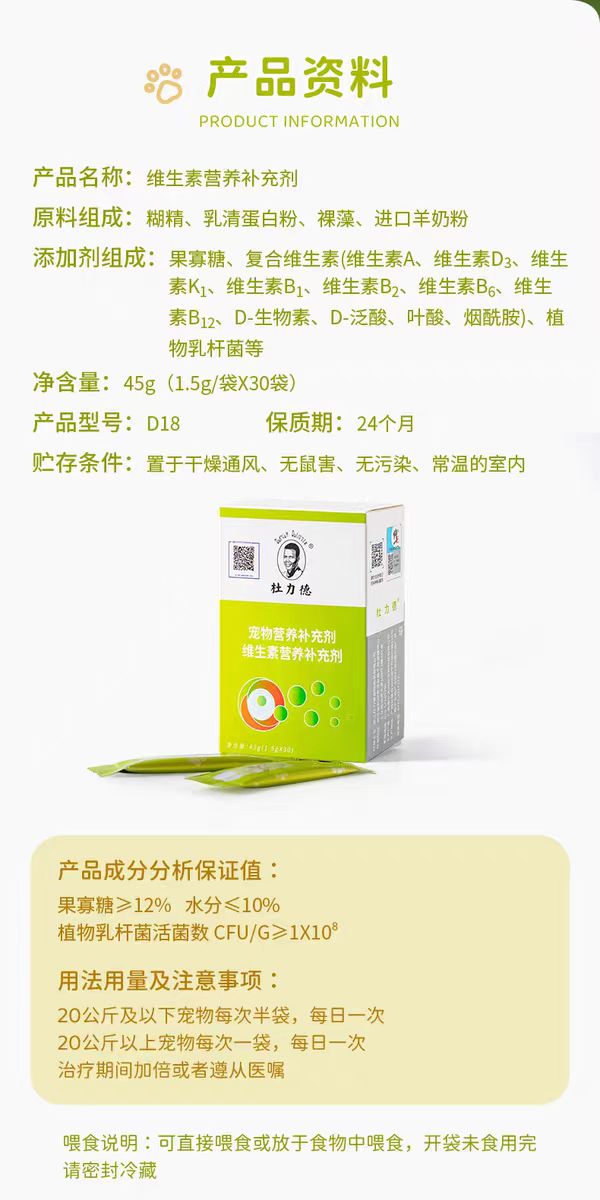 杜力德复合维生素营养补充剂 猫狗通用 1.5g*30条/盒
