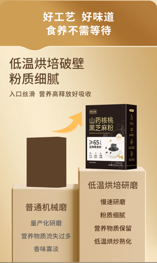怀生堂研发出品——山药核桃黑芝麻粉 精选原产地垆土铁棍山药、黑芝麻、核桃等营养成分。黑色复合谷物添加量≥65%,营养更丰富、口感更香醇。焕新升级,新配方,膳食营养伴侣。