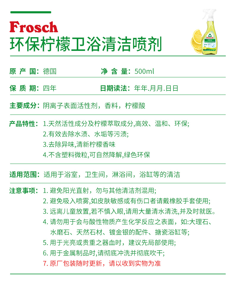500ml*2瓶 Frosch 柠檬卫浴清洁喷剂【伊藤优选302209】