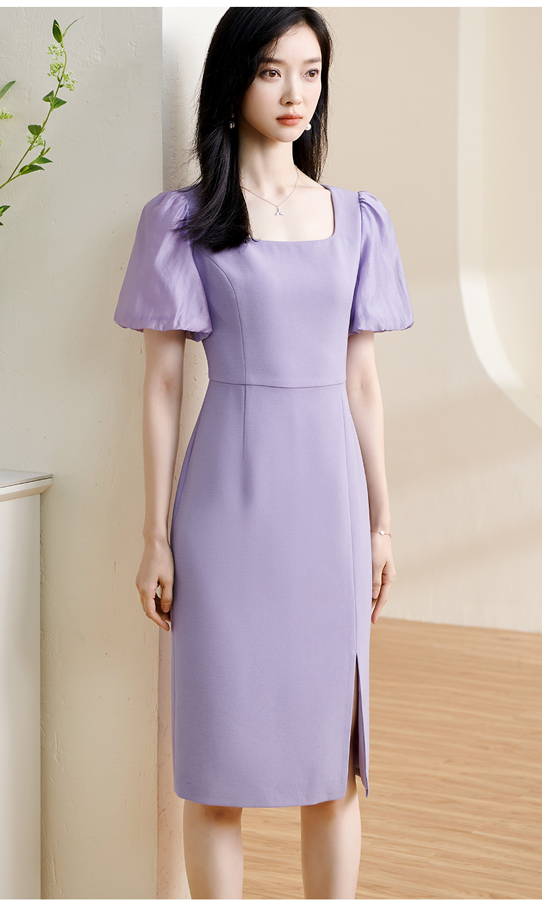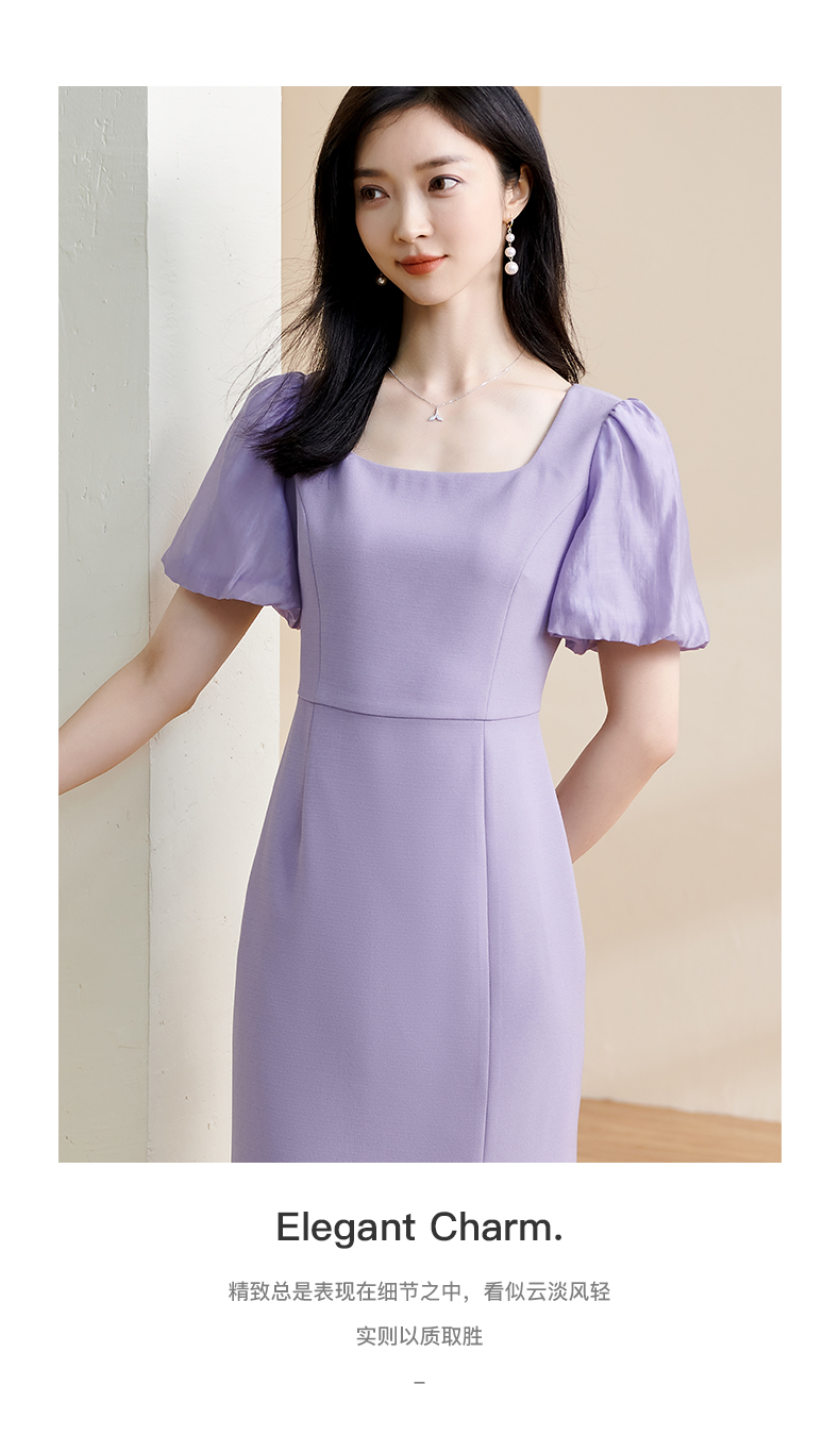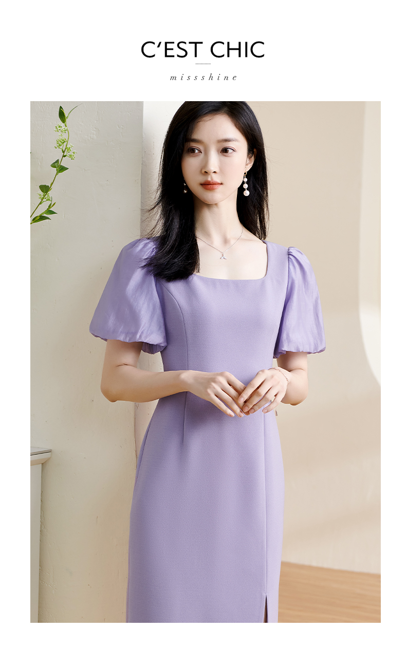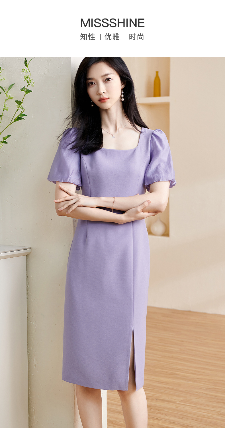 剩S 米思阳2024夏季新款温柔风修身紫色长裙方领法式连衣裙薄款女1234