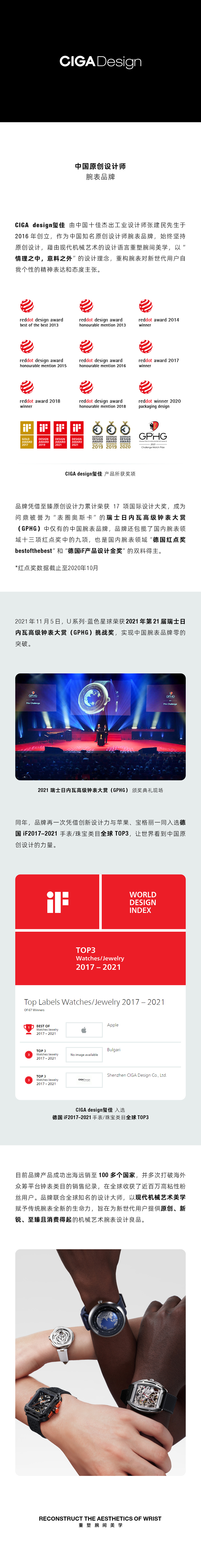 - 钟表界设计先锋,2021年荣获第19届瑞士日内瓦钟表大赏GPHG的中国品牌。秉持“设计成就非凡”理念,坚守原创,突破传统。