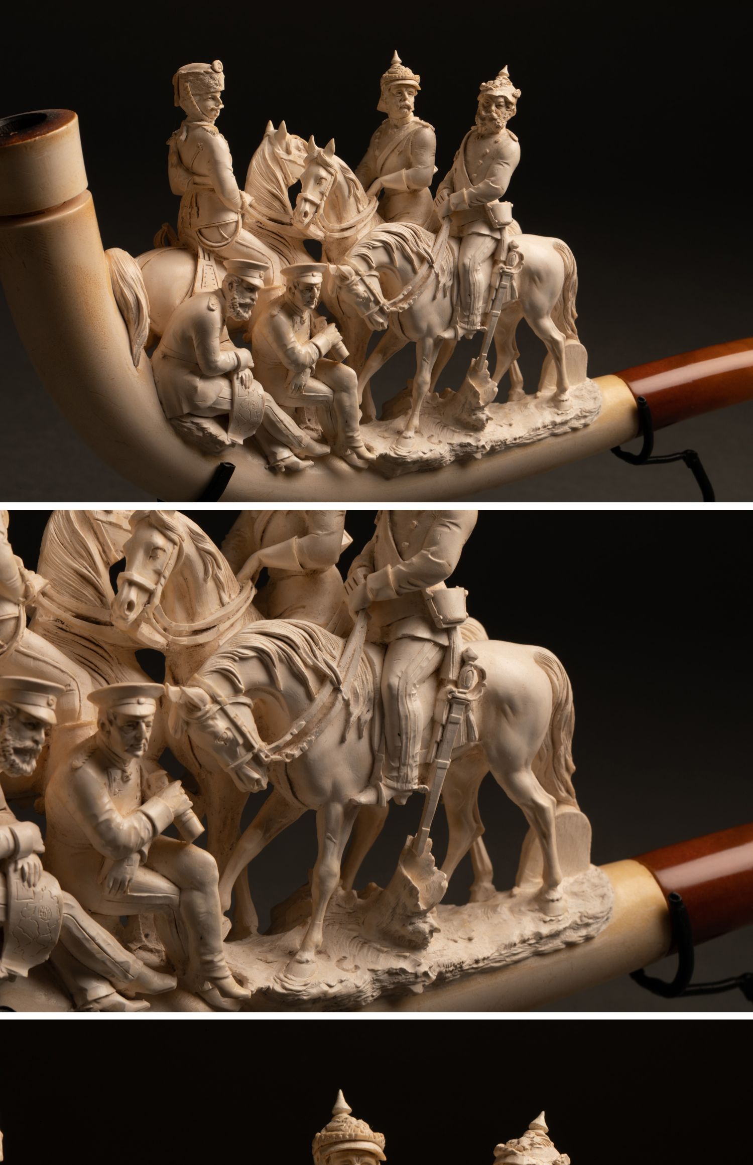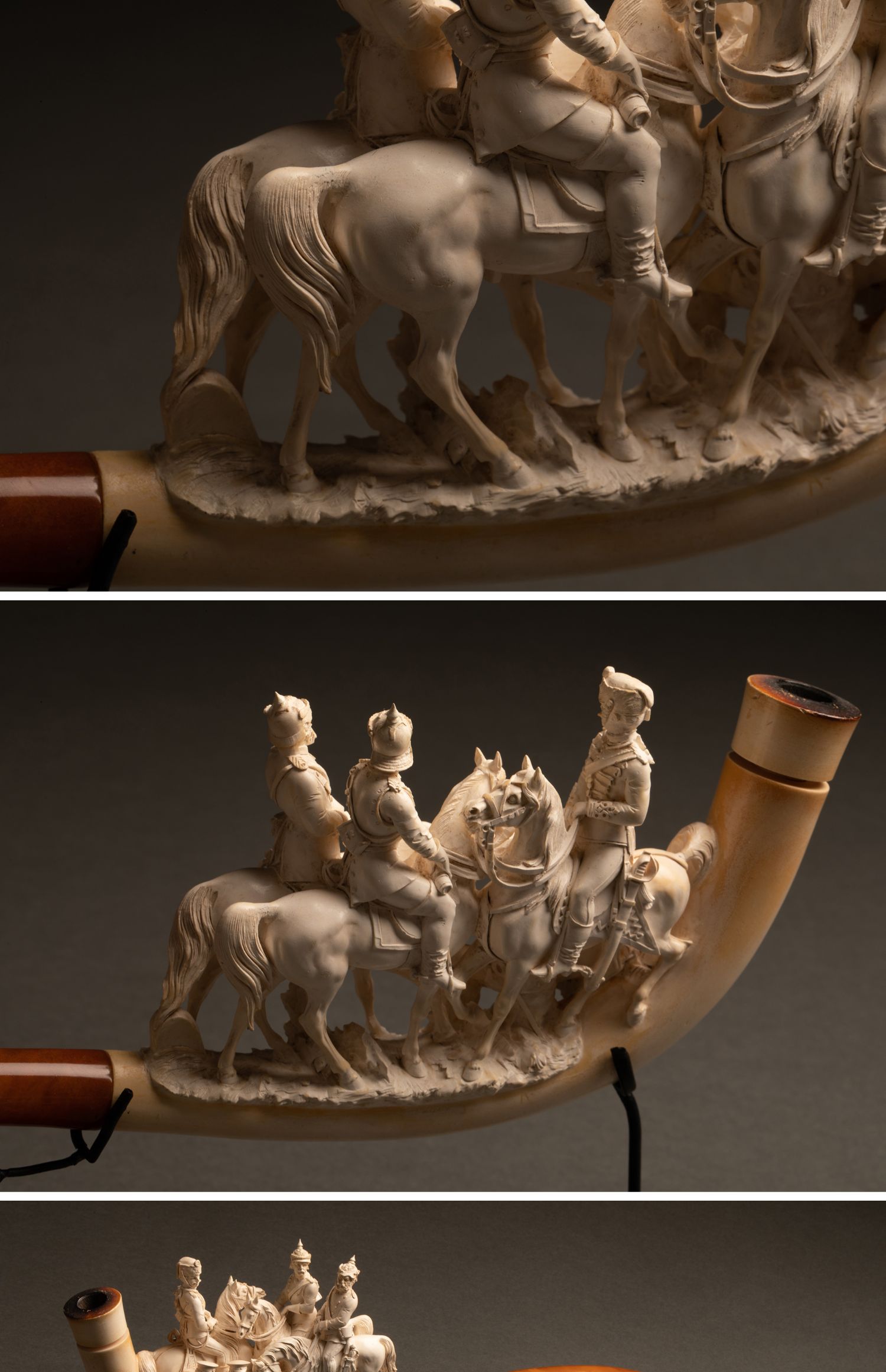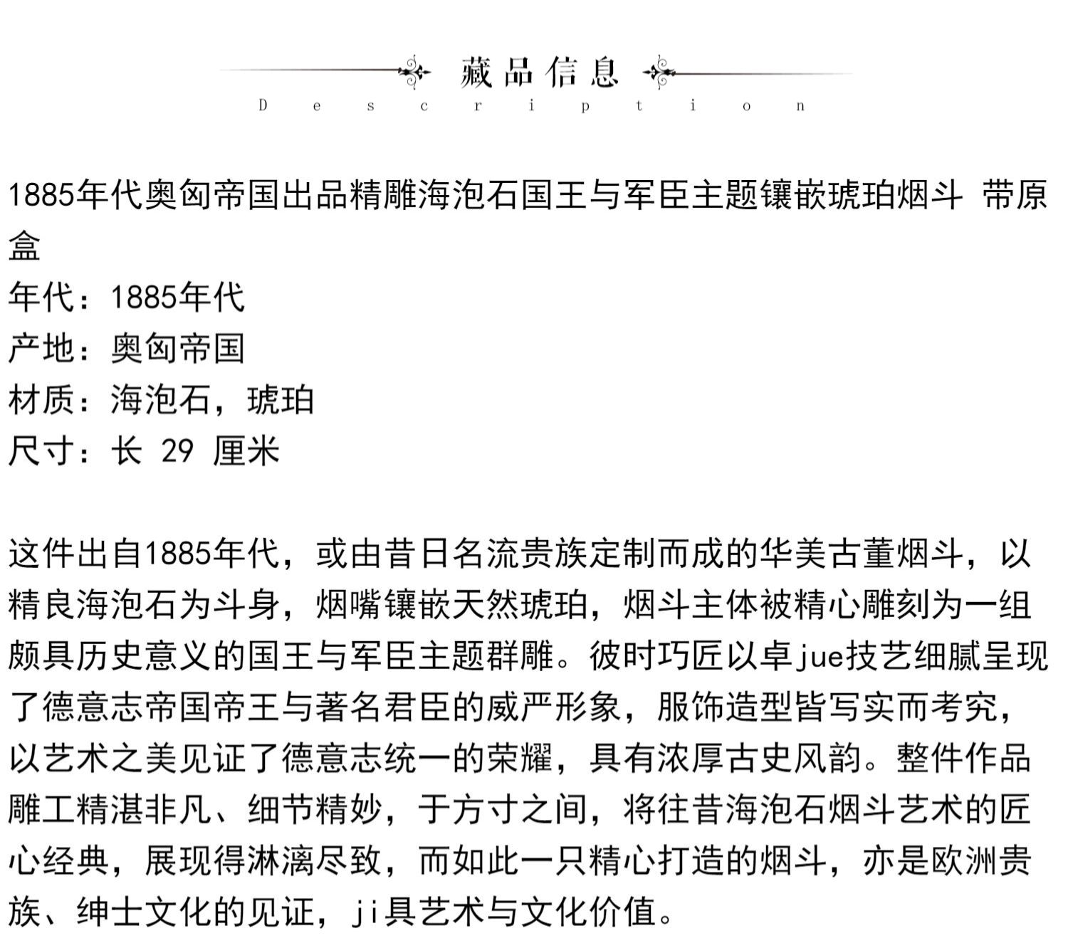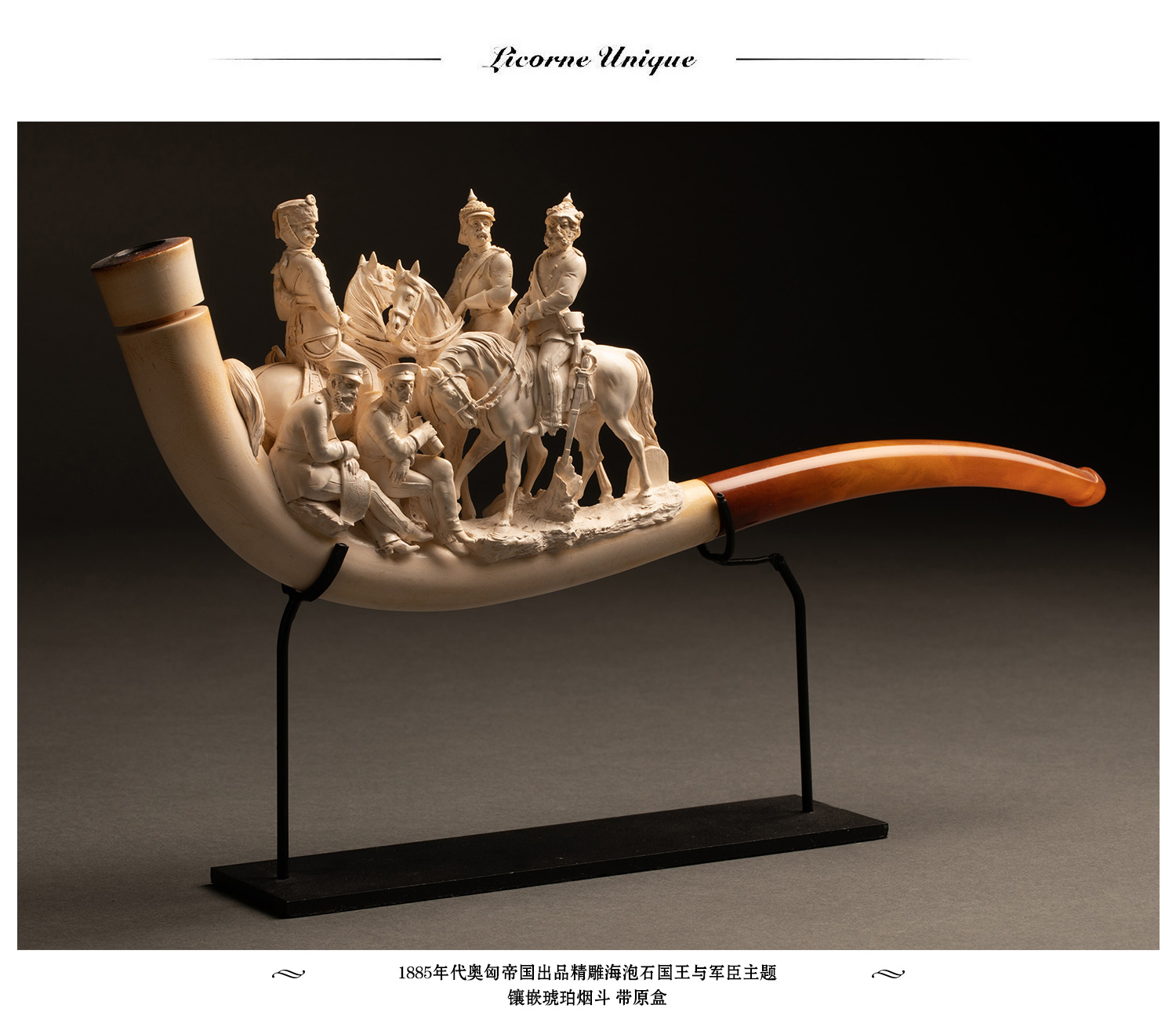 独角鹿西洋古董奥匈帝国精雕海泡石国王与军臣镶嵌琥珀烟斗带原盒