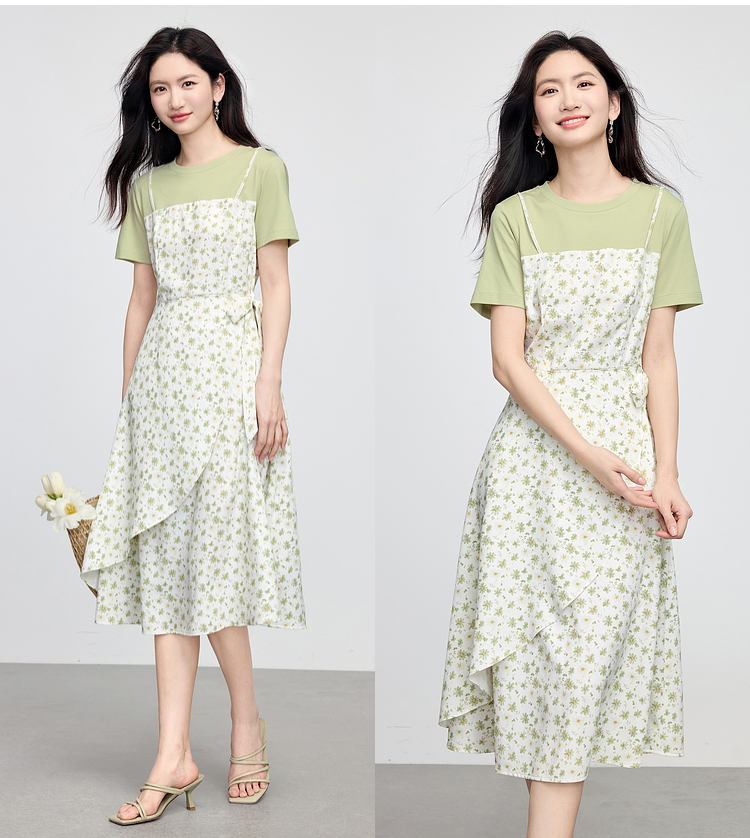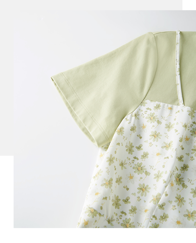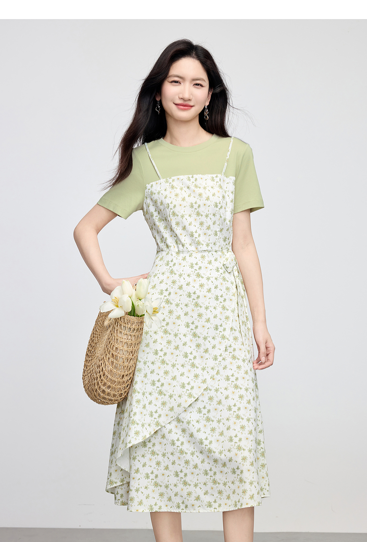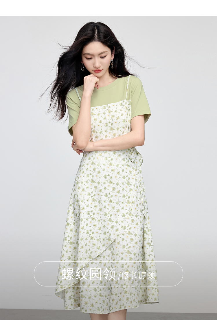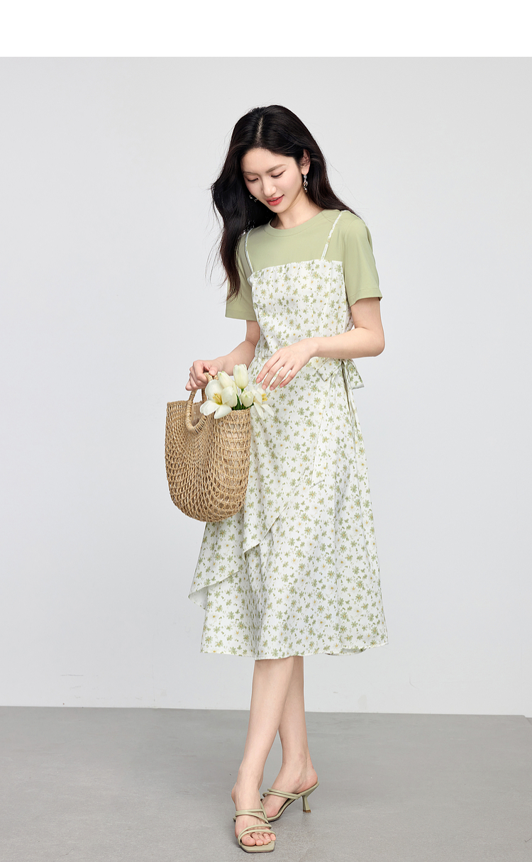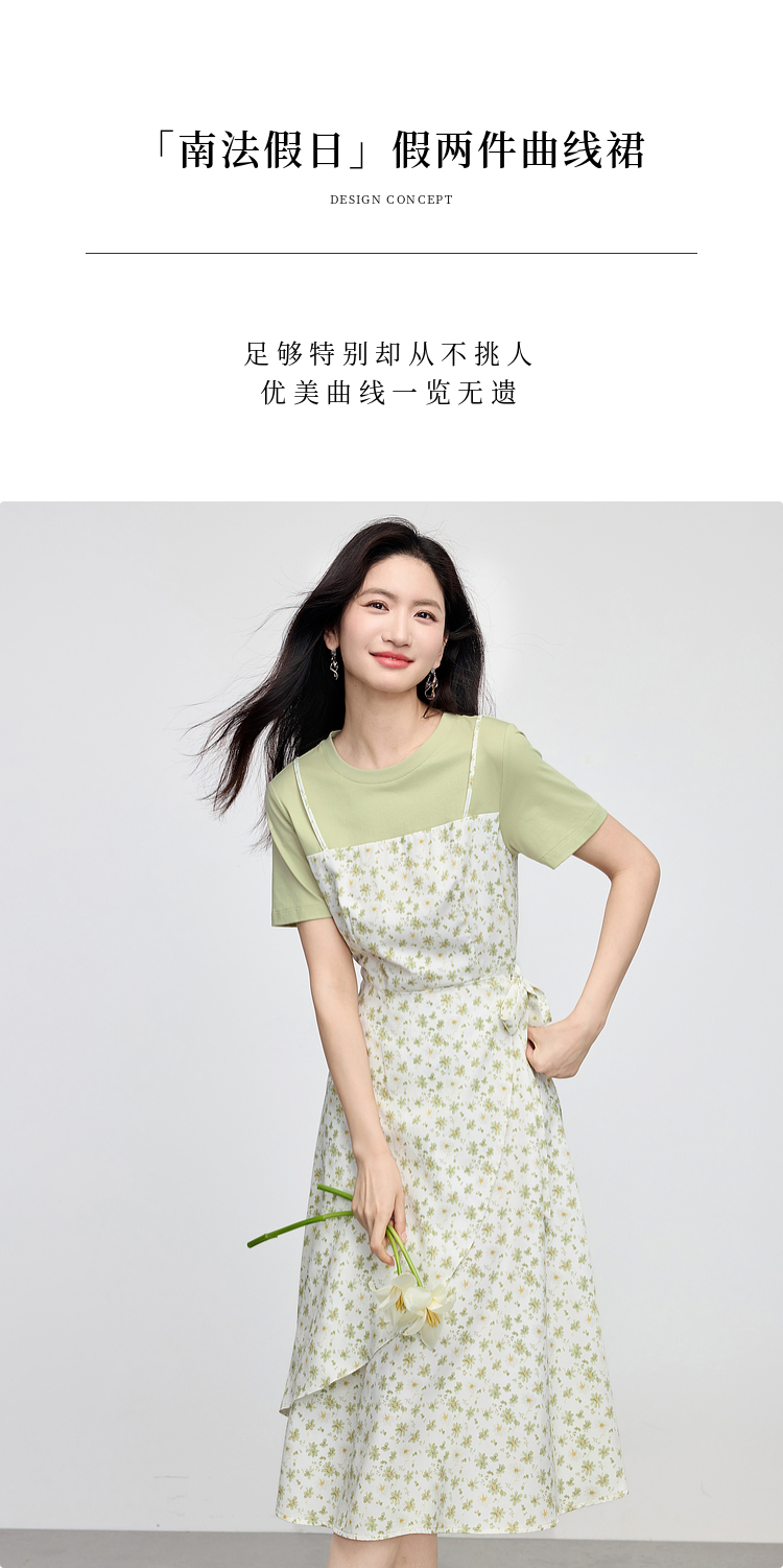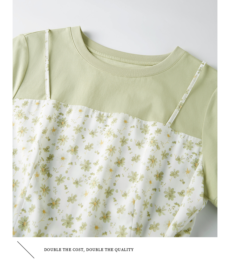 熙世界法式优雅假两件碎花连衣裙女设计感短袖T恤裙子2025夏新款