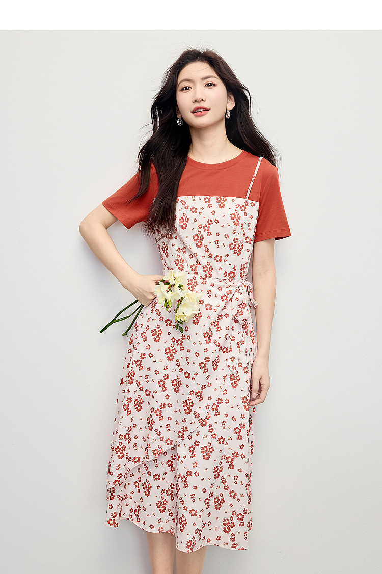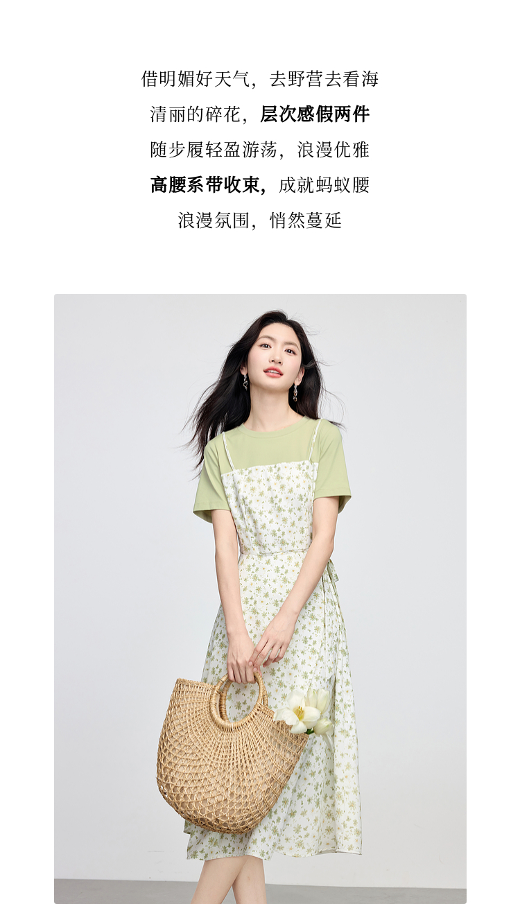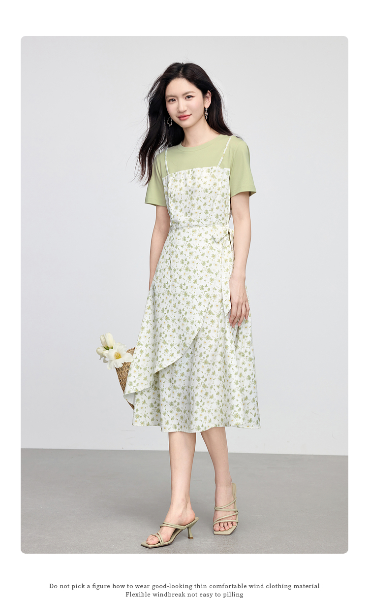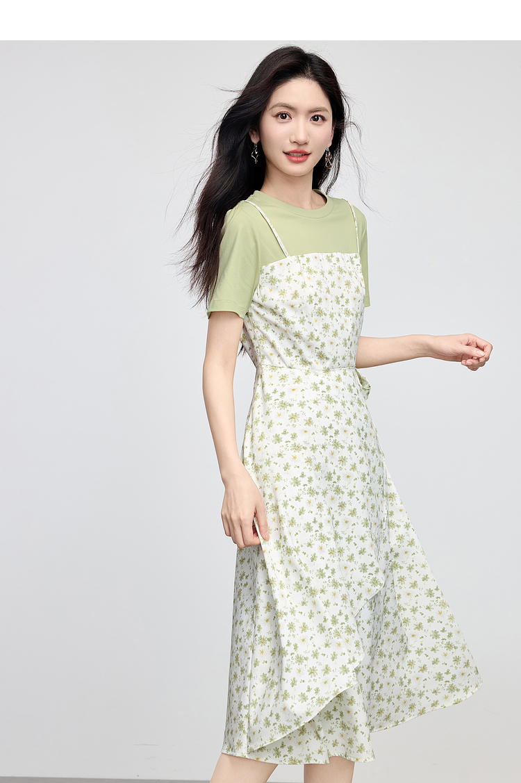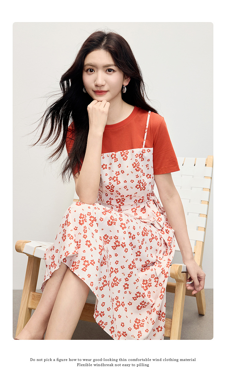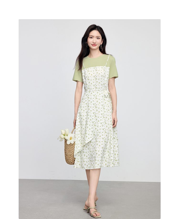 熙世界法式优雅假两件碎花连衣裙女设计感短袖T恤裙子2025夏新款