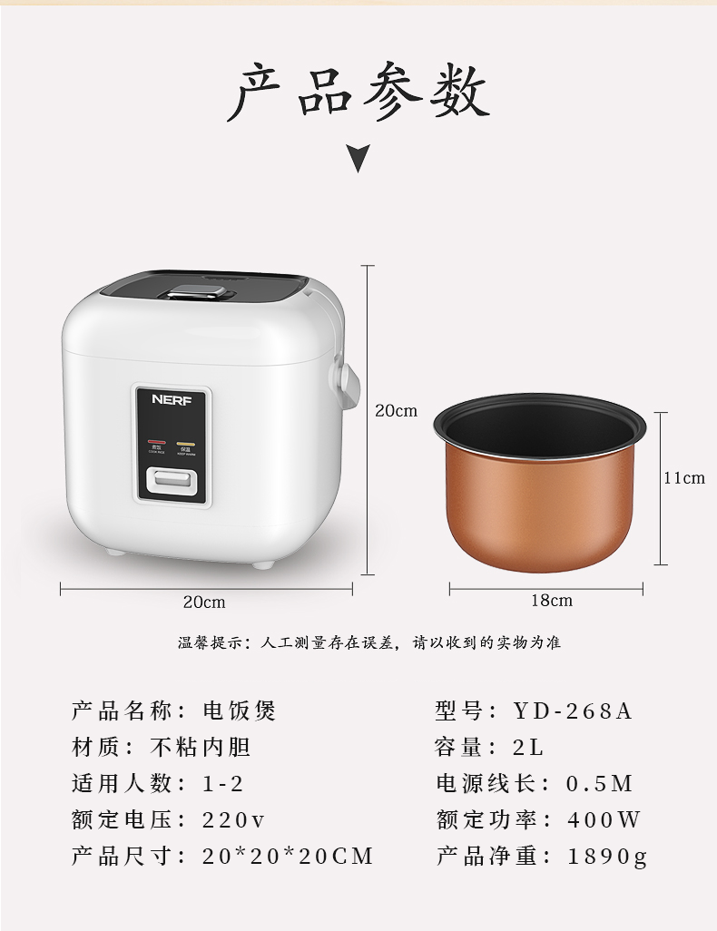 美国nerf拉尔弗电饭煲2L家用迷你电饭煲宿舍蒸饭锅YD-268A