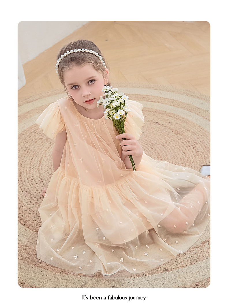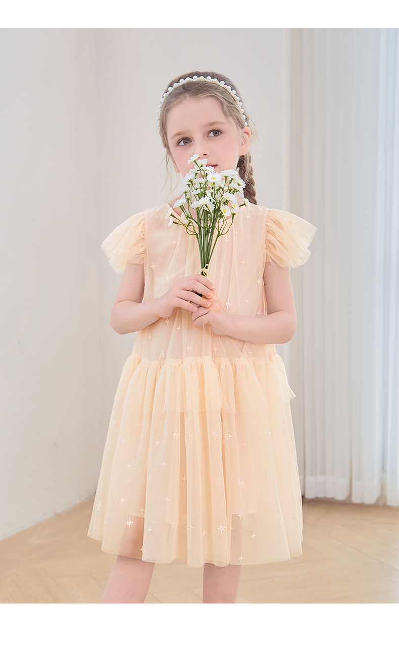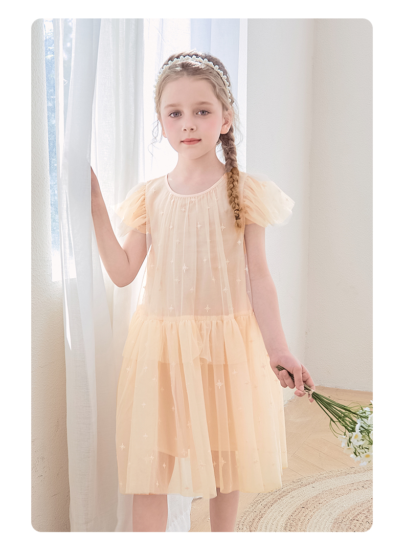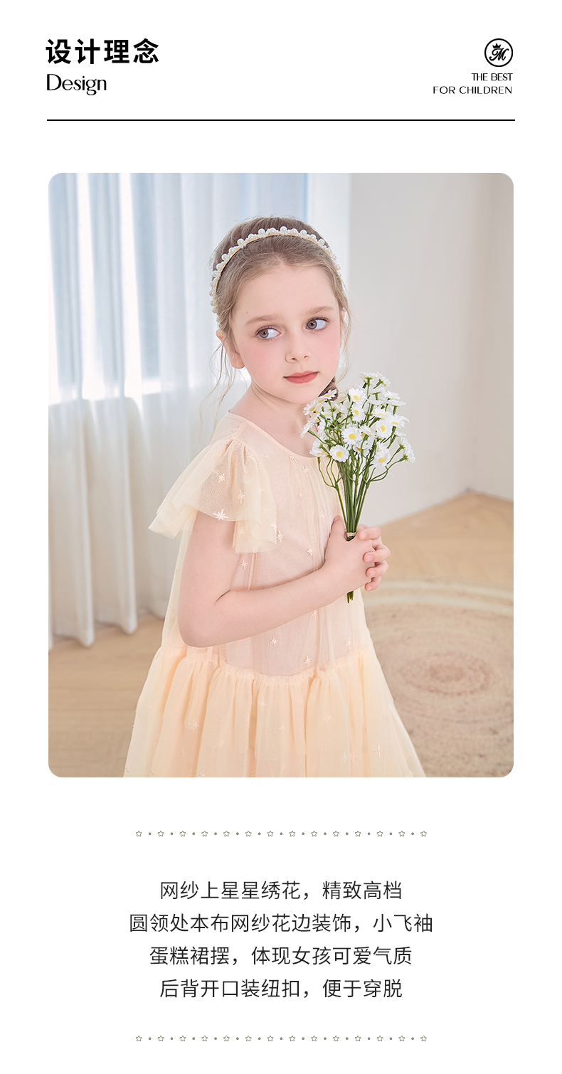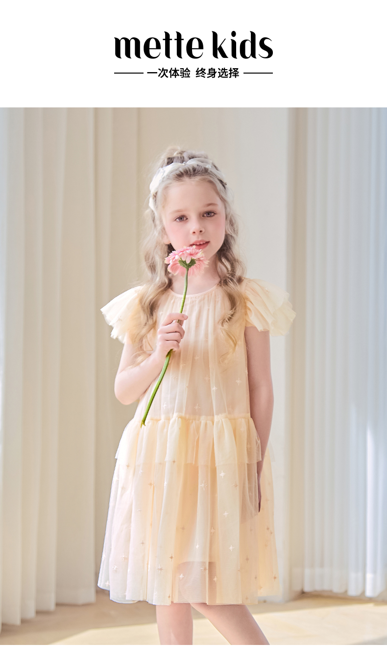 mettekids女童裙子2024夏季新款连衣裙米杏色儿童网纱绣花公主裙