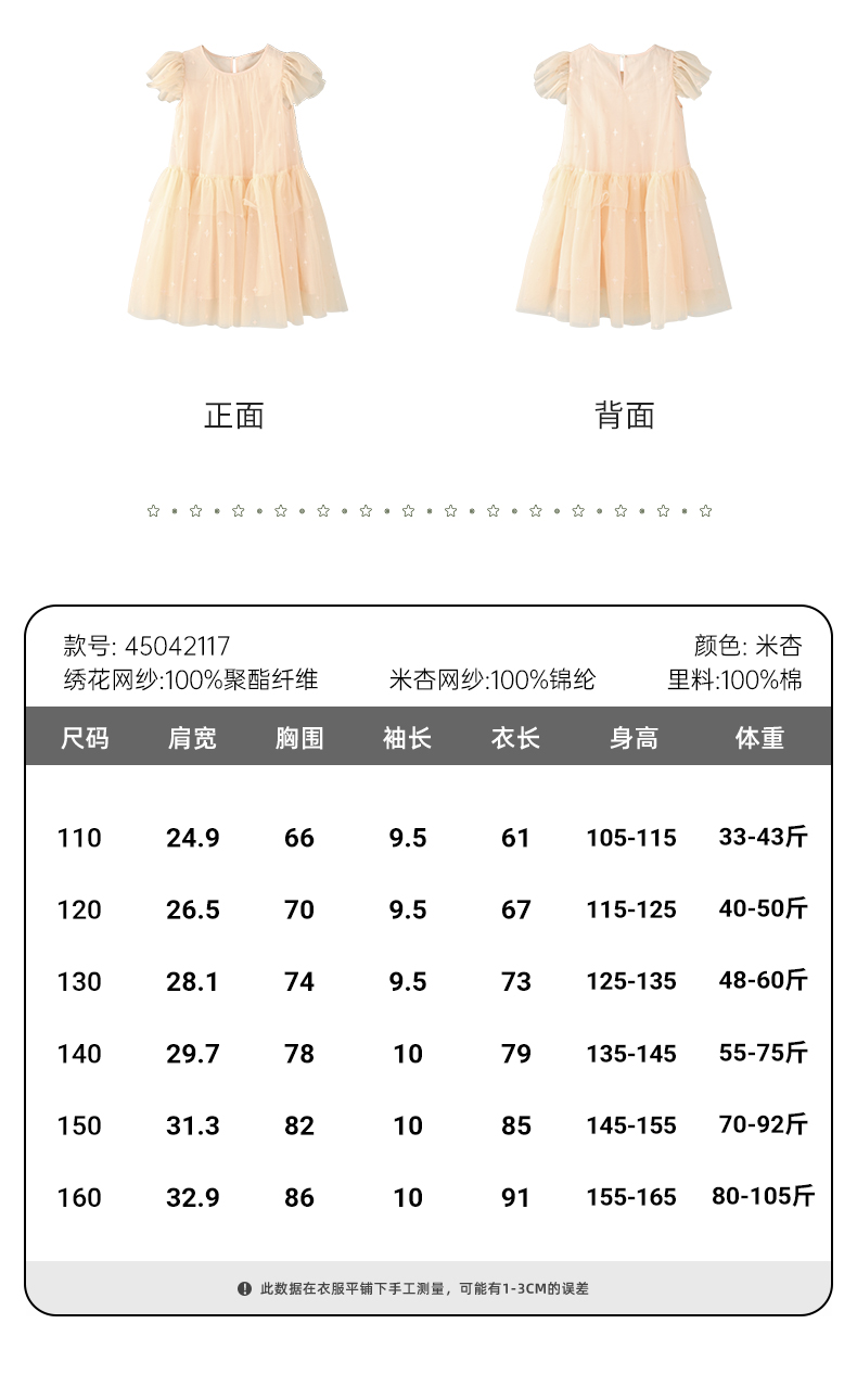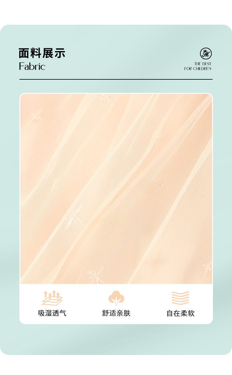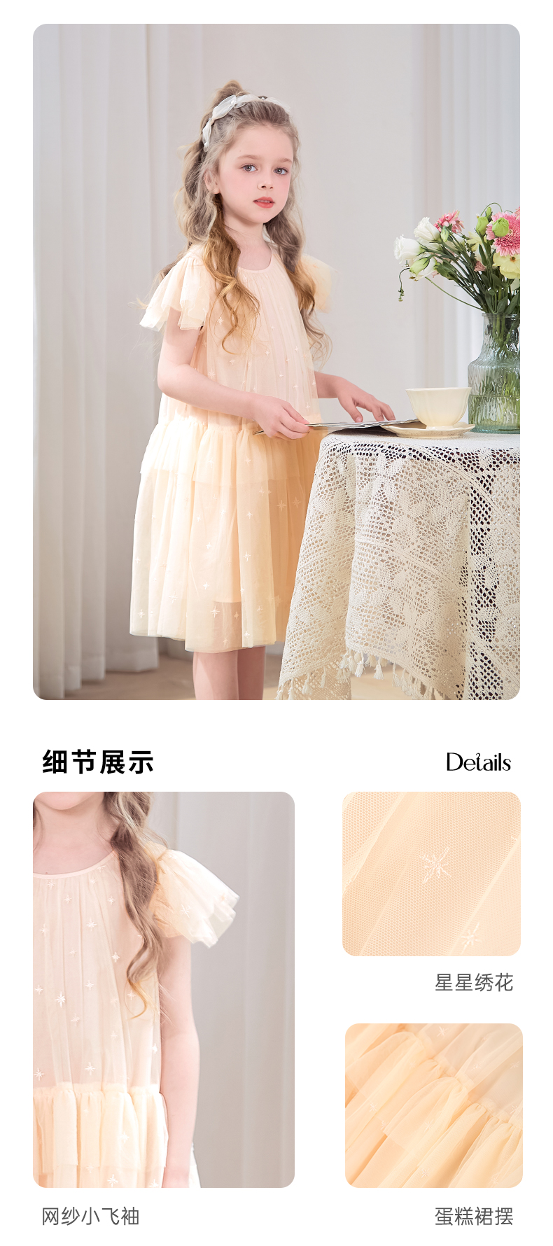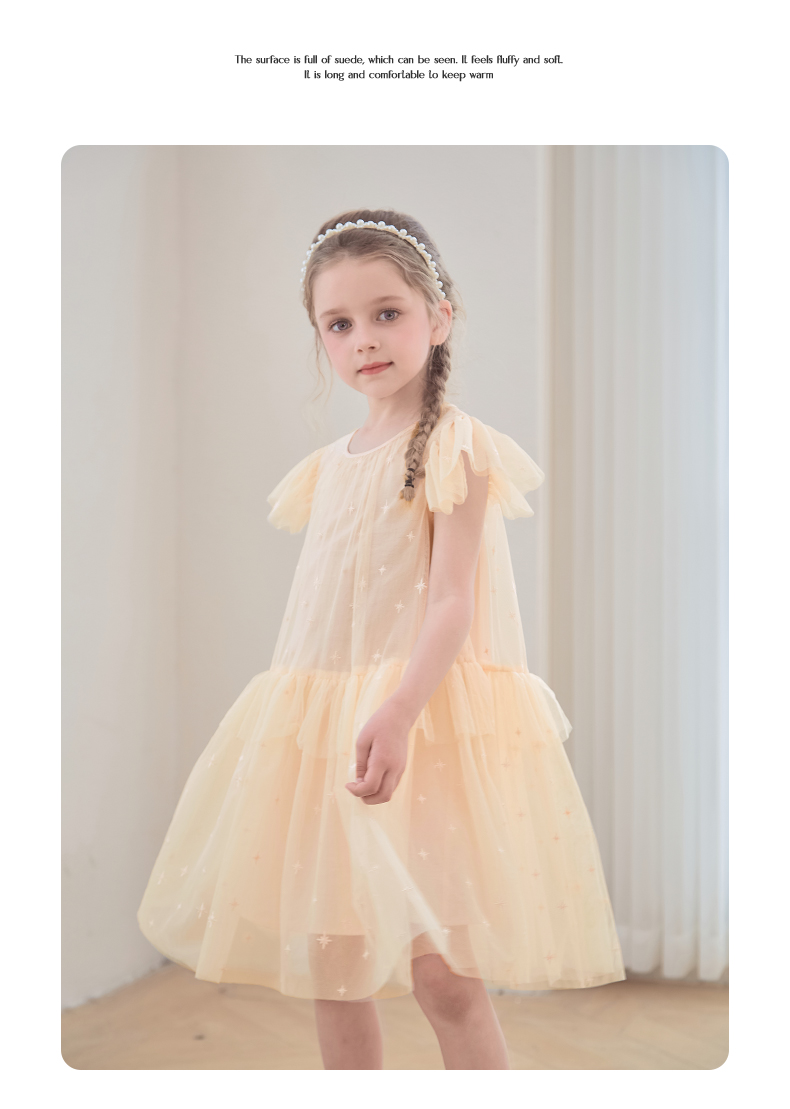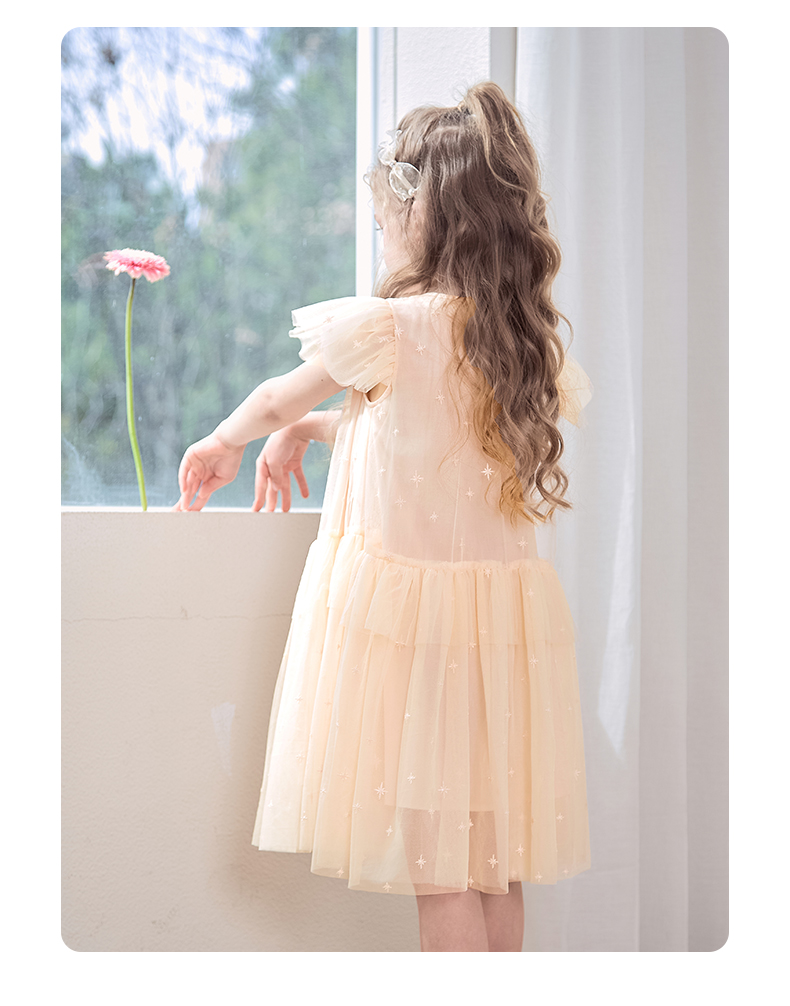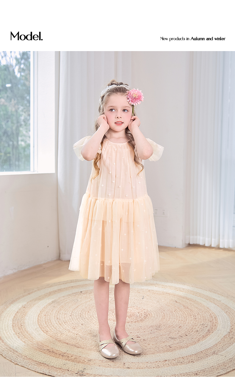 mettekids女童裙子2024夏季新款连衣裙米杏色儿童网纱绣花公主裙