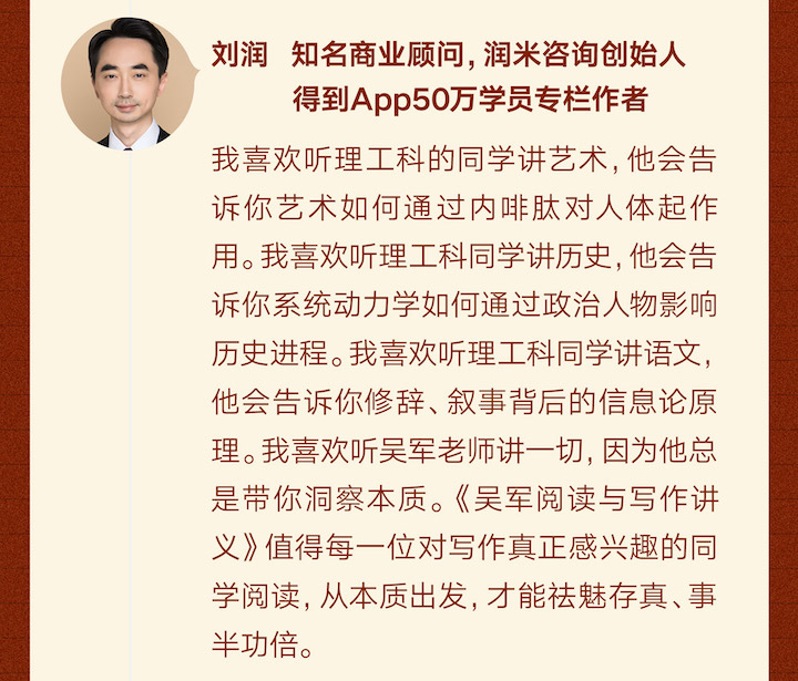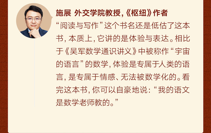 ● 在这本书中,吴军老师非常系统地拆解了如何提高自己的阅读、理解能力和写作、表达能力。一方面,他以自己工作和生活的经验为基础,总结了一套系统的理论和方法,让我们可以拿来就用;另一方面,他也带领我们走进古今中外的文学经典,与一位位会晤、共鸣,体会并学习他们如何用文字表达自我,同时也跟随吴军老师的解读,亲身体验何谓阅读。