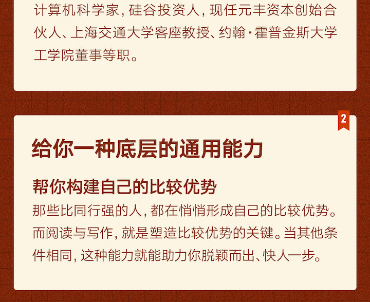 吴军博士作为一个投资人和计算机科学家,写的书虽然题材严肃,却能写得有趣、有料、有内容,且本本畅销;甚是他职业上的成功,也得益于优秀的阅读与写作能力。这本书就是他实践经验的总结。