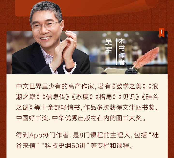 博士,知名自然语言处理和搜索专家,硅谷风险投资人。他的著作《数学之美》荣获国家图书馆第八届文津图书奖、第五届中华优秀出版物奖,《文明之光》被评为2014年“中国好书”,《浪潮之巅》荣获“蓝狮子2011年十大ji佳商业图书”奖。